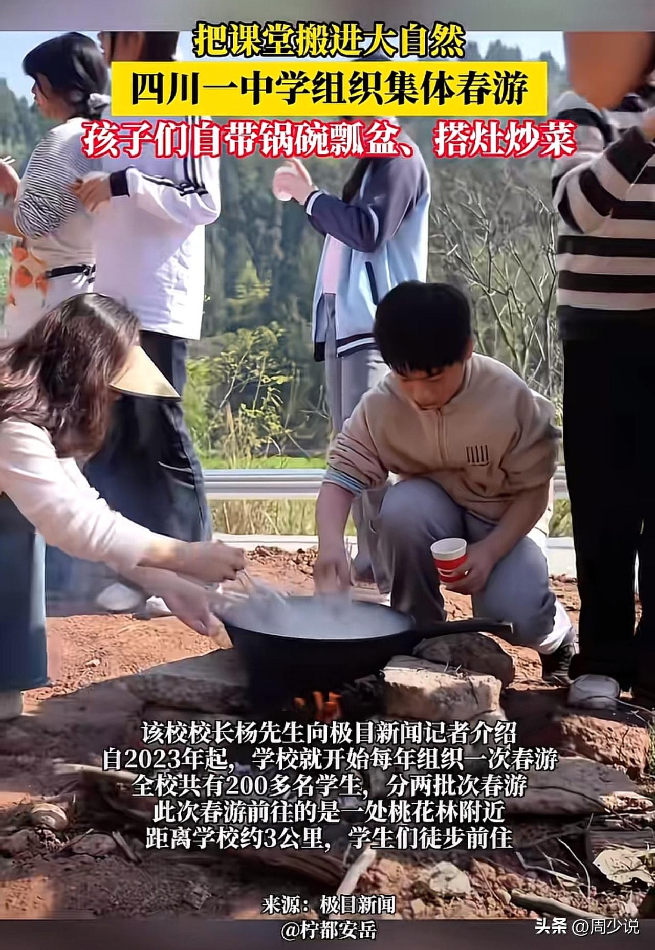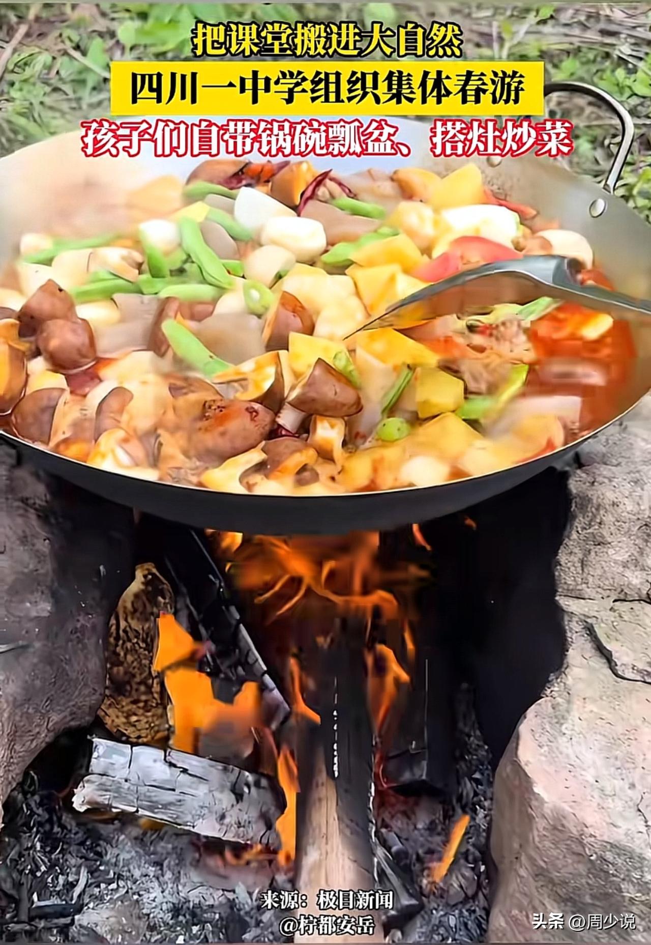 “全网称赞!”四川一学校组织几百名学生集体春游,孩子们自带锅碗瓢盆,搭灶炒菜,引