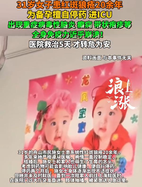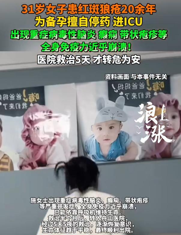 心也太大了!浙江舟山,女子患系统性红斑狼疮20余年,结婚后,女子和丈夫萌生了生孩子的想法,为了成功备孕,女子竟然擅自停药,结果这一下把自己送进了ICU,经过五天的救治,这才得以转危为安 施女士今年31岁。说起来她的病龄可不短,系统性红斑狼疮这毛病,她从十来岁就查出来了,到现在已经跟了她二十多年 这些年她一直挺听话的,医生说吃药就吃药,该复查就复查,病情控制得还算平稳。后来结了婚,两口子感情不错,自然就琢磨着要个孩子 备孕这事儿本来很正常,可施女士心里有个想法,她觉得吃着药就不能要孩子。也不知道是从哪儿听说的,反正她自己认定了这个理,得把药全停了,才能安安心心备孕 她说停就停,把吃了多年的药全都断了 刚开始那阵子,身体还真没什么反应。施女士还挺得意,觉得自己的判断没错。可日子一天天过去,她开始觉得浑身没劲儿,时不时低烧,关节也不舒服 按理说,老病号了,这些症状应该警惕。可她没有,就这么硬扛着,心想忍忍就过去了 后来她陪家里人去上海看病,在医院里突然人就晕倒了。不光晕倒,整个人剧烈抽搐,把周围的人吓得不轻。医院赶紧抢救,一查才知道,她的免疫系统已经快崩溃了,病毒性脑炎、癫痫、带状疱疹,一个接一个找上门 在上海抢救了半个月,人算是勉强保住了,但情况还是不乐观。后来转回舟山当地的医院,医生一看,人深度昏迷,随时可能脑疝,最后整整在ICU救治了5天,这才救了回来 对此,有网友说了一句话:既然自己有这种基因,尽量别再往下传了 那么问题来了,红斑狼疮患者能不能怀孕?能,但有个前提,必须在医生指导下,把病情控制到稳定状态,用对胎儿影响最小的药,全程由产科和风湿科一起盯着。擅自停药是最大的忌讳,病情反弹起来,比当初发病还要凶险 施女士这次算是捡回一条命,希望她能记住这个教训。至于备孕的事儿,还是先放一放吧,把身体养好比什么都强