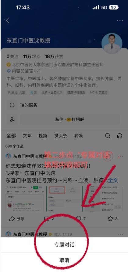 大家好,我是东直门中医教授沈洋,擅长治疗各种中晚期恶性肿瘤、肿块结节,尤擅脑癌、甲状腺癌、间皮瘤、宫颈癌、卵巢癌、肺癌、食管癌、胃肠癌、乳癌、肾癌、胸腹水、癌症复发转移的防治及疑难重症~ 最近私信很多,发现还有很多人不知道怎么找到我,大家可以按照下面图片进行操作 第一步:点我的头像进主页,点击→“TA的服务”,之后会出现专属对话; 第二步:点击“专属对话”,写下你现阶段的情况就可以了。 忙完我会一一回复大家~