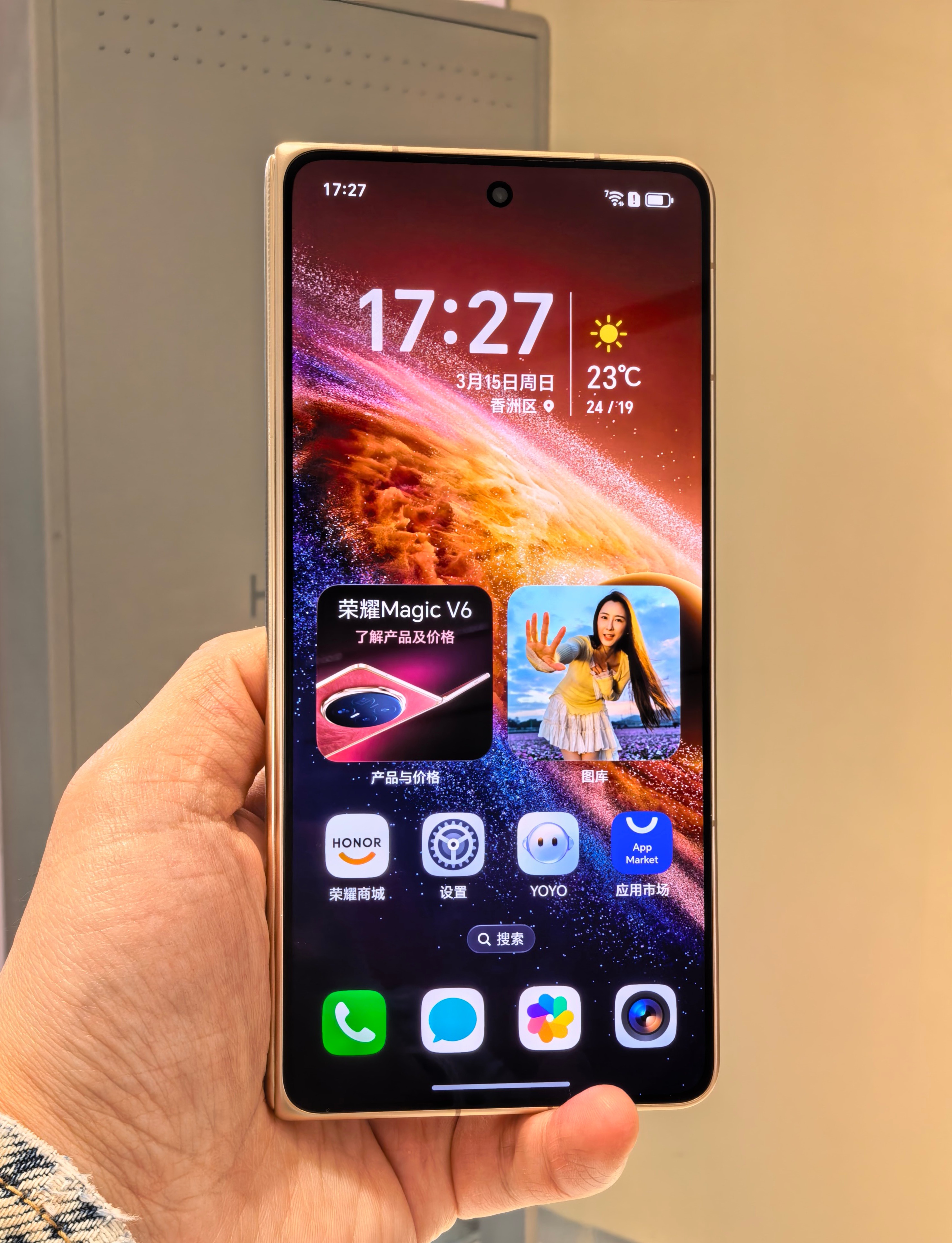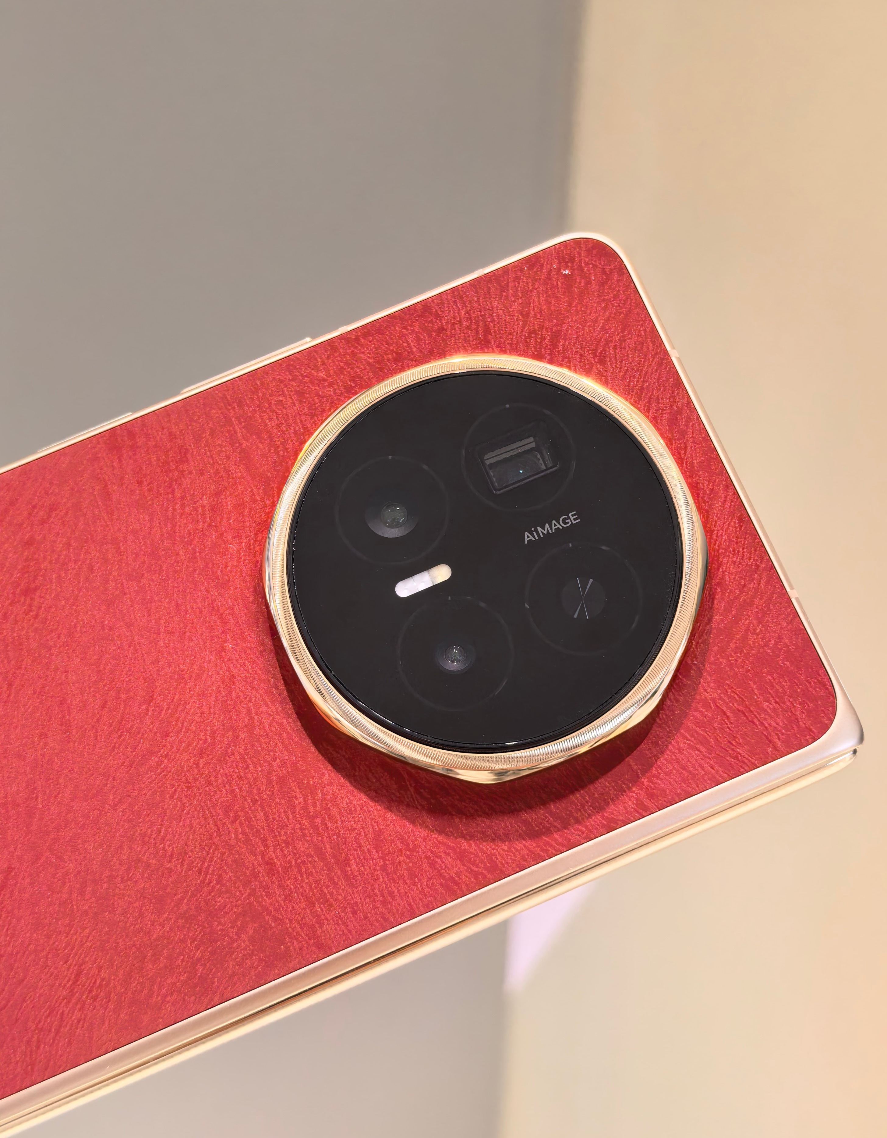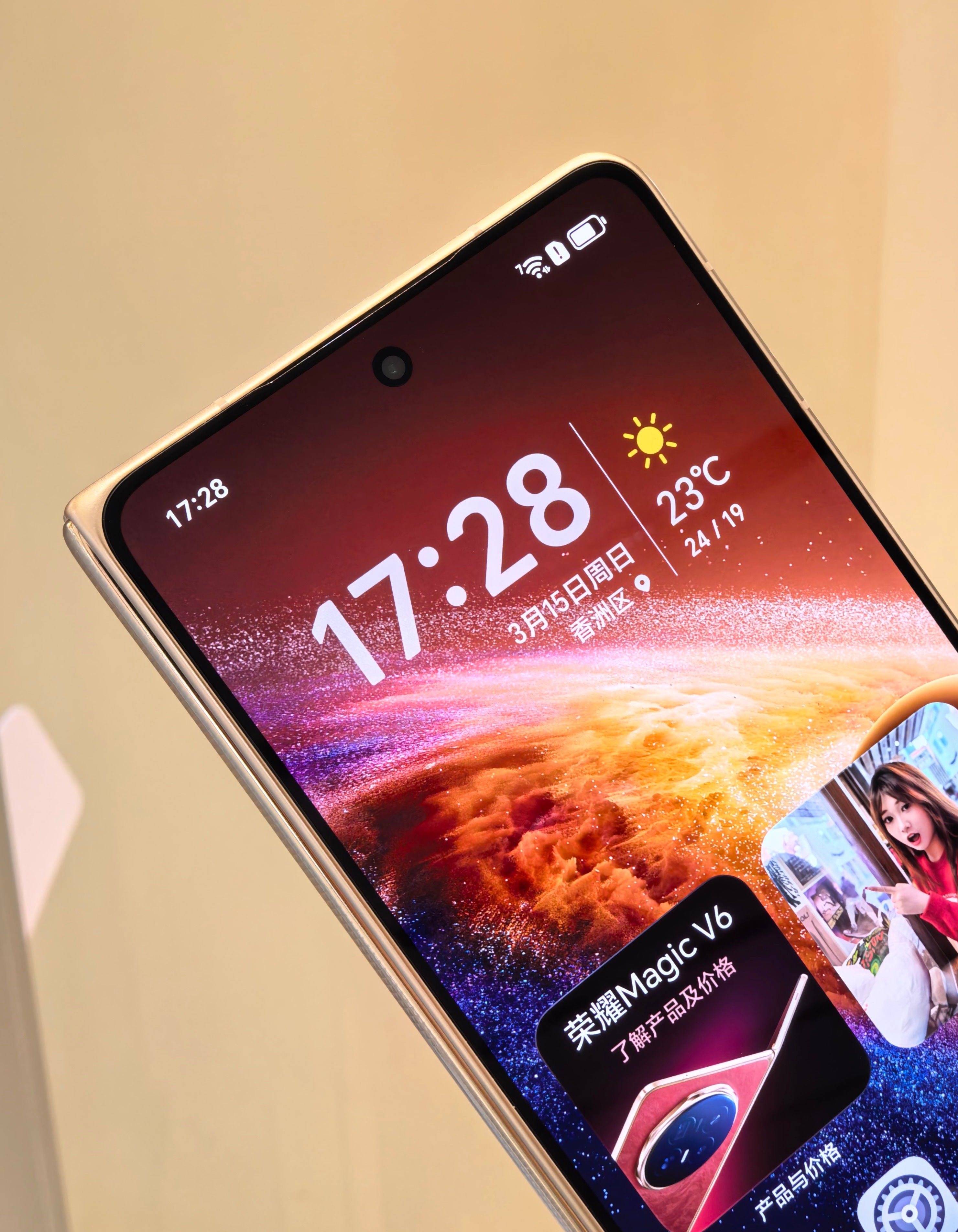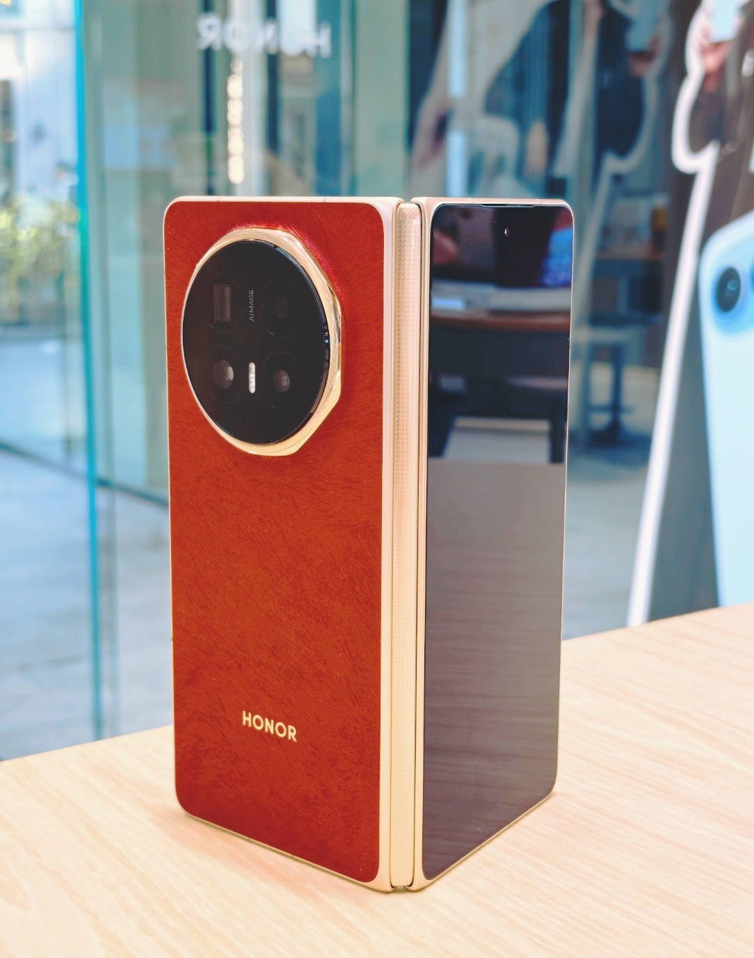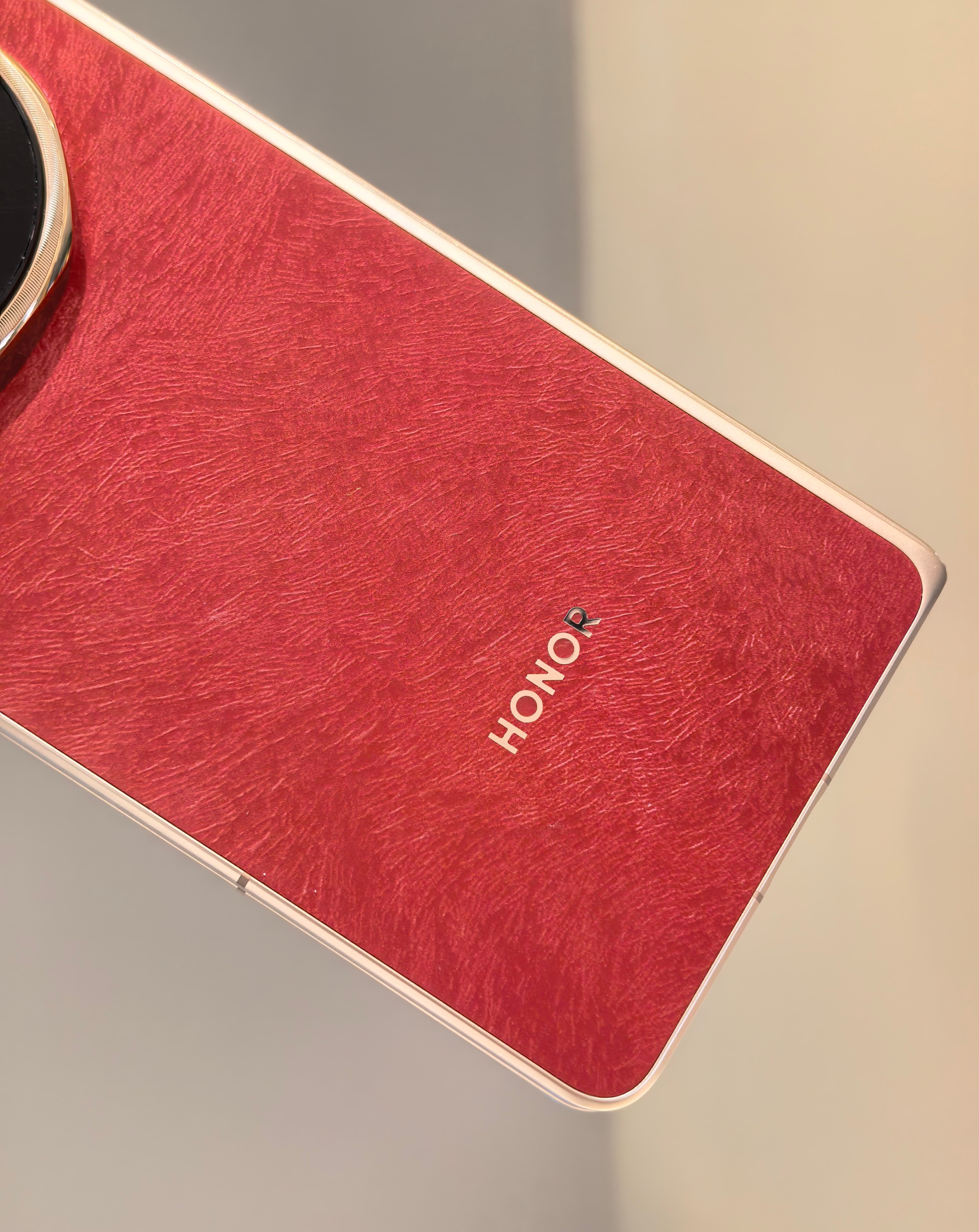 荣耀Magic V6赤兔红真机上手图:这个红色有点玫红的感觉,不是那种大红色,还挺典雅高级的感觉,皮质后盖的手感也挺细腻和舒服的。我去荣耀线下体验店的时候,导购朋友告诉我红色全部卖光了,严重缺货,其他颜色还有少量现货。这次荣耀Magic V6卖得这么火爆吗?感觉成了。