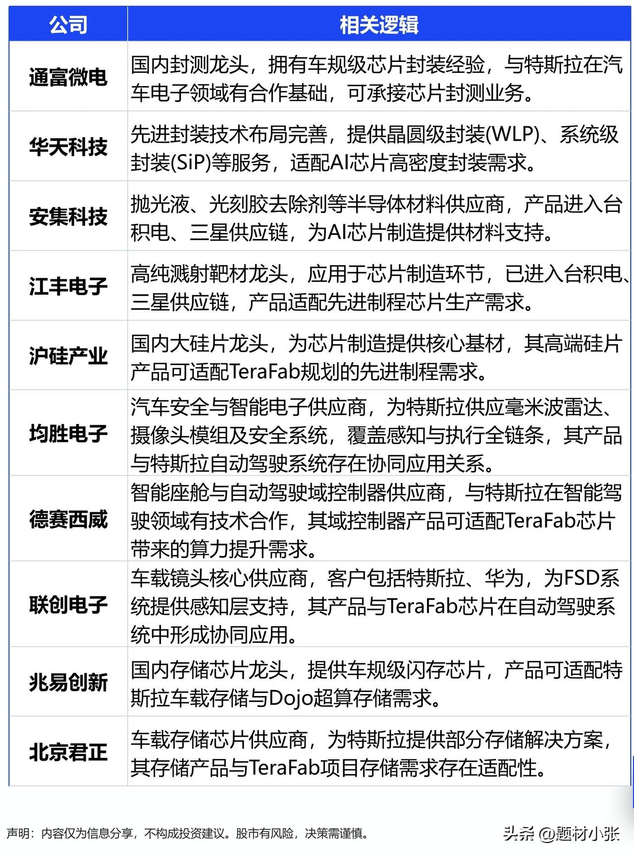 特斯拉AI芯片概念梳理! 项目TeraFab即将七天后启动!从Dojo超算PCB供应到先进制程设备、封装测试,再到车载感知与存储,国内产业链企业全面切入,世运电路、中微公司、长电科技等核心标的深度受益,AI算力与自动驾驶协同升级,国产半导体迎来新机遇。 内容仅为信息分享,不构成投资建议。股市有风险,决策需谨慎。