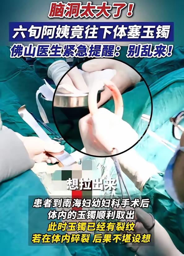 脑洞大开!广东佛山,一名65岁阿姨因为“阴道异物”去医院检查,结果医生检查时发现,里面竟然有一个玉镯,原来,阿姨此前把玉镯当成了子宫托,结果拿不出来了 广东佛山的这家医院,B超室里突然陷入一种诡异的安静。几个医生围着屏幕,谁也不敢先开口。画面上那个东西太清楚了,一个标准的圆环,稳稳当当地卡在65岁冯阿姨的身体深处。不是肿瘤,不是结石,是一只翡翠玉镯。冯阿姨神色淡定,不紧不慢地说道:“这镯子放在里面已有好些年了。原本打算过两日取出,奈何琐事缠身,竟忘却了,倒也没觉出有何不适。”" 事情得从20年前说起。冯阿姨早在那时便患上子宫脱垂之症,多年来,一直依靠铜质子宫托维持生活。这小小的子宫托,承载着她与病痛漫长对抗的坚韧。然而,那物件着实繁琐,每日都需取出加以清洗,她对此不胜其烦,觉得这实在是一桩恼人的事。 某天下午她盯着电视柜上的翡翠镯子,突然灵光一闪:这东西又圆又滑,跟子宫托不是一个形状吗?玉石多干净啊,塞进去肯定没问题。就这么着,传家宝改了行,从手腕搬家到了体内。冯阿姨起初计划过几日便将其取出,忙碌间竟真把此事抛诸脑后。这一忘,就是好几年。直到最近她尿不出来了,实在扛不住才上医院。 手术台上的气氛紧绷得像根琴弦。主刀医生握着手术钳,手都不敢抖一下。因为那只玉镯表面已经爬满了细密的裂纹,随时可能碎掉。要是在体内碎成尖锐的小片,哪怕一个碴子都能把组织扎穿,后果不堪设想。器械护士全神贯注,一只眼紧紧锁定心跳监测仪,目光分毫未移;另一只眼则时刻留意着钳尖,不敢有丝毫懈怠。整个手术室的人都屏住了呼吸,直到那只镯子完整落进托盘里,大家才算松了口气。 这镯子算是彻底"退休"了,医生强制扣押,再也回不去了。这种土办法在民间真不稀奇。有人暗访过街坊诊所,发现老人拿塑料圈、发卡、甚至硬币往身体里塞的案例不少。她们觉得都是个圈儿,能顶住就行。专家王磊看着片子直摇头:"身体又不是杂货铺的抽屉,哪能什么零件都往里码?" 人体可不是机械装置。异物塞进去容易,时间一长,周围的组织会增生、包裹,把东西咬得死死的。老年人身体修复能力差,这种增生更顽固。医疗级的子宫托是按人体结构设计的,材质、弹性、表面处理都有讲究。一只装饰用的玉镯,再值钱也不具备医疗功能。 冯阿姨这次惊魂过后,女儿翻箱倒柜才找出母亲藏了多年的病历本。她塞入的,哪里是一只玉镯,分明是被病耻感重重禁锢的求救信号。那信号在心底挣扎,渴望被人听见,却又被病耻的枷锁紧紧束缚。妇科病在老一辈眼里是见不得人的事,她们宁可自己瞎折腾,也不愿跟外人提。从"羞于启齿"到"自作聪明",中间隔着的是沉默的代价。 做儿女的,别等到出了大事才后悔。主动问一句,可能就是生死之别。还有多少"玉镯",正藏在羞耻与遗忘的夹缝里?