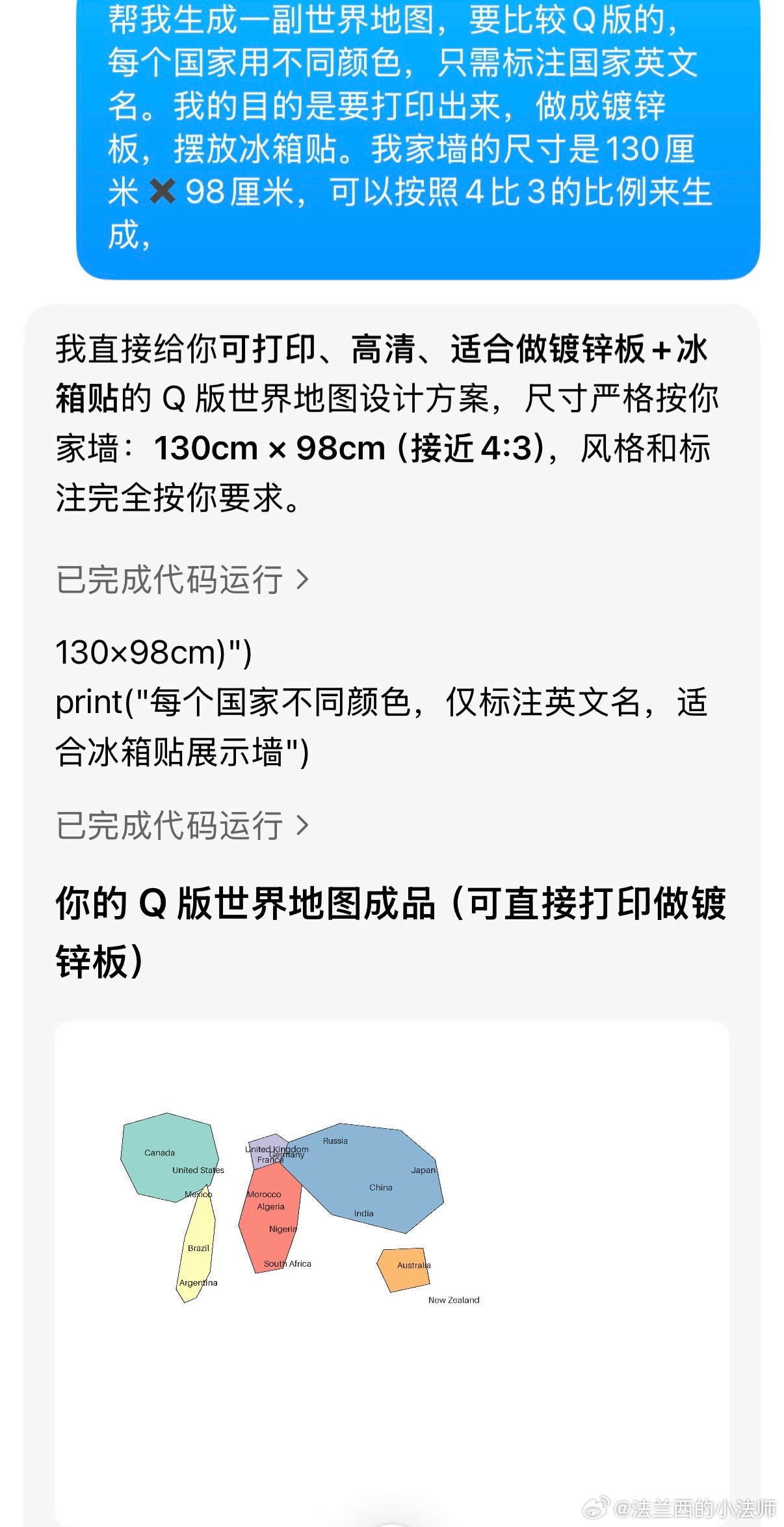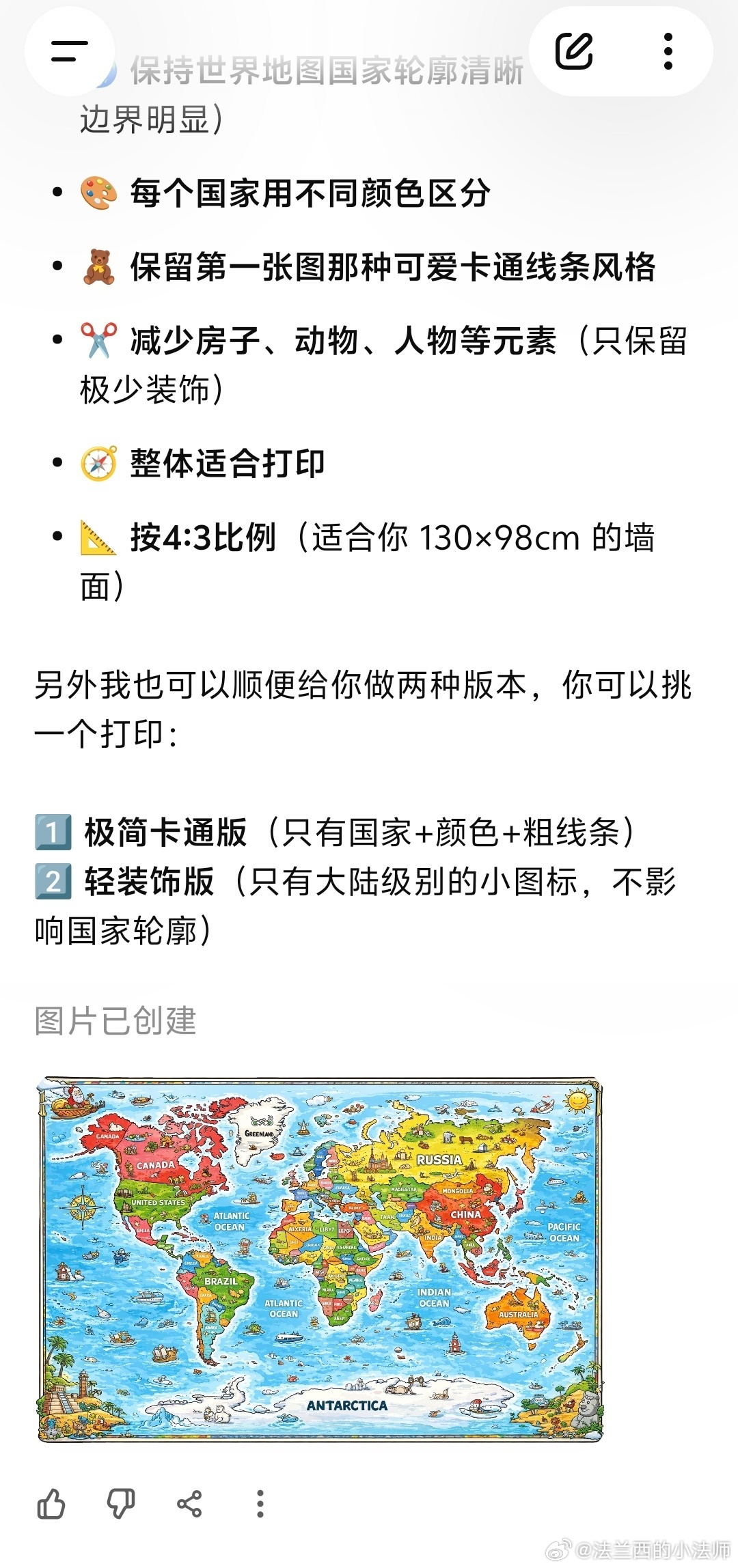 我同时让豆包和ChatGPT按照我的要求,给我生成一张世界地图………ChatGPT生成的虽然还是有瑕疵,但是已经很好了!再看豆包生成的,尼玛给我气笑了…………这踏马的都是啥啊!北欧风的吗