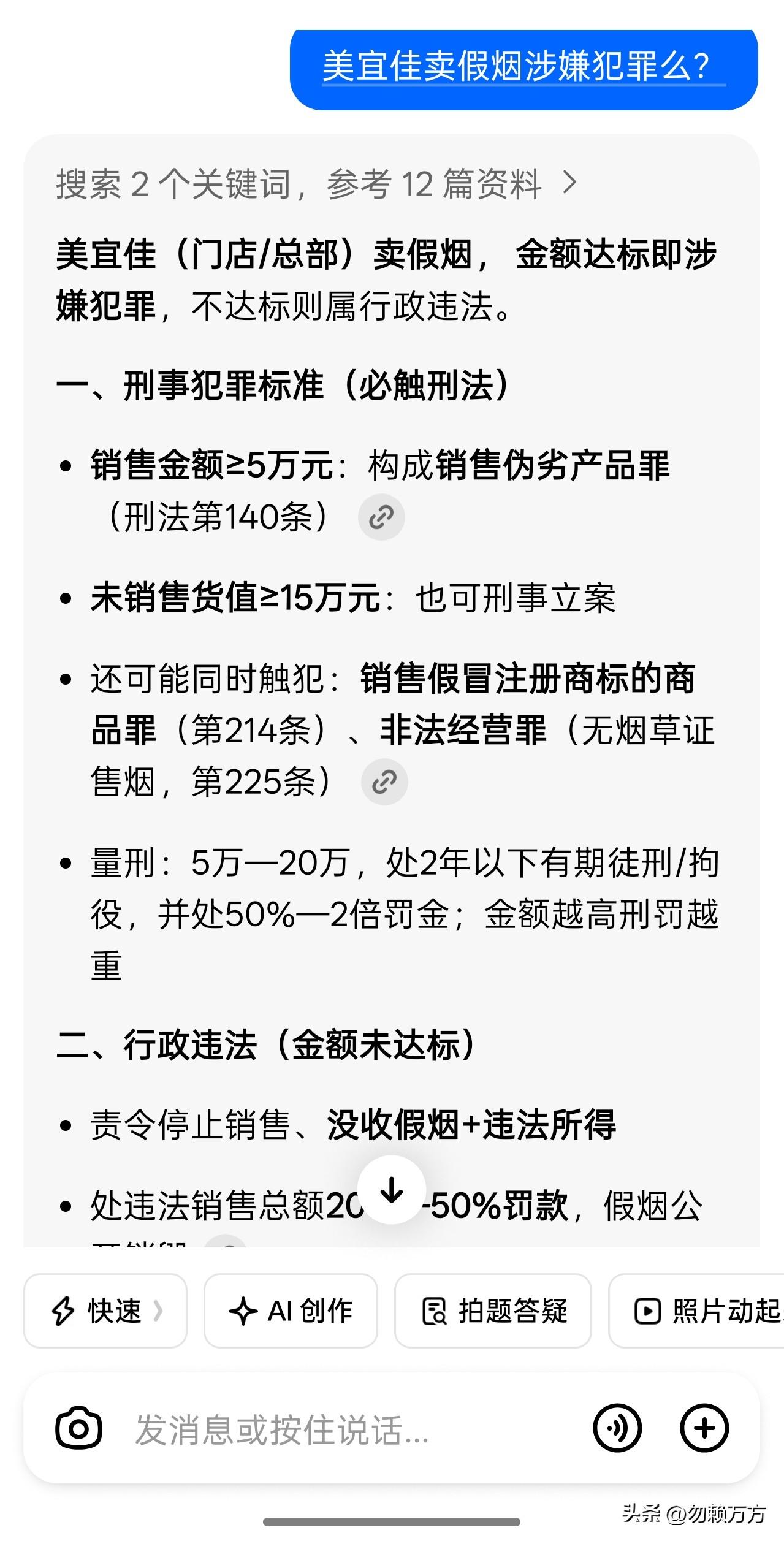 美宜佳因为多地门店销售假烟而被约谈,广东烟草专卖局称已查获假烟将近140万支。 按我的理解,“约谈”是企业有违规但还不太严重而采取的行政措施,目的治病救人,教育为主。但是根据豆包的解释,售假5万元以上就构成犯罪了,也就是说一个门店一天能卖一条假烟,一年下来也够判刑了。何至于只是约谈,还需要谈什么?自家整改就可以了?[笑哭]兜售假烟