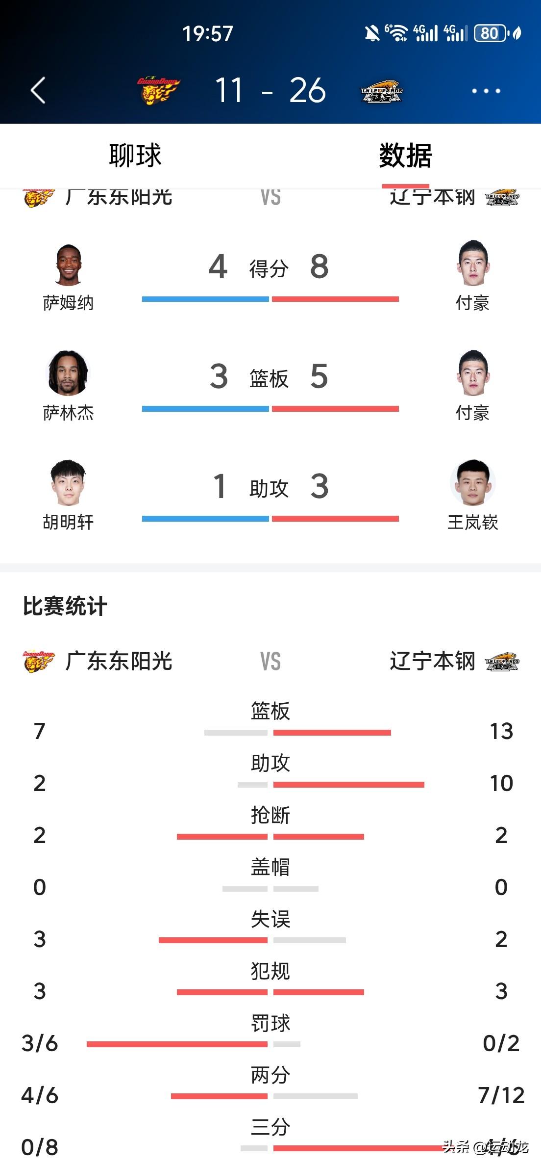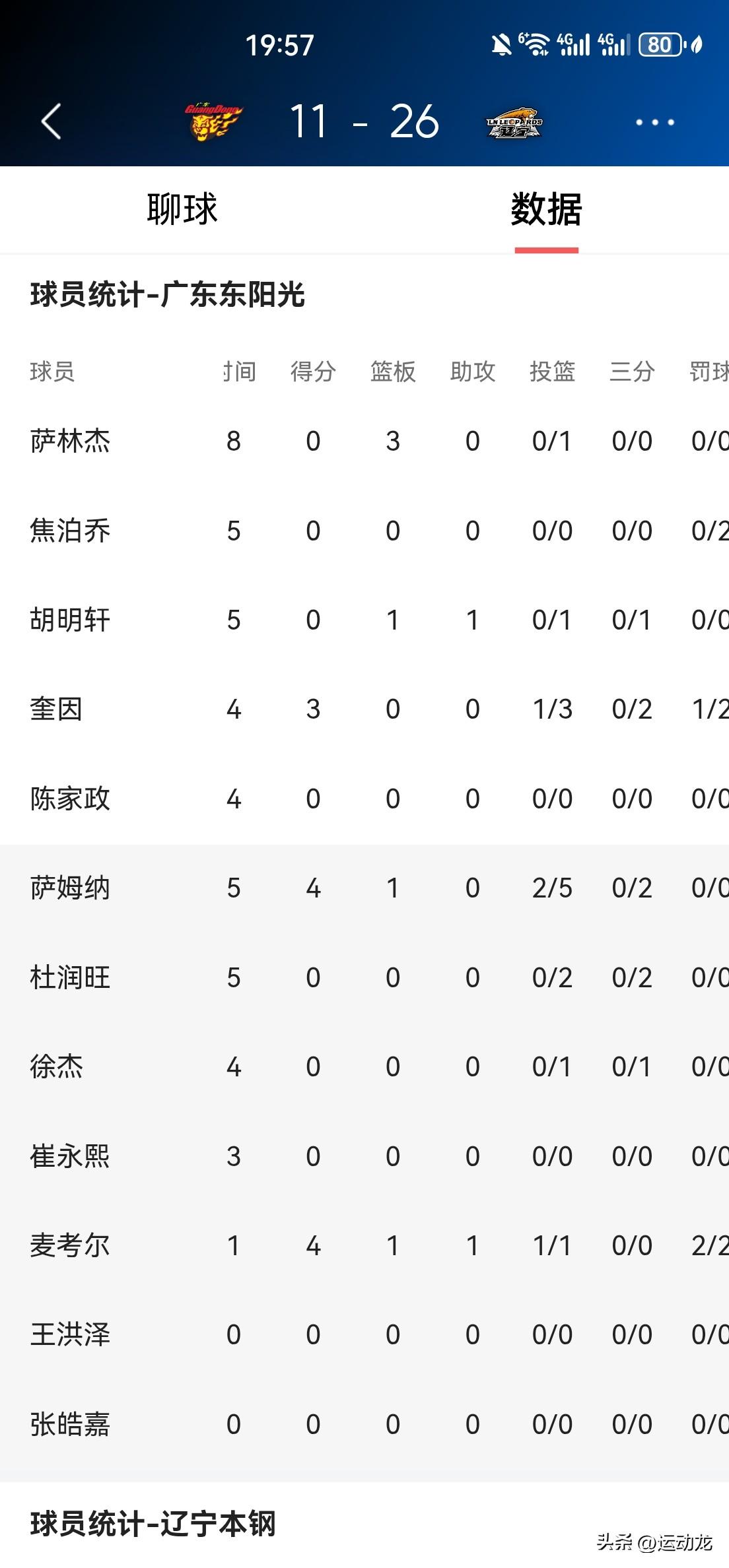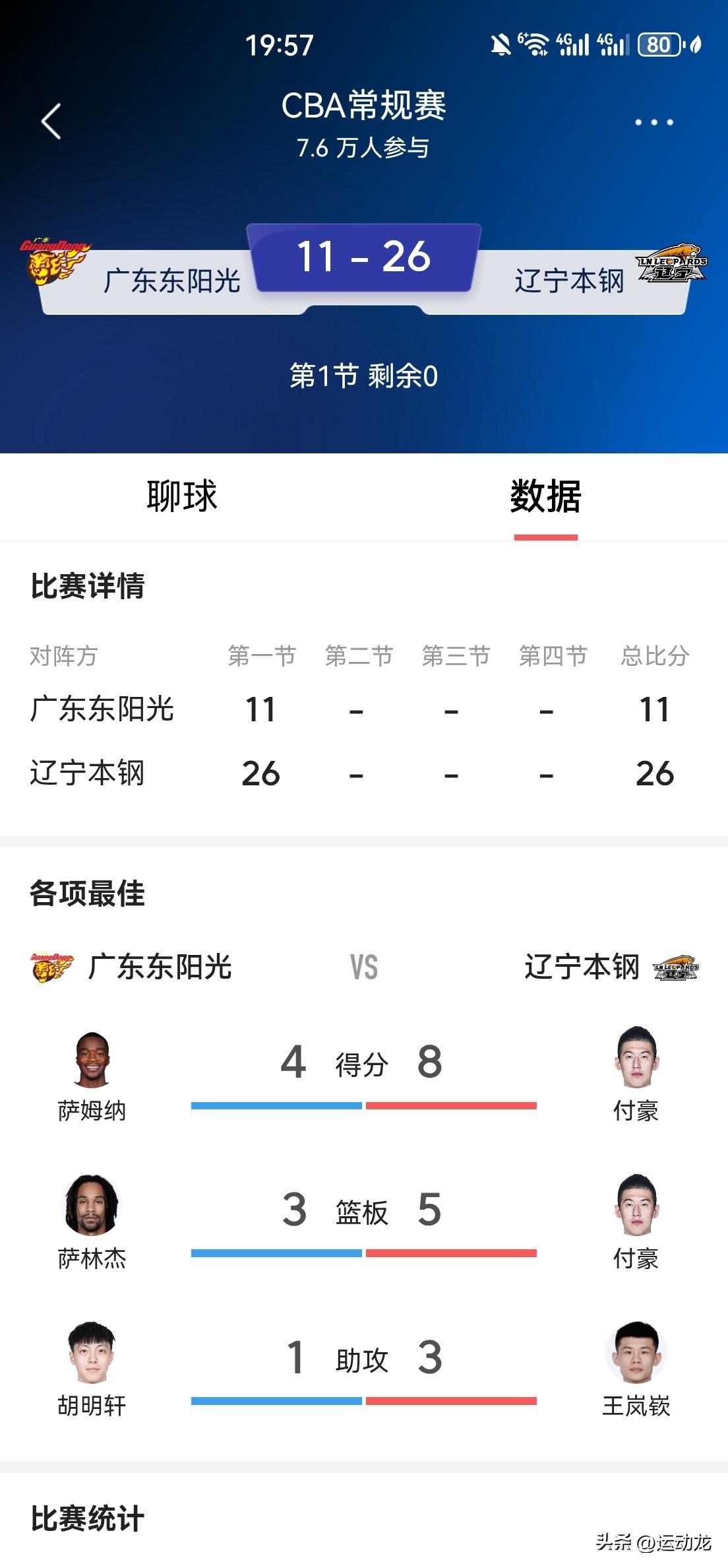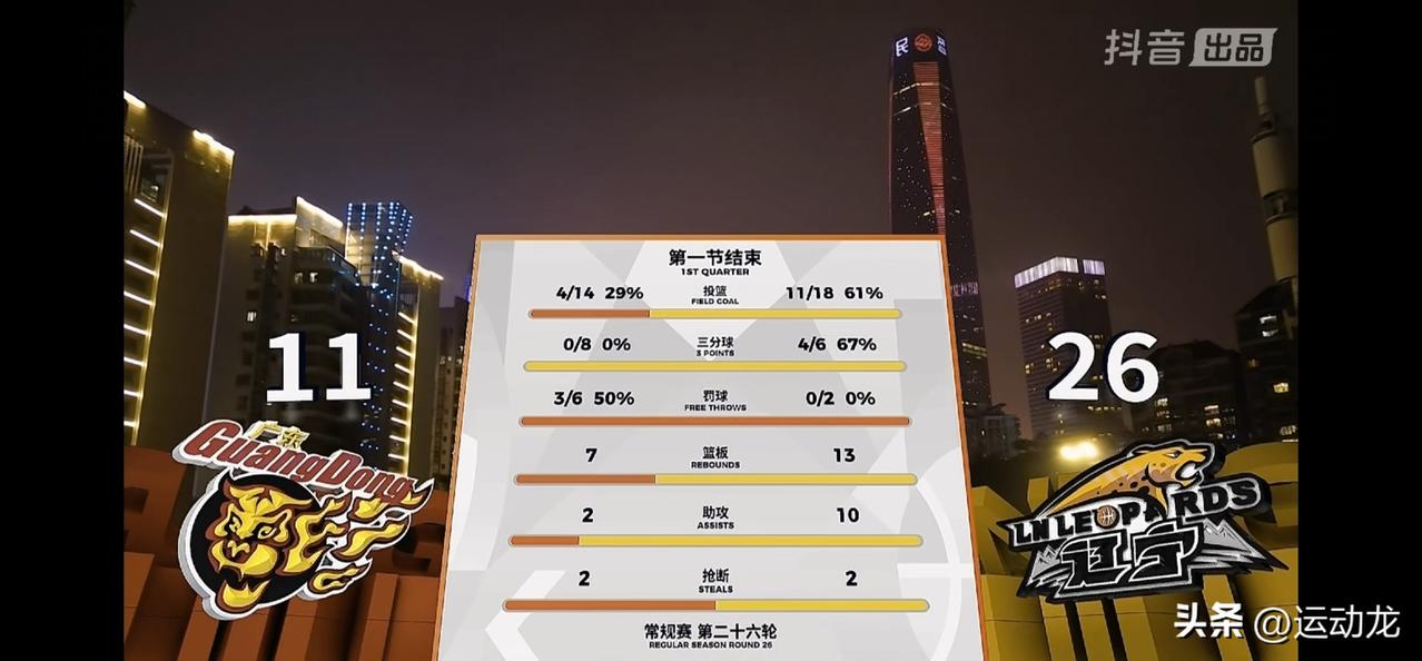 广东首节全队手感冰凉,主场被辽宁打懵了! 第一节,广东11:26落后辽宁15分。 广东队集体低迷,整体投篮14投4中,命中率29%,三分球8投0中。 先发五虎仅奎因一人得到3分,其余人一分未得。 伤愈归队的崔永熙出场三分钟,一分未得,拿到1次失误。