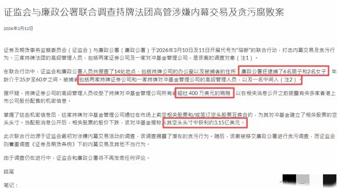 港署出手,搜查了两家中资券商的办公室,并抓了涉嫌受贿、泄露内幕消息的高管。根据网传消息,涉案的券商高层收了对冲基金公司的贿赂400万美元后,提前泄露了多家港股上市公司的“配售”内幕消息,套利3.2亿美金(约合21亿人民币),扰乱了香港服市。即然涉事卷仓涉嫌违法人员已经归案,那么按香港法律规定,此次涉嫌行贿、利用内幕消息操纵股市获利的对冲基金的负责人是不是也会承担相应的法律责任?一般的情况下,行贿人很少会追究法律责任。