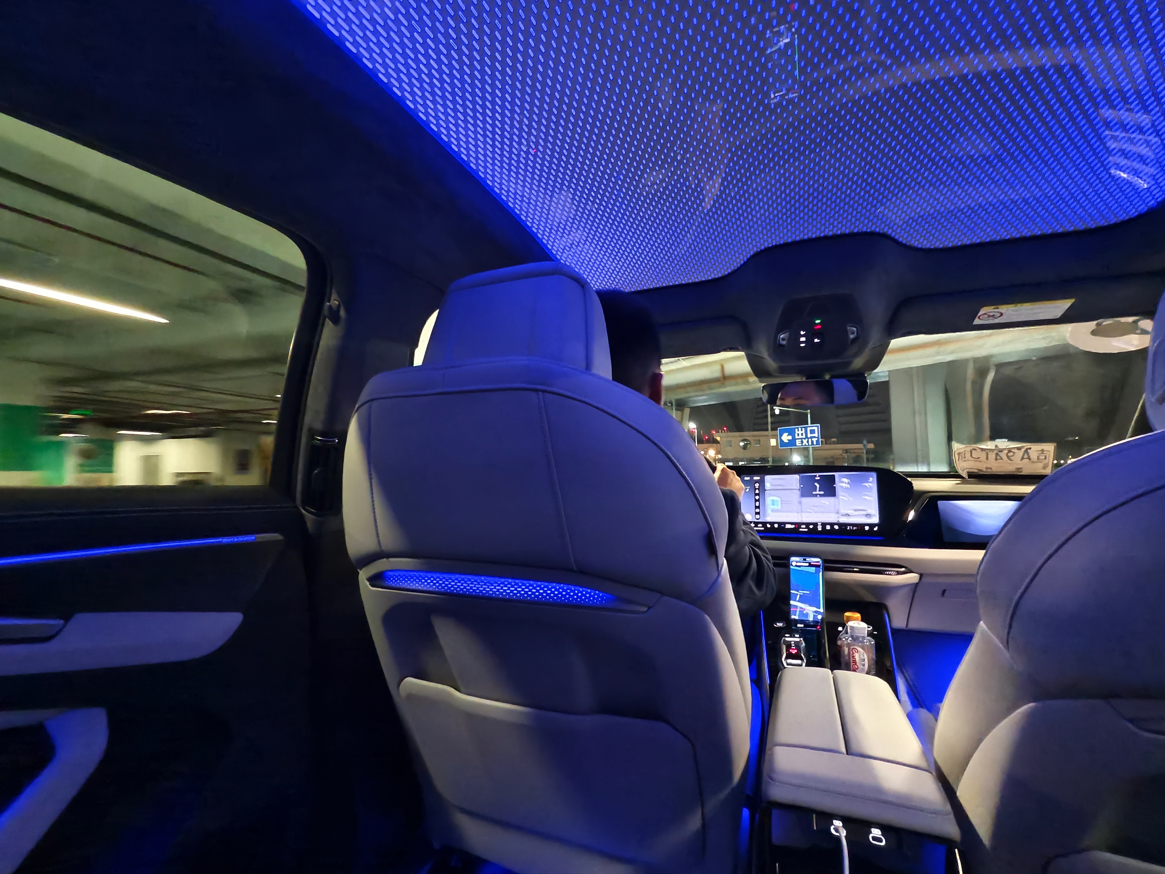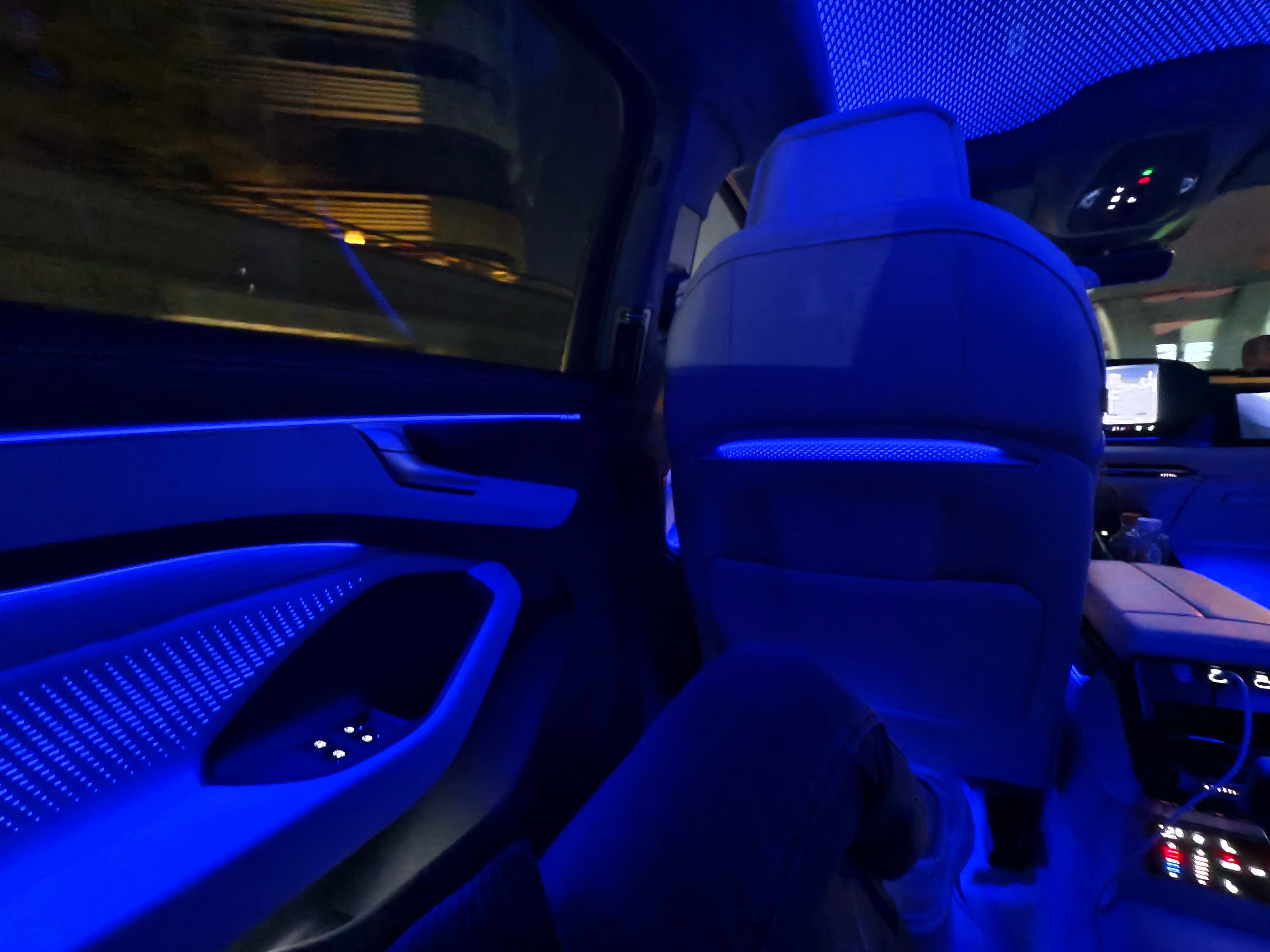 来深圳为了试驾全新奥迪A6L,来接机的就是本品车。被这个夜间氛围镇住了,感觉坐在时空穿梭机里。司机师傅跟我说:后排可以电动调节、这台配备空气悬架、全车B&O音响,可以感受一下。