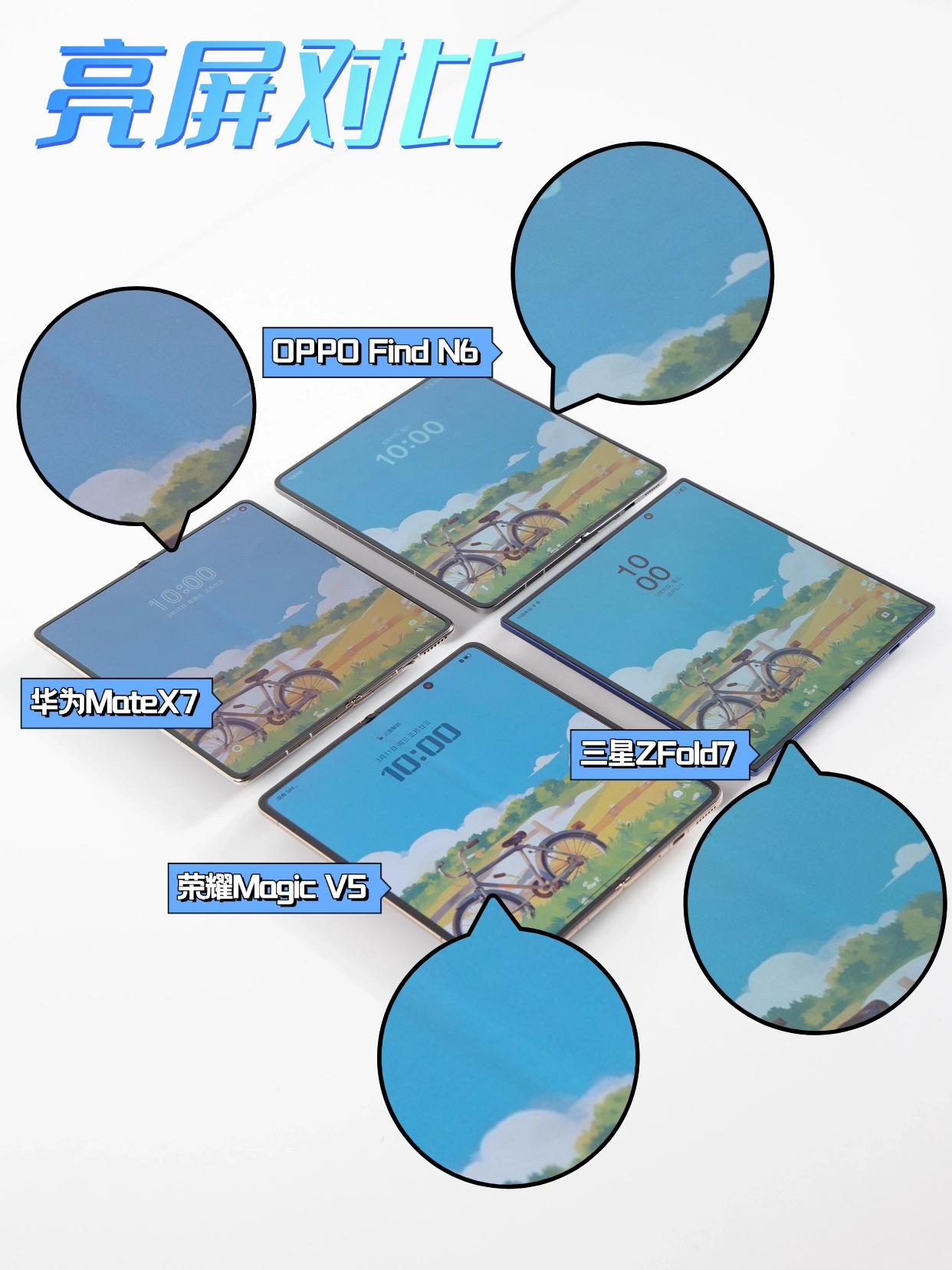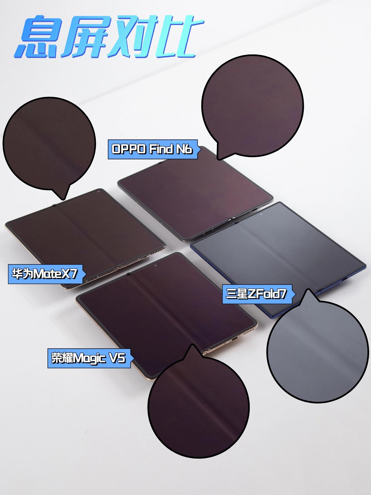 屏幕展开状态下息屏、亮屏根本找不到折痕,正面看、侧面看同样如此,而且摸起来也非常平整,仿佛一块完整的屏幕,把它和三星、华为、荣耀这些热门折叠屏放一起,差异肉眼可见——别人的“中线”在它面前,突然就明显了。