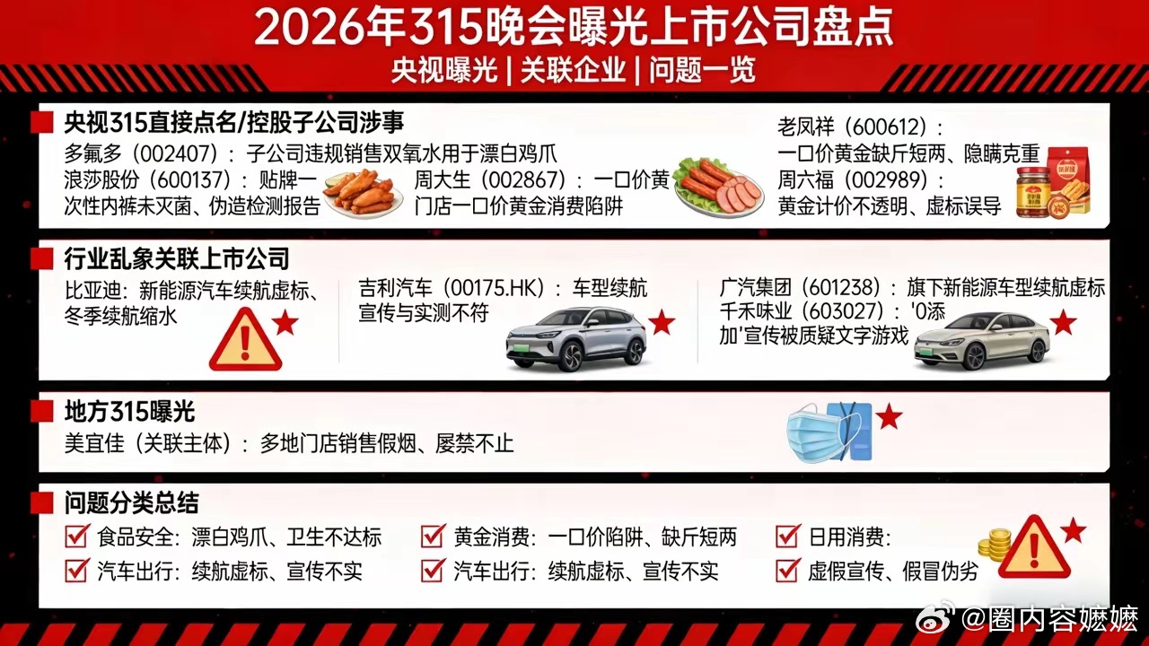 315名单 2026年315晚会曝光上市公司完整名单(截至3月15日21时)一、央视315晚会直接曝光/关联上市公司1. 多氟多(002407) - 控股子公司亿丰电子新材料被点名,违规销售35%双氧水给鸡爪加工厂,通过换标签(标注为"生活饮用水用过氧化氢消毒液")规避监管,用于漂白鸡爪 。亿丰电子由多氟多持股54%,为第一大股东。2. 浪莎股份(600137) - 曝光河南健芝初医疗器械有限公司生产的"浪莎"一次性内裤未灭菌、伪造检测报告。浪莎股份回应称与该企业无业务合作或品牌授权关系,但上交所已对其发出监管函 。3. 周大生(002867) - 部分门店被曝光存在"一口价黄金陷阱",缺斤短两、纯度造假、隐瞒克重,消费者按件购买后实际克重远低于预期。4. 老凤祥(600612) - 同周大生,部分门店涉及一口价黄金缺斤短两、纯度造假问题。5. 周六福(002867) - 同样被曝光部分门店存在一口价黄金陷阱问题。二、地方315晚会曝光上市公司美宜佳(关联上市公司:暂无直接上市主体,关联美宜佳控股) - 广东315晚会曝光广州、佛山、东莞多地门店销售假烟,暗访10家门店全部售假,单店最高查扣294包,总量超854包;执法后回访超半数门店仍在售假,店员群内通风报信。三、被曝光涉及问题的其他上市公司(部分门店/供应链问题)1.比亚迪 002594 新能源汽车续航虚标、智驾不实,冬季续航腰斩,宣传与实际不符,电池衰减拒保 。2.吉利汽车 00175.HK 博越车型冬季续航严重"腰斩",宣传参数与实际测试不符 。3.广汽集团 601238 本田雅阁新能源版被曝光续航虚标问题 。4.千禾味业 603027 被质疑"0添加"酱油玩文字游戏("千禾0"系列),存在商标误导问题。