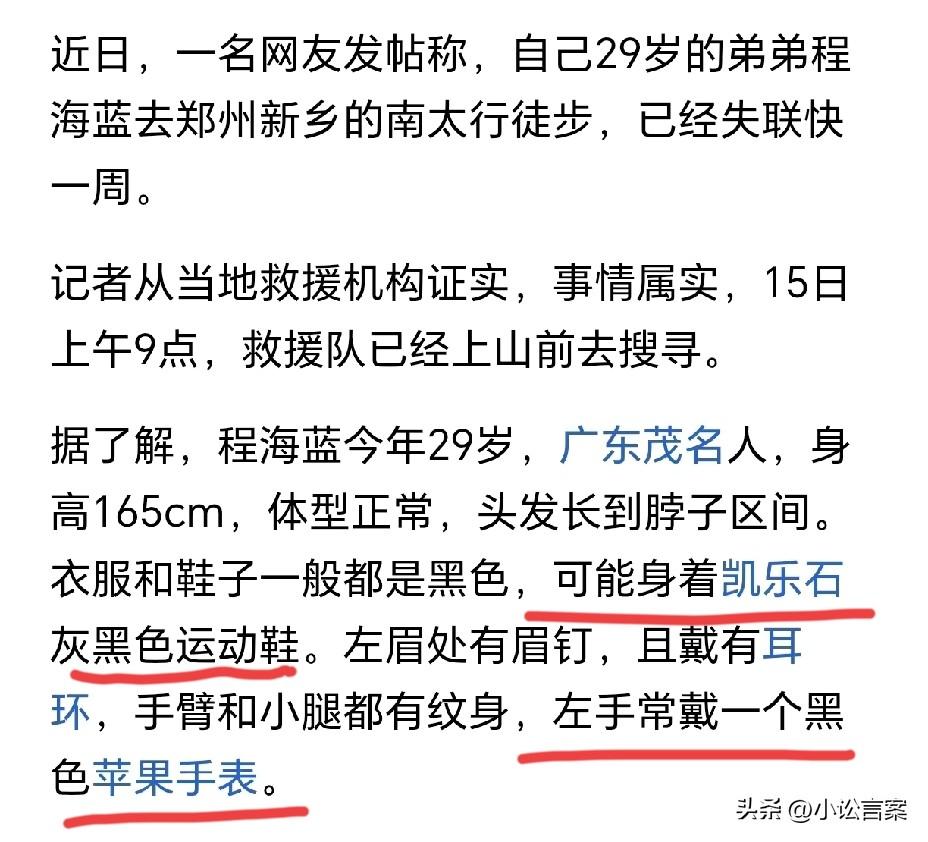 在南太行失踪的29岁男子很有个性,他个头不高,有眉钉、耳环和纹身。失联前曾半小时移动4公里过河上山,如今情况不明,家人都快急疯了! 男子名叫程海蓝,广东茂名人,3月9日从广州坐飞机到河南,2天后到新乡,准备徒步爬南太行山。 南太行山,顾名思义是太行山脉的最南段,也是河南与山西的分界线。那里群峰连绵、沟壑纵横、地貌复杂,对徒步新手来说,非常具有挑战性。 小程的个头并不高,只有165,但身上的装扮却与众不同。两只耳朵都有耳环,左边眉毛上有眉钉,手臂和小腿处还有纹身。 这种装扮乍一看,容易误以为是刚刚成年的精神小伙,29岁已到成家立业年龄,心性会逐渐趋向稳重。 如此装束,不知道是心里幼稚,还是单纯有个人喜好? 从穿的运动鞋、衣服和佩戴的手表看,小程的经济实力还可以,大概率是长期生活在城里,很少接触到北方连绵山林。 根据手机定位显示,3月11日下午1:10,他在辉县的天池度假山庄,半小时后位置移动到云峰寺和东把观景台附近。 家人说他当天上午10点还在发消息,11点便失联了,可两个多小时后手机还在移动,让人十分困惑。 从天池山庄到云峰寺,中间隔着一条河,沿河有很多民宿做生意。从最近的桥过去,路程有4公里,过河后一直爬山,最后一段路连车都去不了。 若光步行,最少要50多分钟,这和之前提到的半小时相冲突。若先乘车再步行,的确有可能赶到,可小程已经失踪五天了,家人报警、贴寻人启事、救援队上山搜寻,假设有司机载他上山,也早应该提供了详细有效的线索,不像现在只剩下手机定位。 一个大活人不可能无缘无故人间蒸发,现在南太行山夜间温度还很低,希望小程能够挺过去,早日被救援队找到,回广东与家人团聚……