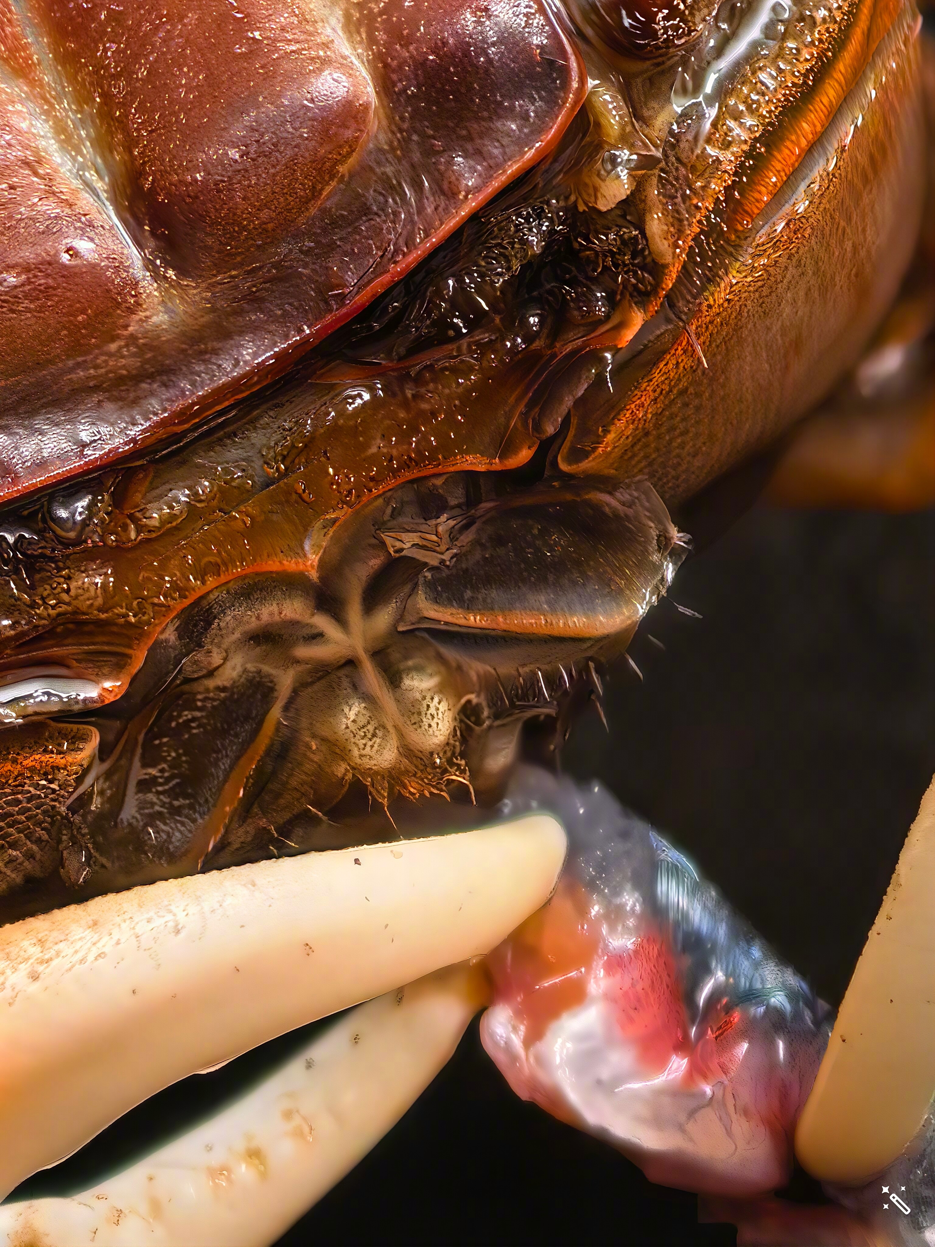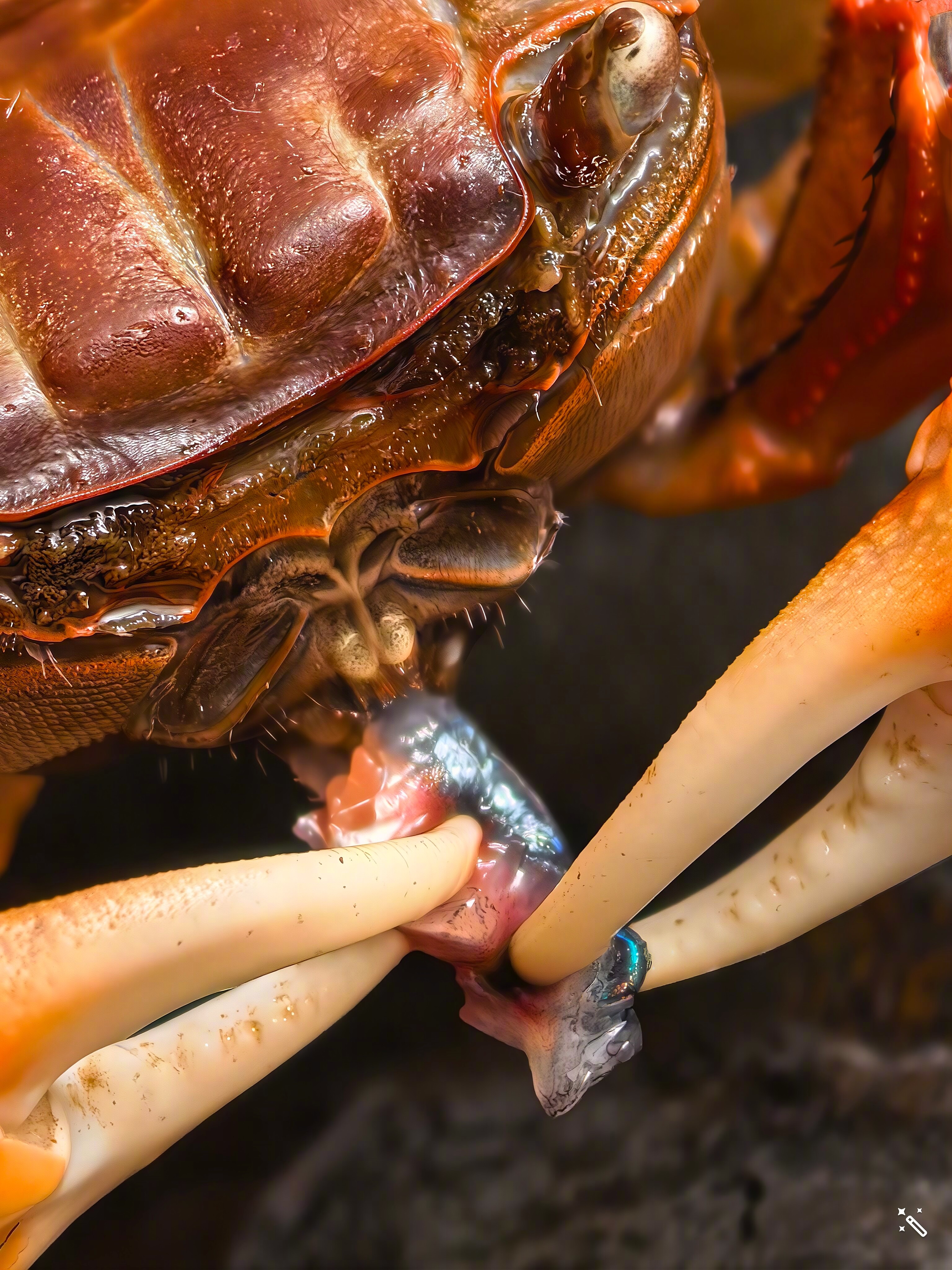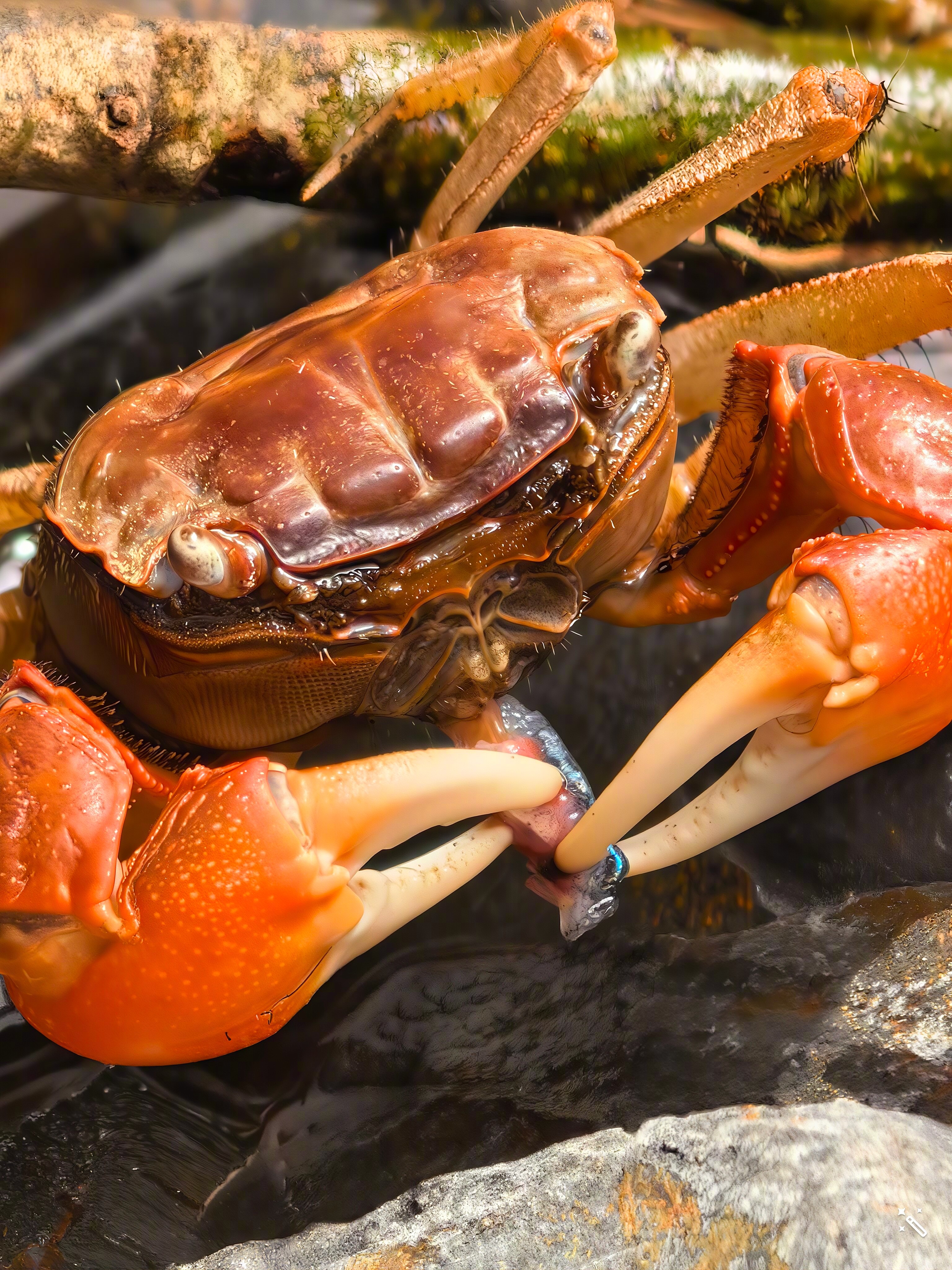 发现了条死鱼,喂给螃蟹,趁它吃饭拍几张。