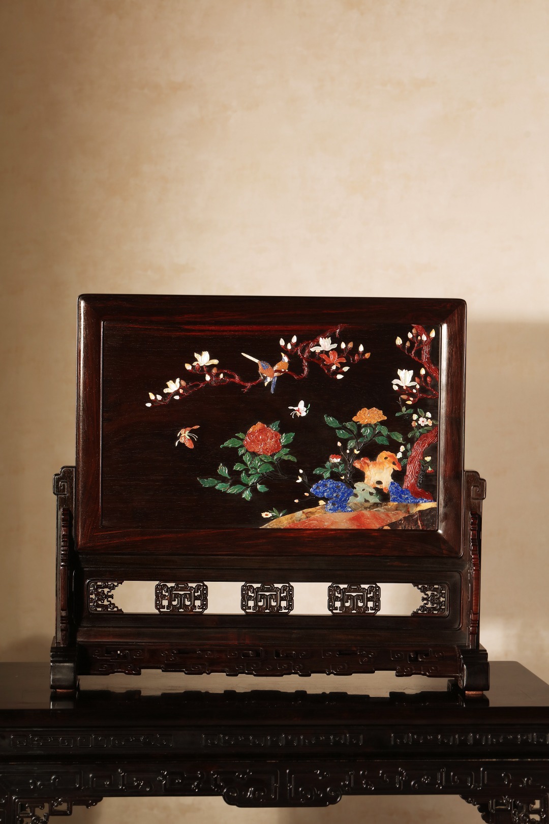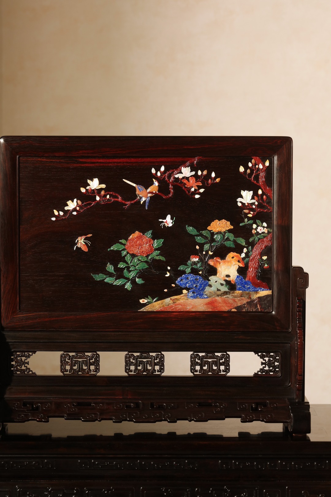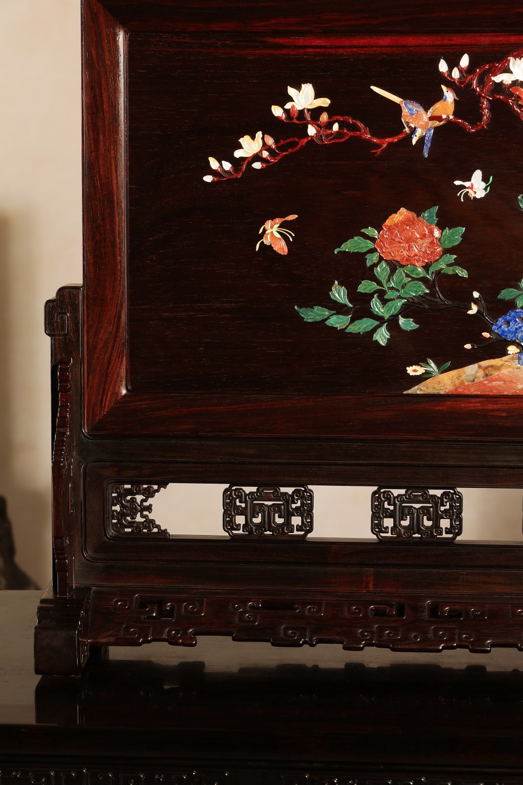 大红酸枝老料制,榫卯工艺,整器透雕纹饰,古朴端庄屏中心一面百宝诸珍嵌入,一面无修饰,素雅大气,富丽典雅,流光溢彩。