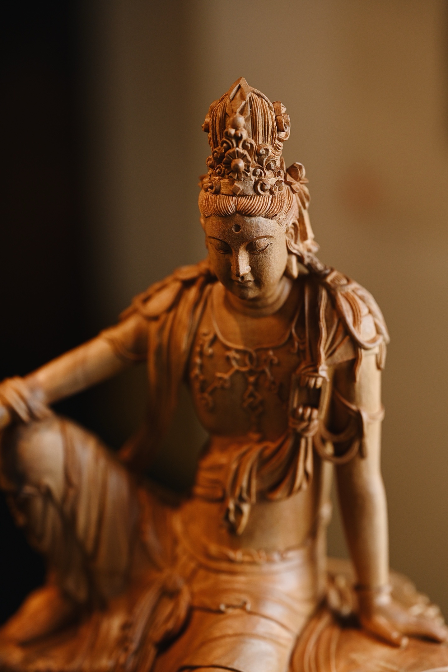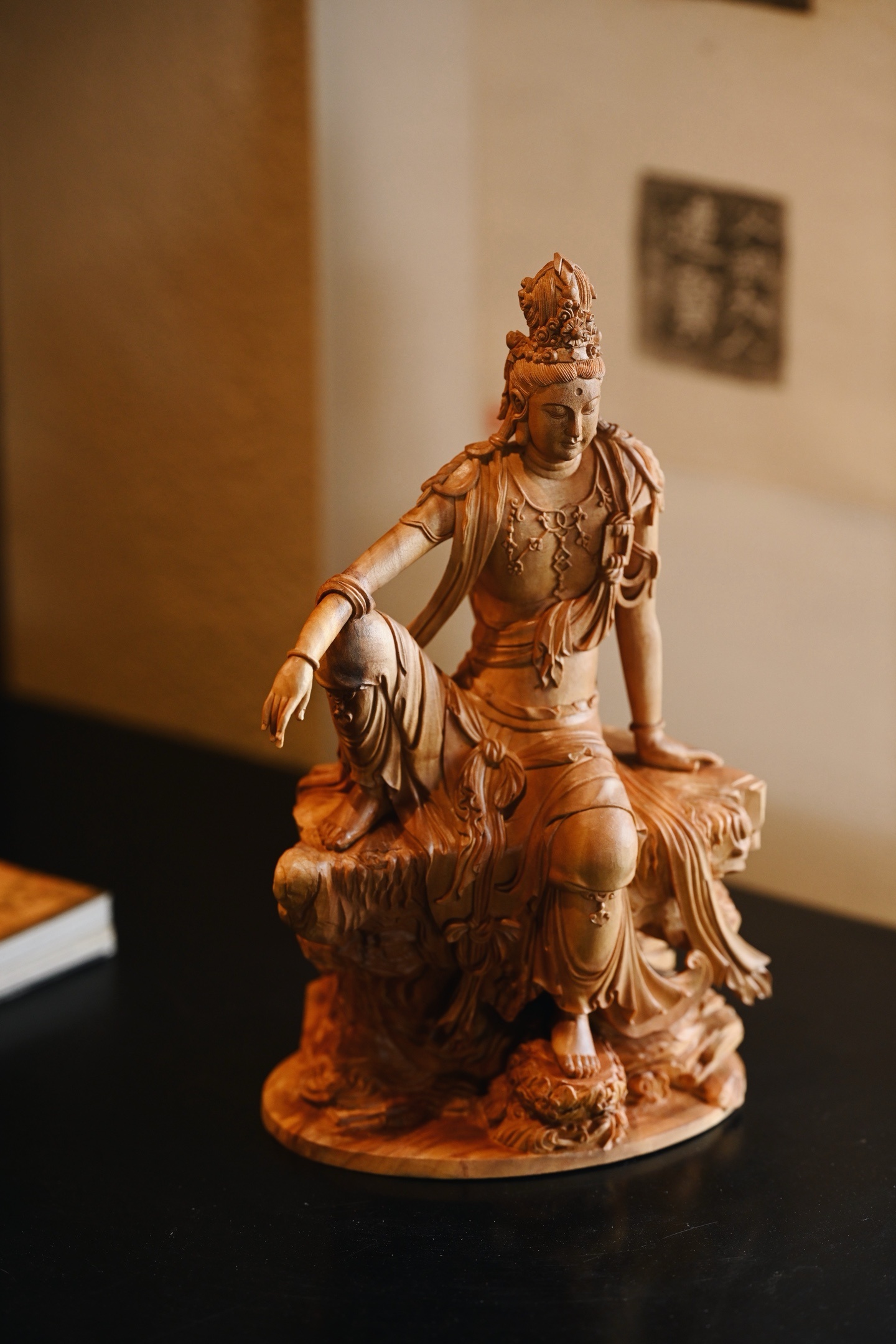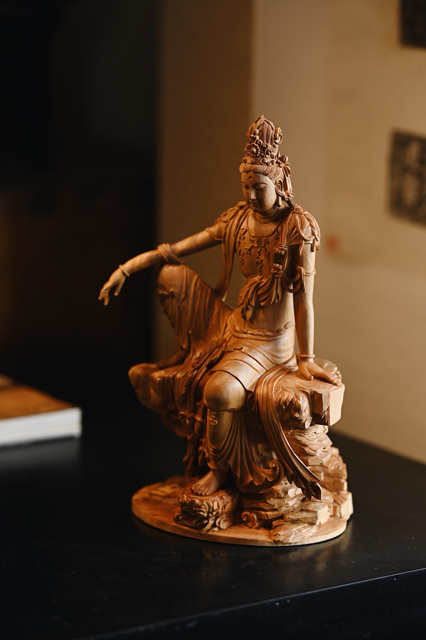 水月观音为三十三观音之一,呈游戏坐姿,此尊面容沉静,顶束工整高髻,发丝根根分明,头戴宝冠,两条发髻依肩而下。右手垂搭于右膝之上,左手倚靠于台座。上身袒露,佩戴华美璎珞、腕钏,肩披岥帛,衣纹繁缛流畅,自然垂委而下,神情静穆恬淡,仪态轻松自如。