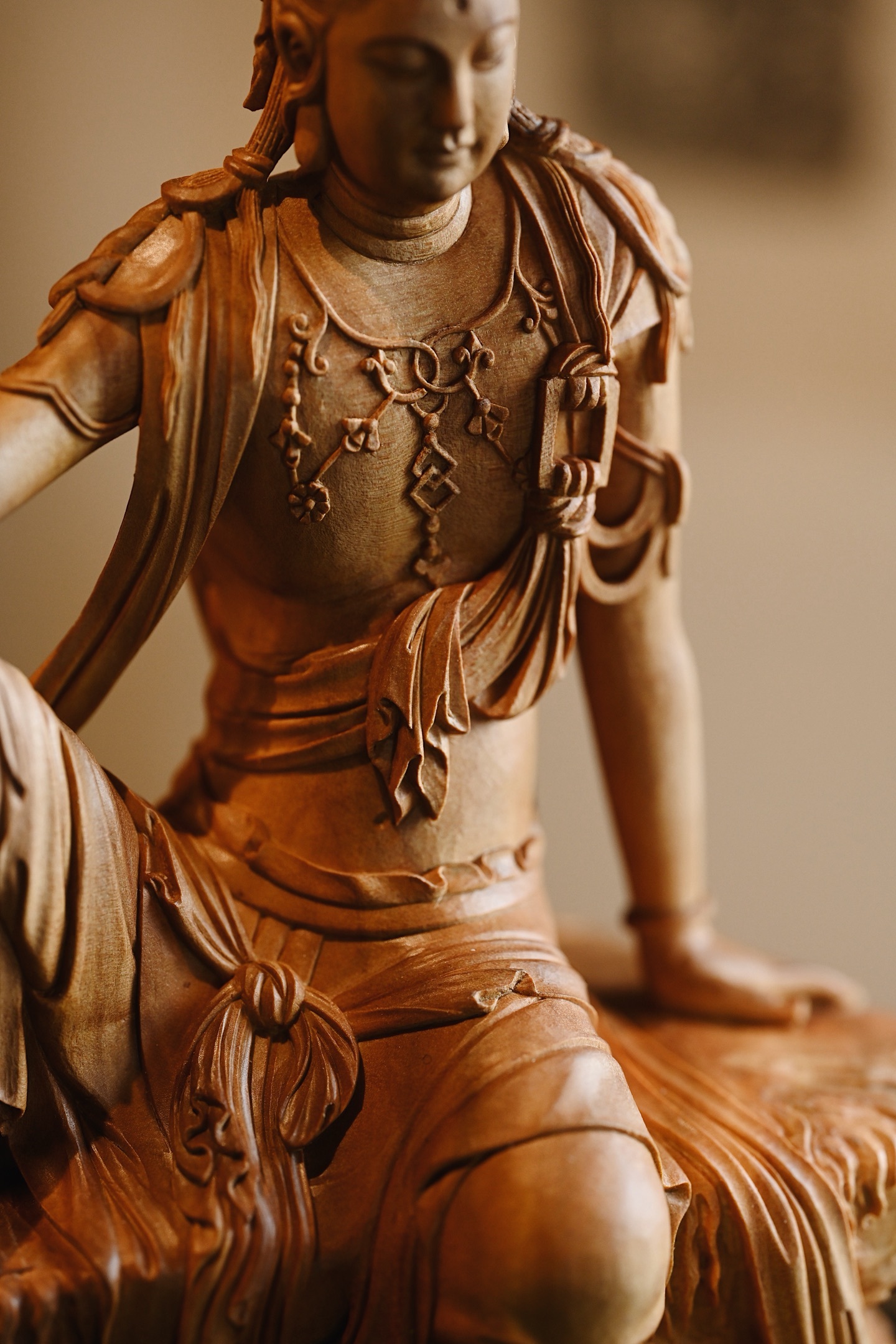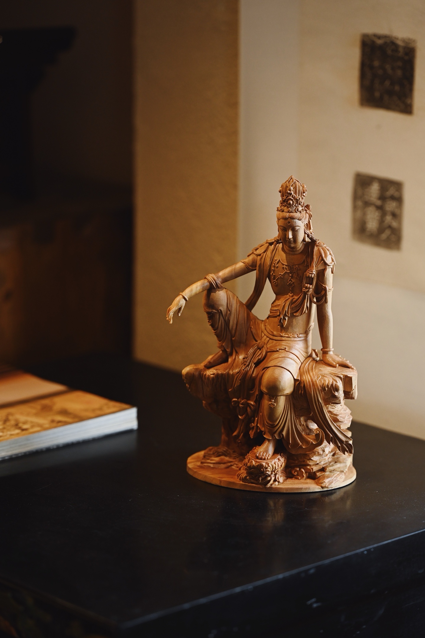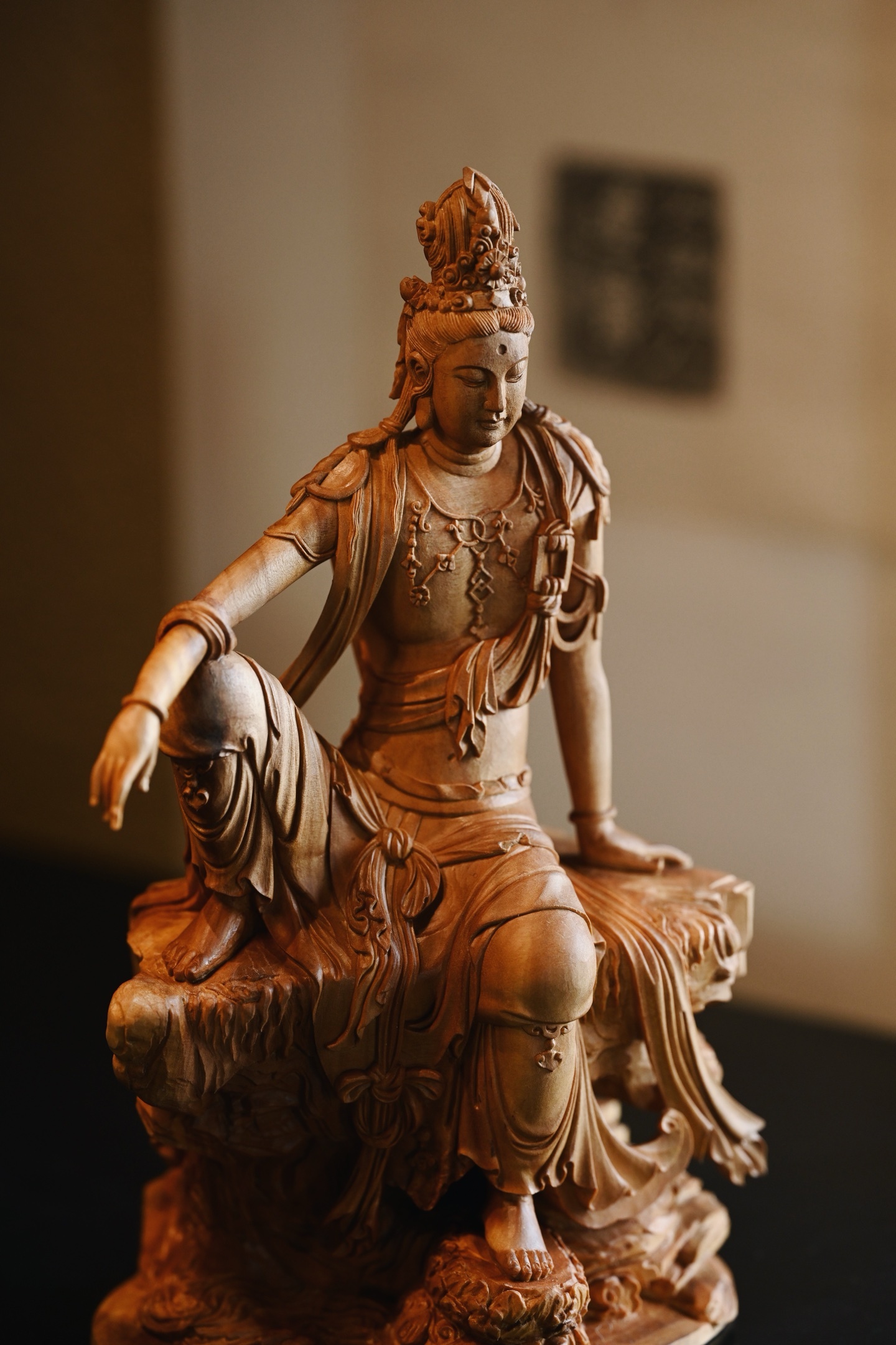 水月观音为三十三观音之一,呈游戏坐姿,此尊面容沉静,顶束工整高髻,发丝根根分明,头戴宝冠,两条发髻依肩而下。右手垂搭于右膝之上,左手倚靠于台座。上身袒露,佩戴华美璎珞、腕钏,肩披岥帛,衣纹繁缛流畅,自然垂委而下,神情静穆恬淡,仪态轻松自如。