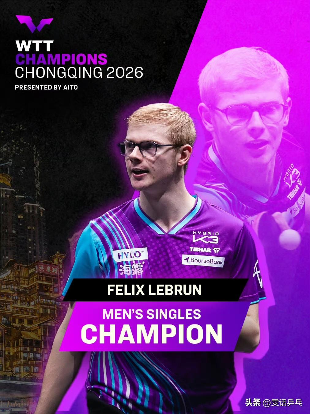 1/16决赛 3-0夸德里·阿鲁纳🇳🇬 1/8决赛 3-0安宰贤🇰🇷 1/4决赛 4-3雨果·卡尔德拉诺🇧🇷 半决赛 4-3松岛辉空🇯🇵 决赛 4-1温瑞博🇨🇳 恭喜费利克斯-勒布伦 获得2026WTT重庆冠军赛冠军🏆 ​​​ 2026.3.15
