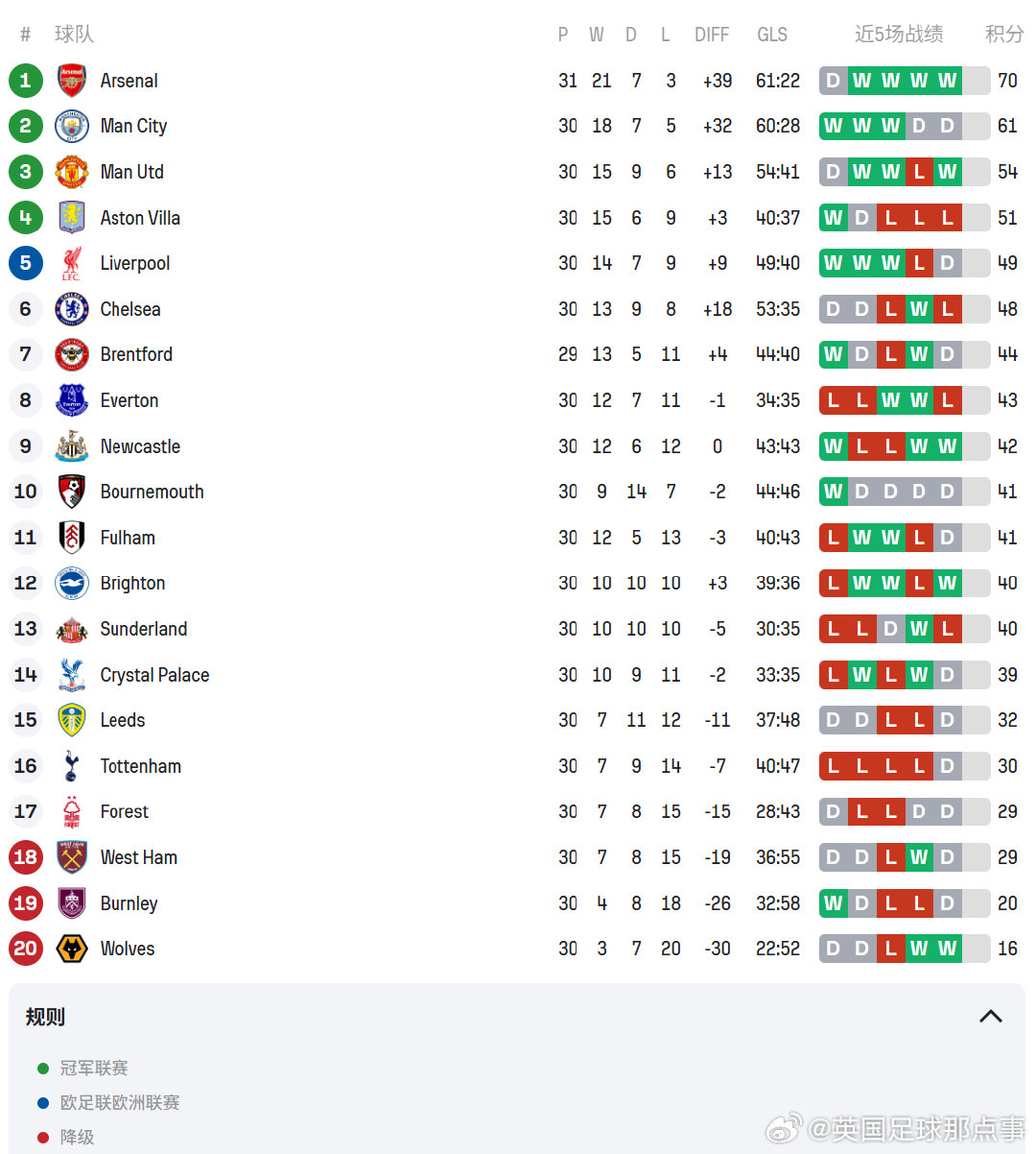 英超30轮后积分榜⬇️