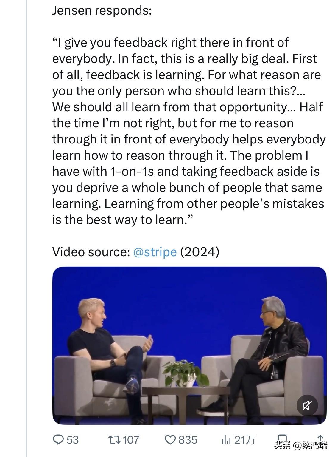 英伟达有60个高管直接向黄仁勋汇报。 但他拒绝跟任何人一对一开会。 商学院教材觉得这简直疯了。 黄仁勋算了一笔极度现实的账。 当一个CEO直管60个人时,公司瞬间蒸发了七个管理层级。 没有私下谈心。 没有闭门绩效反馈。 下属工作搞砸了,他直接在60人的大会上公开复盘。 职场里所谓的一对一私下沟通,本质上全是在照顾员工的自尊心。 黄仁勋不买这个单。 批评就是最高效的学习。 凭什么你犯了错,这免费的一课只能由你一个人听? 一个人搞出了尴尬,这60个人全都得跟着长记性。 他坦白自己一半的时间也是错的。 但在众人面前把试错逻辑推演一遍,所有人立刻就能掌握决策的思考路径。 绝对的信息平权。 没有人拥有内部特权。 更不会有人在茶水间散布“老板私下跟我讲”的废话。 砸碎大企业病的最好办法,就是彻底剥夺各级主管囤积信息的权力。