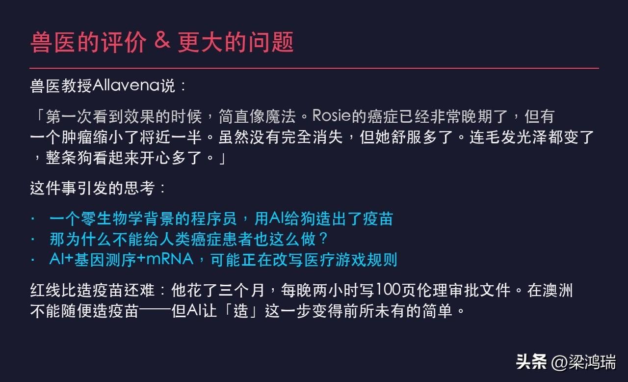 这事太硬核了。 澳洲一个程序员,领养了只癌症晚期的流浪狗Rosie,兽医说活不了几个月。 这哥们没认命: · 花3000澳币测序肿瘤DNA · 把基因数据喂给ChatGPT和AlphaFold · 零生物学背景,硬是找到突变蛋白 · 自己设计了mRNA疫苗方案 · 搞定100页伦理审批,开车10小时带狗打针 结果:肿瘤缩小近一半,狗活蹦乱跳。 AI时代,普通人真的能干出以前只有实验室才能做的事。问题来了——既然能给狗做,为什么不能给人做?