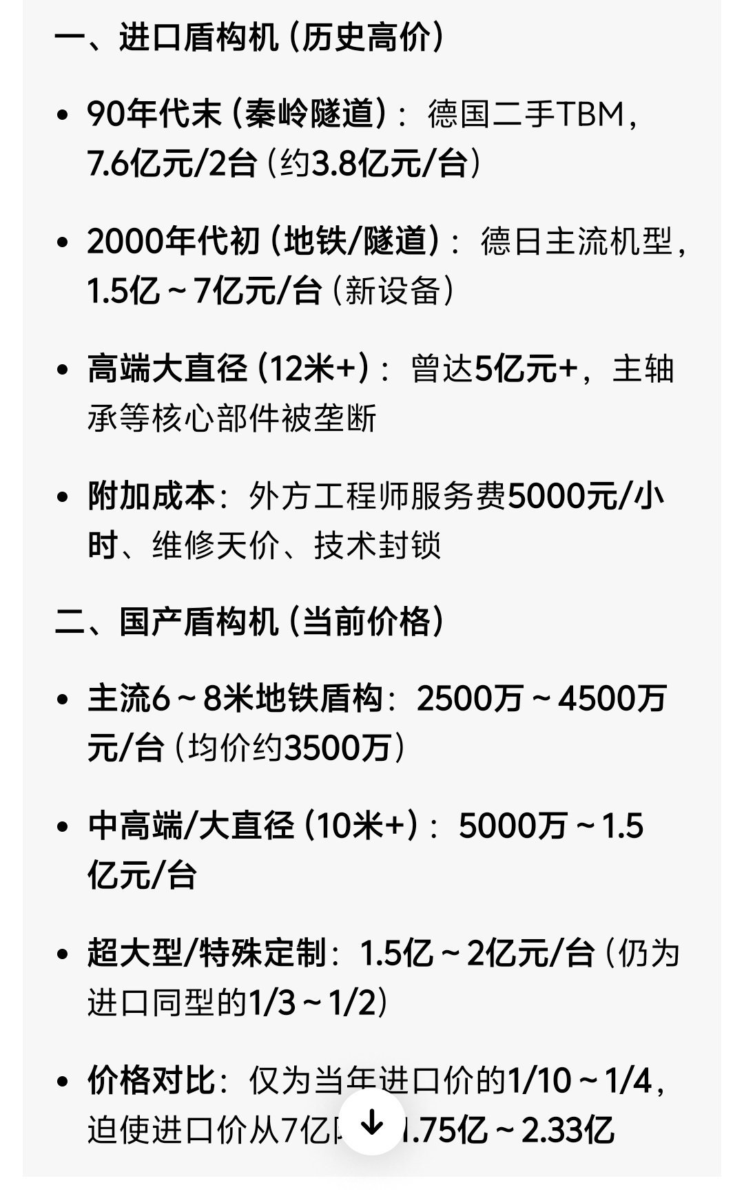 全球盾构机七成中国造 以前二手的进口盾构机要3.8亿元/台,现在国产仅为当年进口价的1/10~1/4,占领全球七成市场,产销量连续八年全球第一