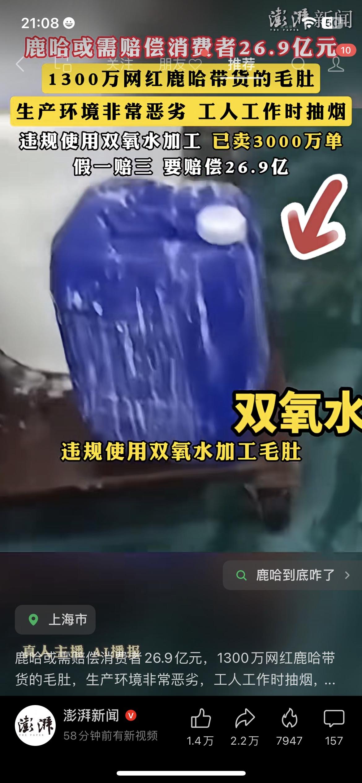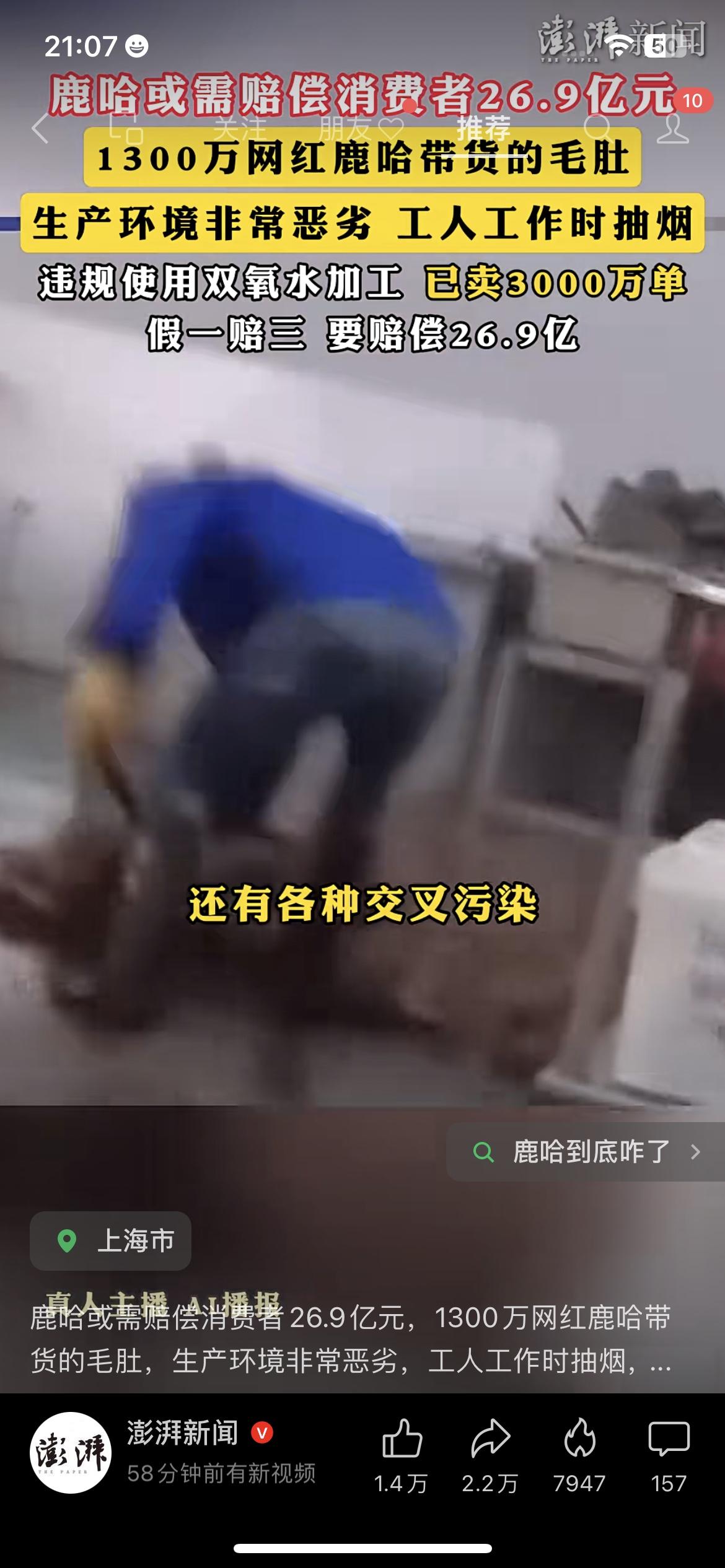 1300万网红鹿哈带货的毛肚,被曝生产环境恶劣,或需赔偿消费者26.9亿元。 据报道,这款毛肚生产车间脏乱差,工人边抽烟边干活,还违规使用双氧水加工,已经卖出3000万单。 按照“假一赔三”的规定,涉案金额高达26.9亿元,鹿哈作为带货主播,可能要承担连带赔偿责任。 不少网友炸锅:自己买过这款毛肚,现在想想都后怕,要求平台和主播给说法。 这也给所有带货主播提了醒:选品不严、只顾赚钱,最终要为自己的行为买单。 鹿哈 网红带货 食品安全 消费维权 👉 你买过这款毛肚吗?觉得网红带货应该为产品质量负责吗?评论区聊聊~