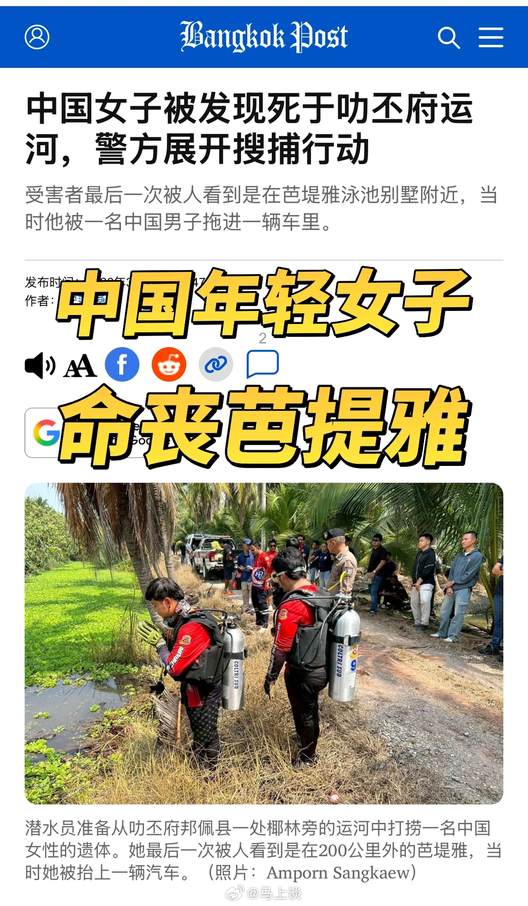据报道,上月在泰国芭提雅参加完泳池派对后便失踪的34岁中国籍女子季某(音译)被抛尸,其尸体被丢弃在距离事发泳池别墅238公里外的一处沟渠内。泰国媒体《The Thaiger》报道得更详细且有正面照片。