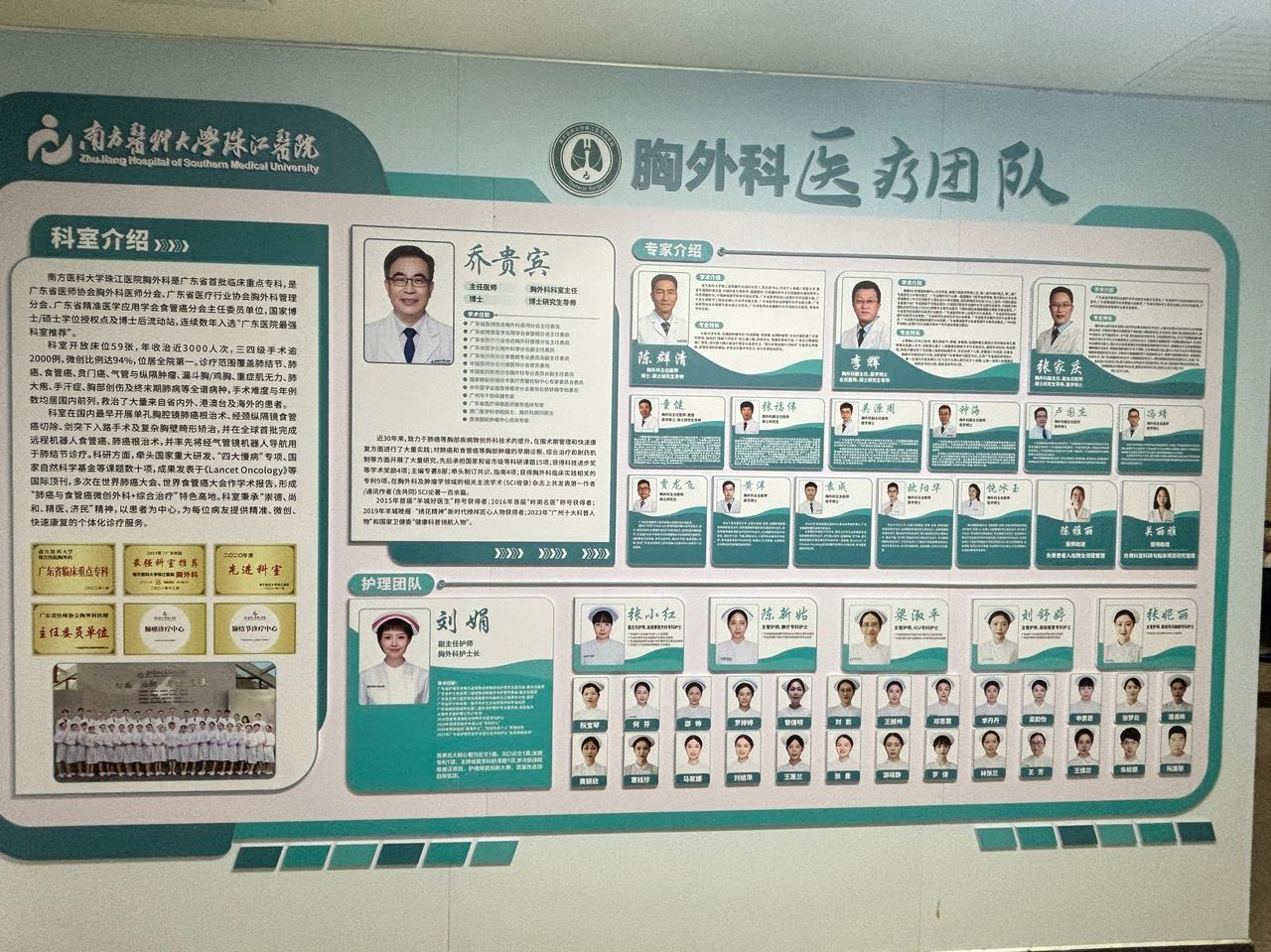今天我们不谈科普,专门为大家介绍一下我们珠江医院胸外科的团队!我们珠江医院的胸外科,是广东省重点专科,也是医院最强科室推荐,连续多年被评为医院先进科室,在医、教、研三个方面都表现得特别出色。 同时,科室还兼任了全院的肺癌诊疗中心和肺结节诊疗中心,全方位为患者提供胸部疾病相关的诊疗服务。 全科现有医护工作人员50多人,其中硕士、博士研究生20多人,再加上进修生,全科共有100多名工作人员,团队规模充足、人才梯队完善,能够为患者提供专业、高效的医疗服务。 下面,我简单为大家介绍一下我们团队的核心成员,先从医生团队说起。 目前我们的医生团队中,有3名正高职称、3名博导、7名副高职称,高级职称教授级别的人员就有十多人,而且绝大多数医生都拥有博士学位,并且有海外留学的经历,专业能力扎实、视野开阔。 陈群清主任:他是科室的老主任,特别擅长各类胸外科手术。他还自主发明了指触法漏斗胸矫正术,这种手术极大地降低了术中死亡等并发症的风险,因此每年都有很多国内外的小朋友慕名而来,找他做漏斗胸矫正手术。 科室副主任李辉教授:他尤其擅长大型胸外科手术,无论是大气管手术、大肿瘤切除,还是胸部创伤的救治手术,都有着丰富的临床经验,能够从容应对各类复杂病例。 张家庆主任:专门学习过肺移植手术,在复杂胸外科手术、袖状切除、双袖状切除、肺动脉成型等难度较高的手术方面,具备非常熟练的操作技巧和丰富的临床经验,能够为复杂病例患者提供精准诊疗。 我们还有一位老教授,也是我的老师——童健主任。童健主任是全国最早一批拥有硕士研究生学历的胸外科医生,曾在湘雅医院、301医院学习和工作,他的导师是我国心胸外科鼻祖级人物黄孝迈教授。 自上世纪80年代来到广州后,童主任一直深耕胸外科领域,省内各类复杂手术的会诊,大多由他牵头完成,是业内公认的权威专家。 张福伟副教授:是我们科的高年资教授,在各类微创手术领域有着深厚的造诣,临床经验十分丰富,能够为患者提供创伤小、恢复快的微创治疗方案。 我们还有几位优秀的年轻教授:吴源周教授也曾学习过肺移植手术,专注于肺结节诊疗,他开展的经乳晕单孔微创肺手术,兼顾微创疗效与美容效果,深受患者认可; 钟海教授擅长肺结节定位、肺结节消融机器人手术,对肺部小结节的精准处理有着独到的经验,近年来还着力于肺术后康复研究,形成了一套系统、完善的术后康复体系; 卢国杰教授开展过大量心胸外科手术,在肺结节、食管癌的微创手术方面积累了丰富经验,技术精湛、责任心强。 在这里还要补充一位重要成员——郑于臻教授,他刚刚加入我们团队一个多月,郑于臻教授在肺结节的诊断、治疗,以及晚期降期肺癌手术方面,有着非常丰富的临床经验,他的加入为我们团队注入了新鲜活力,也让我们能够为更多患者提供优质服务。 除此之外,我们的医生团队还有冯靖教授、贾龙飞博士、黄洋博士、袁成博士、欧阳华博士、饶冰玉博士等,整个医生团队近20人,分工明确、协作默契,全方位覆盖胸部疾病的各类诊疗需求。 说完医生团队,再和大家介绍我们的护理团队 在刘娟护士长的带领下,护理团队始终专注于患者术前、术后的围术期康复护理,在症状管理、无陪护患者护理等方面积累了大量经验。护理团队中也有多名高级职称人员,专业素养过硬、服务态度贴心。 总之,整个胸外科医护团队协同发力,始终把患者的健康放在首位,用心照顾每一位患者,努力提升患者就医体验,帮助患者快速康复,这就是我们珠江院胸外科团队的初心和使命。[作揖][玫瑰]