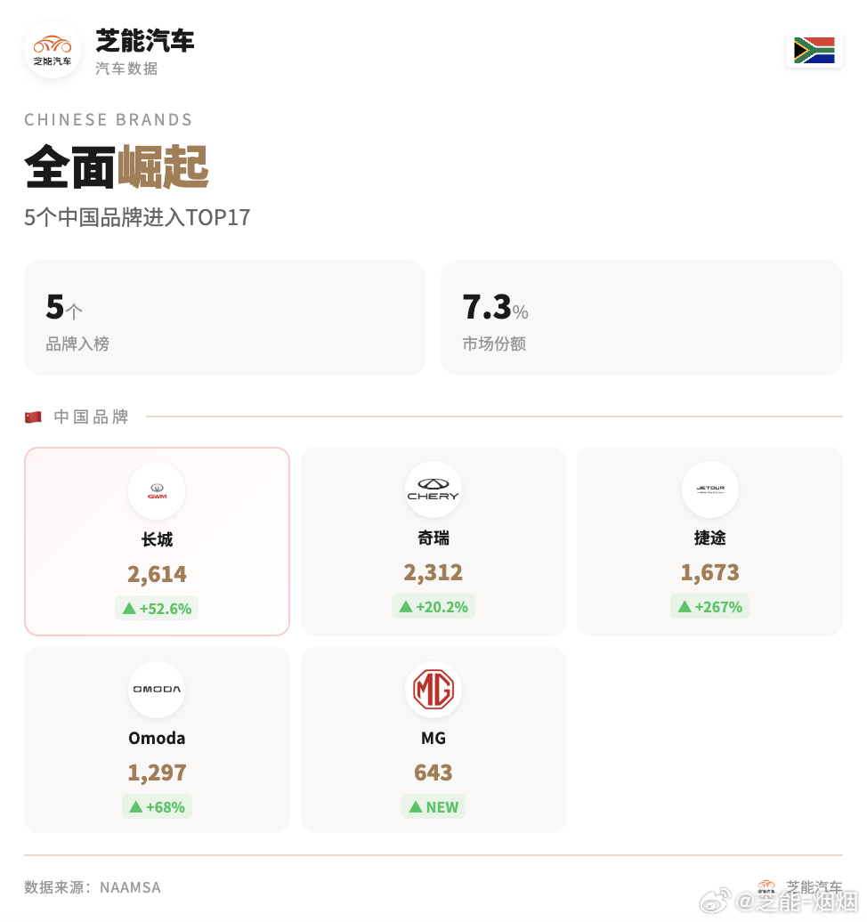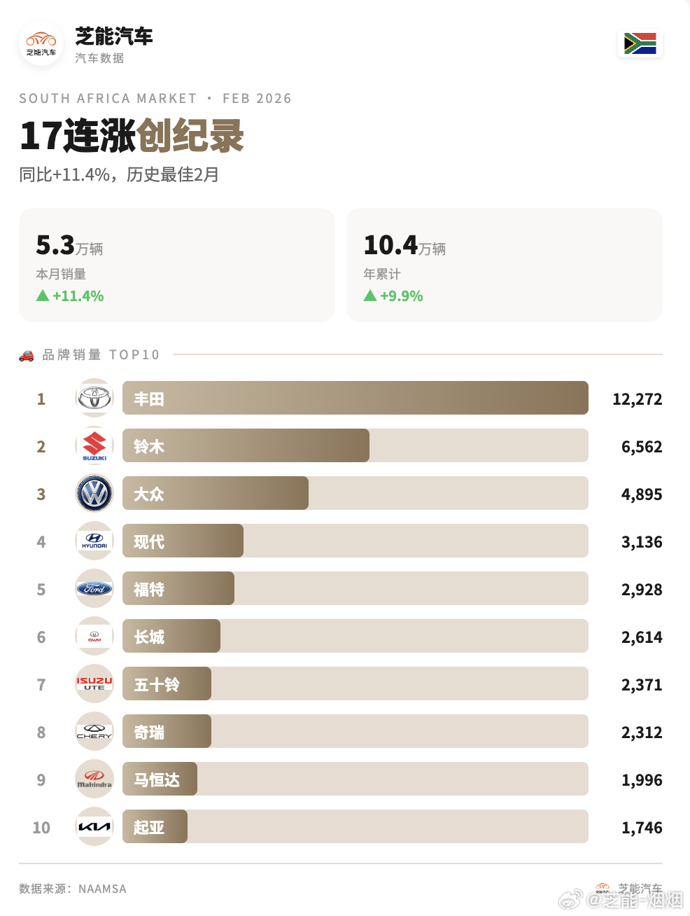 2026 年 2 月南非车市持续增长,创同期历史新高,前两月整体保持两位数上涨。中国品牌表现强势,市场份额稳步提升,已成为当地重要力量。
