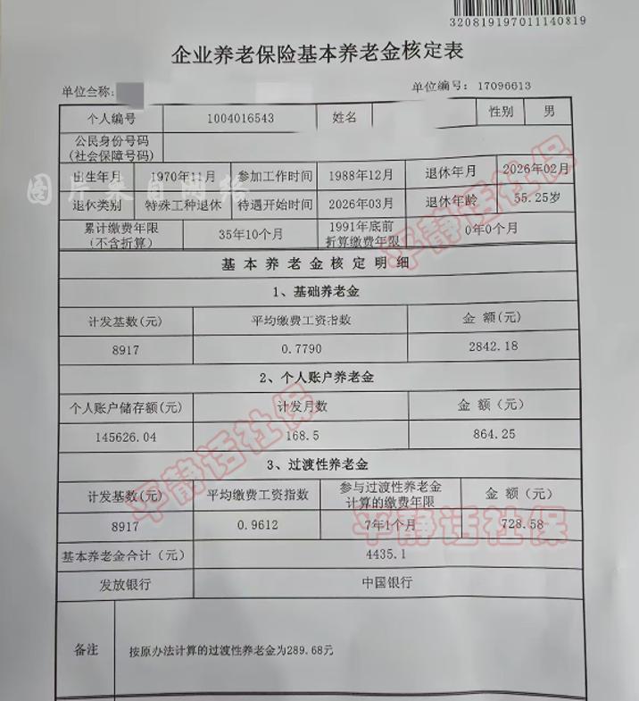 江苏宿迁养老金! 这是一位特殊工种退休的企业职工,88年12月参加工作,2026年2月退休,延迟了3个月,退休时55岁3个月。累计缴费35年10个月,足以证明上班很早。个人账户本息累计14.56万,指数0.7790。 养老金核定结果: 基础养老金2842.18元 个人账户养老金864.25元 过渡性养老金728.58元 几项合计4435.10元 平均工龄单价124元/年 虽然是特殊工种退休,但不满足折算,因此过渡性养老金仍旧是7年1个月。 江苏省的特殊工种折算仅在过渡性养老金年限中体现,基础养老金年限不加折算年限的。 过渡性养老金0.9612,说明92-95年实际缴费指数小于1,计算后可知是0.9313,这样的属于指数被拉高的情况。