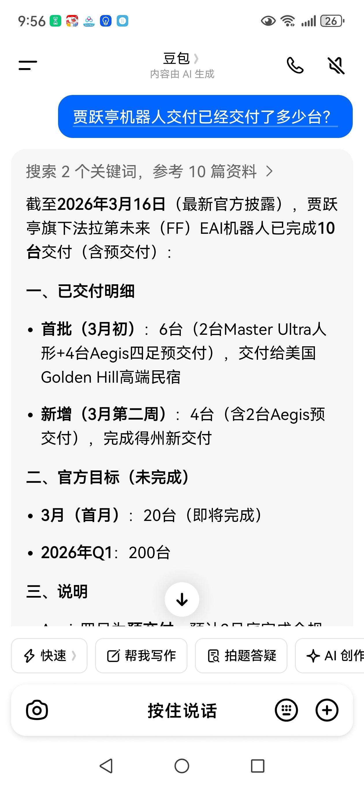 今天周一,准时的贾跃亭发布了周报,主要讲了4点,第三点尤其重要。 第一点:贾跃亭挥刀斩向华其心。他是一个做空团的团长,组建了一个群,领导了不少人做空FF,也因为FF股价不断创新低,获利颇丰。这次贾跃亭采取了擒贼先擒王的策略,亮剑华其心,能否让股价翻转,我们拭目以待。 第二点,将龙虾融入EAI ,让其机器人进化升级,能够适应新环境。 第三点,新交付机器人4台。至此已经累计交付14台,离20台的月交付目标越来越近。 第四点,FF总部乔迁至大硅滩。这个地区有谷歌,有亚马逊,是一个创新中心。在这地区,贾跃亭能更好的招募人才,吸引投资。