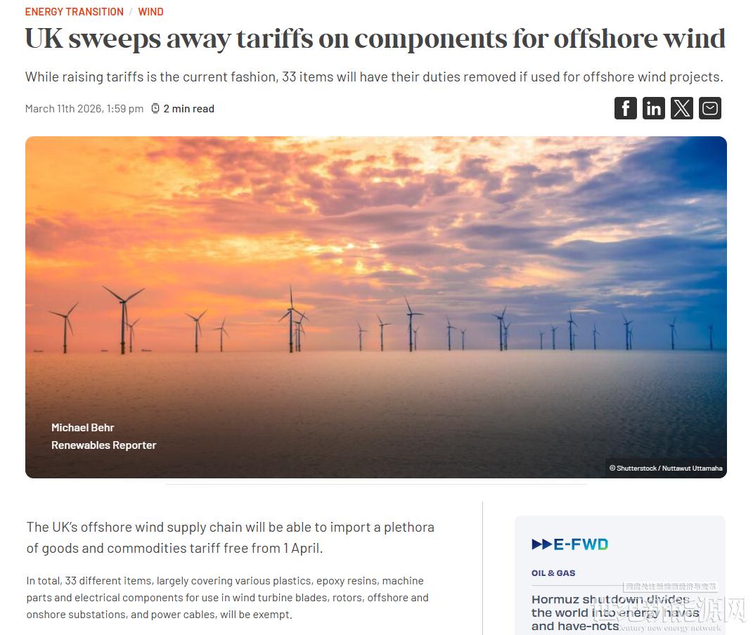 3月12日,英国政府突然宣布取消33种海上风电关键工业品的进口关税,4月1日起正式实施。 其中包括风机叶片、海底电缆、转子、塔筒以及海上变电站设备等核心组件,一些产品的关税从6%、2%直接降到0。 很多人第一反应是,这不就是给中国风电企业开了一条“绿色通道”吗? 是的,确实是给中国风电企业开了绿灯,不过这也是没有办法的事,因为英国已经等不起了。 英国是欧洲海上风电规模最大的国家之一,海上风电装机几乎占欧洲的一半。但尴尬的是,这么大的市场,很多关键设备却几乎没有本土制造能力,大量设备只能依赖进口。 未来几年,英国海上风电建设速度预计要达到30%到40%的增长。项目在排队、装机在扩张,可设备从哪里来?成本谁来承担? 再加上最近全球能源局势越来越紧张。中东局势一动,油气价格就跟着波动,北海油气田经过多年开采,储量也在不断下降。电价上涨、取暖成本飙升,普通民众压力越来越大,政府的压力自然也越来越大。 在这种现实面前,很多所谓的“政治姿态”就开始变得没那么重要了。 谁能把风机做得更便宜?谁能最快交付设备?谁的产业链最完整? 答案其实很清楚。 现在全球新增风电装机中,中国占比已经接近70%。换句话说,全球每新增三台风机,大约就有两台来自中国。成本更低、供应更稳定、交付速度更快,中国企业的优势几乎是全方位的。 所以,当英国把关税降到0的时候,真正被放大的,就是中国风电产业链的竞争力。 这件事其实说明了一个越来越明显的现实,很多国家嘴上可以谈“去依赖”,但当能源、经济和民生问题摆在眼前的时候,最终还是要回到最朴素的逻辑,谁的产品更便宜、更可靠,就用谁的。 说得再直白一点,欧洲很多国家正在慢慢发现一件事,也许他们可以不喜欢中国,但真的很难离开中国。