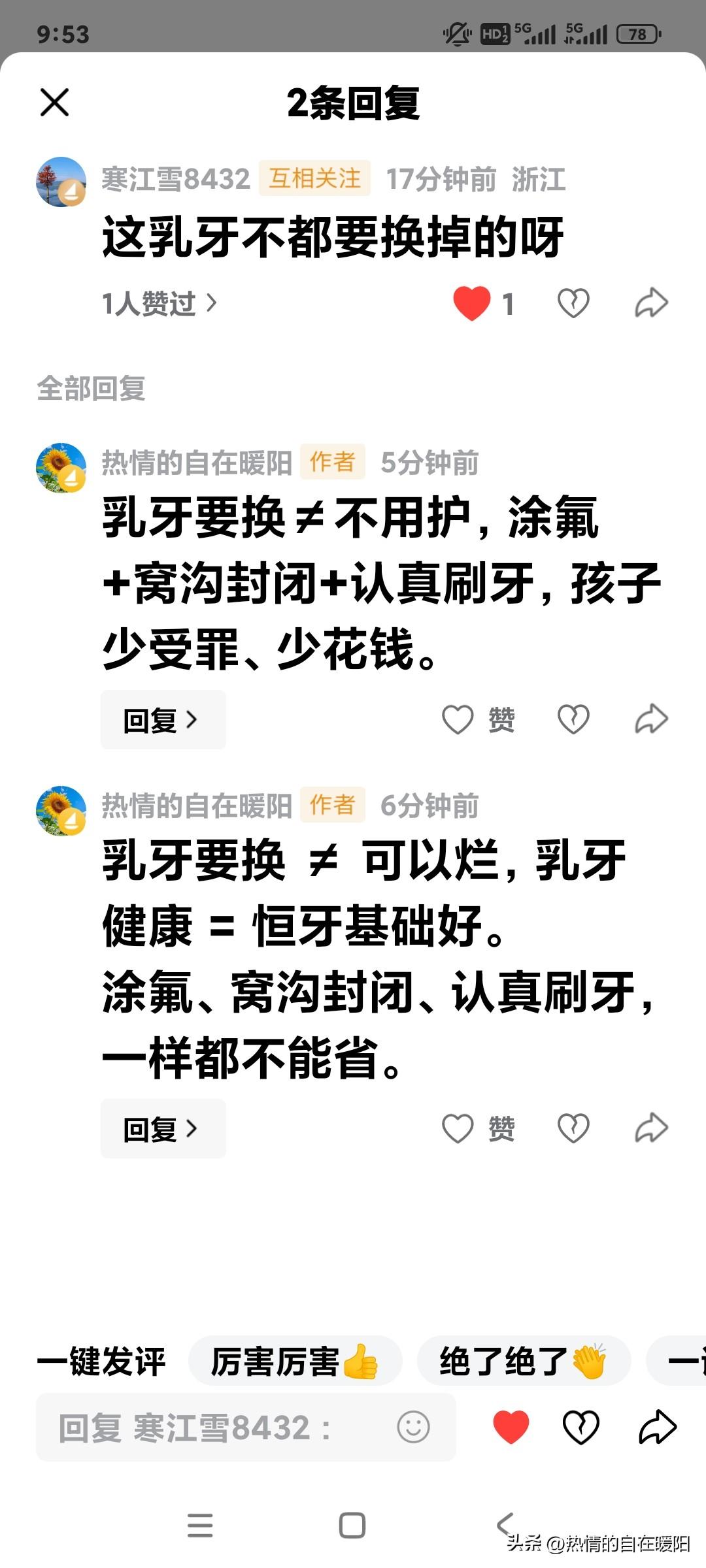 护牙无小事,乳牙也是牙。基础打牢,孩子受益一辈子! 昨天儿子儿媳带孙子去涂氟,我以前压根没听过这事儿,也不明白是干啥的。 有朋友评论说“这乳牙不都要换掉的呀”,我也觉得“乳牙反正要换,不用管它”。 没想到儿媳早做了功课,她说起来头头是道:乳牙要换可不意味着能让它烂,乳牙是恒牙的“地基”!乳牙蛀得厉害,会伤到下面的恒牙胚,以后新牙长歪、变色,孩子遭罪还花钱。 不由地想起,以前邻居家孩子,四五岁时好几颗“虫吃牙”,家长觉得换了牙就没事,没管。后来孩子整天牙疼得直哭,只能来石家庄看牙。医生说不管换不换牙,有蛀牙就得治。 听儿媳科普后,我总算知道刷牙、涂氟有多重要了。 好好刷牙、定期涂氟、做好窝沟封闭,别让“反正要换”的想法耽误孩子牙齿。 乳牙虽要换,护牙不能慢。 釉薄易蛀烂,疼得直冒汗。 涂氟加封闭,刷牙别偷懒。 恒牙根基稳,笑起来才好看!
