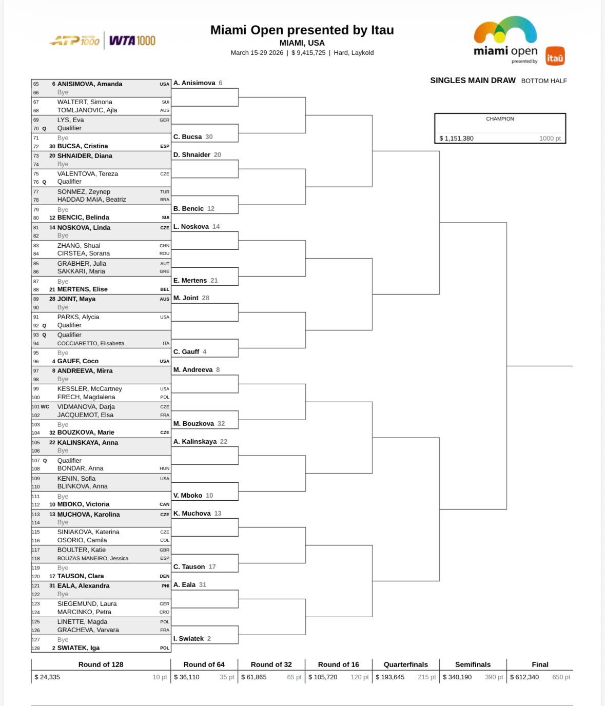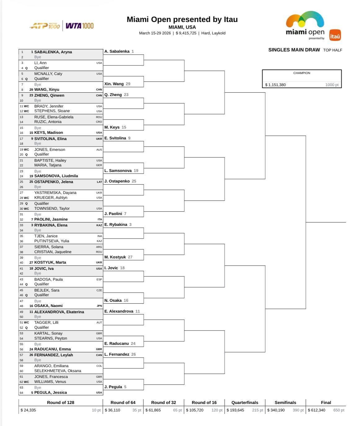2026WTA1000迈阿密站签表出炉,前八种子对位:萨巴伦卡 - 保利尼莱巴金娜 - 佩古拉阿尼西莫娃 - 高芙安德烈娃 - 斯瓦泰克