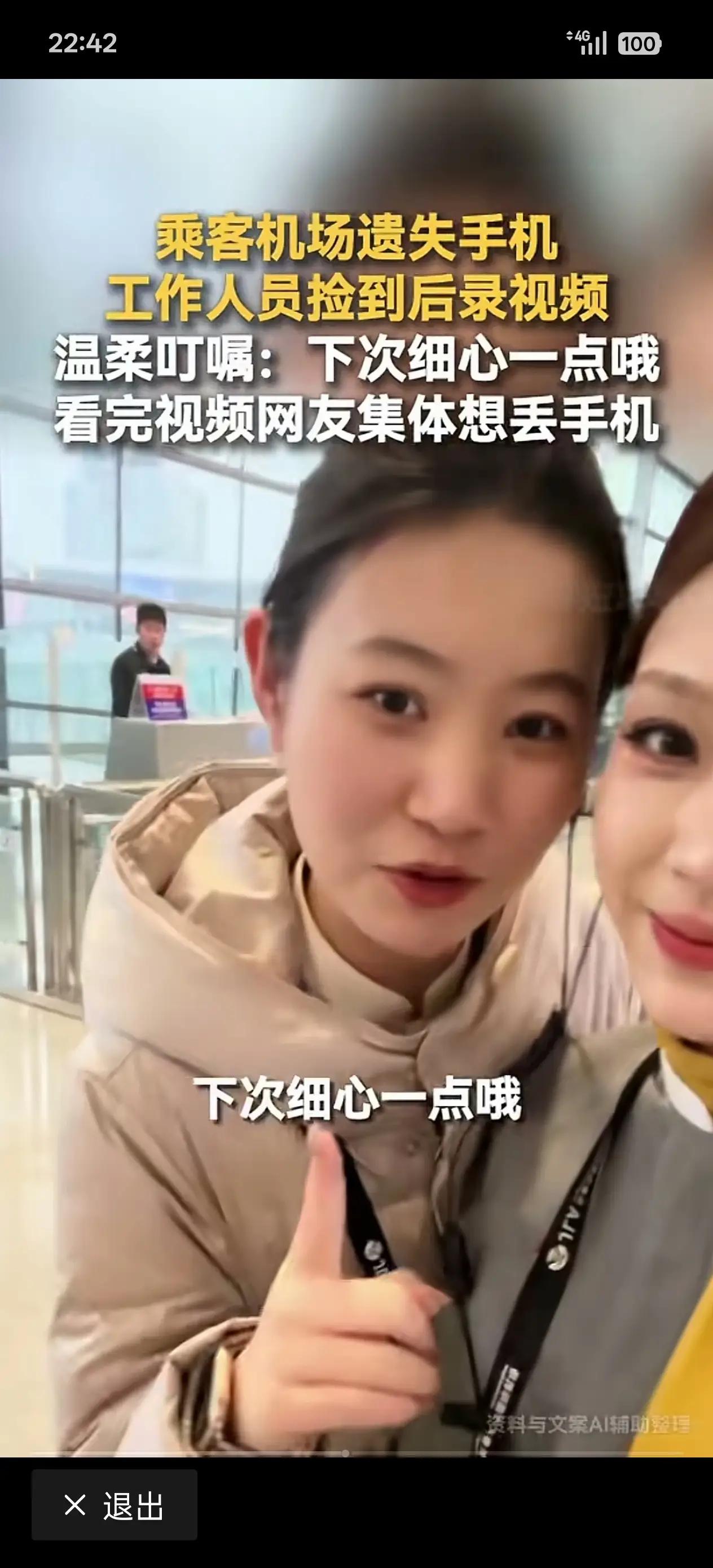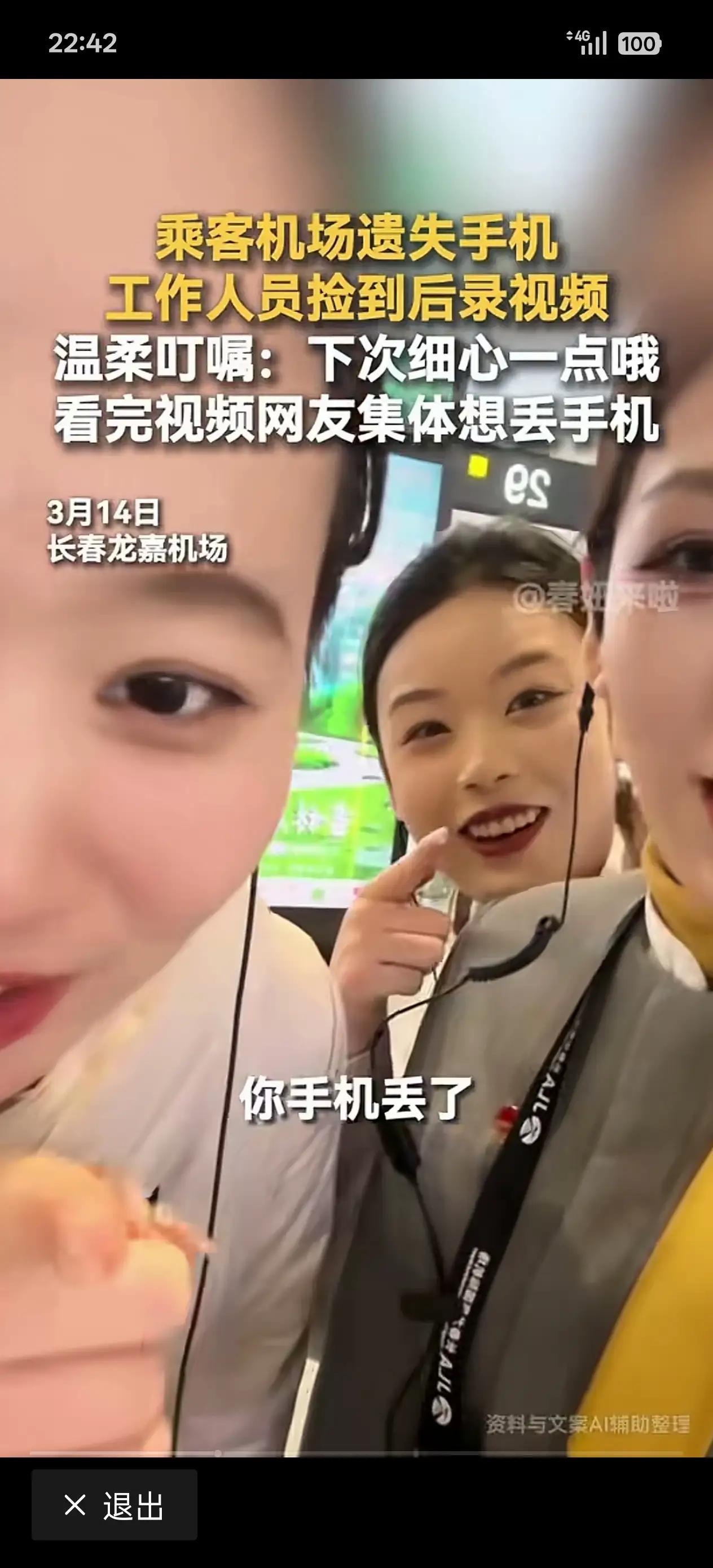 我的心都快被三位空姐给暖化了 好暖心呀,我最亲爱的,最美丽,最清纯的空姐们 我真心诚意祝们平安快乐,永远幸福,象无忧无虑的百灵鸟儿飞来飞去 长春一男子不小心把手机掉29号登机口 当他急得心慌意乱急团团转,通过几十分钟展转,在机场招领处千恩万谢领回手机后 当他急急忙忙打开手机,被捡手机三位美录了个视频视,嗳嗳的话语砸得小伙子心都要碎了 三个美女空轮翻露出脸,一人一句叮嘱,一个一个忠告:下次小心一点哟! 你手机丢了,给你放招领处了! 她们虽然年轻漂亮,办起事来就跟自己妈妈一样:出门小心一点,过马路要走斑马线! 别乱跑,注意安全,别把东两丢了 网友看到这视频集体炸毛:29号登机口在那儿,我也去想下手机[笑哭] 虽然这是调侃,但这一幕,真正体现了三位女神心中有太阳,把亿万网友都暖到了。 男子发视频,祝福三位心地善良空姐平平安安上班,平平安安回家 温暖的话语就这么向外传递,越传越远…