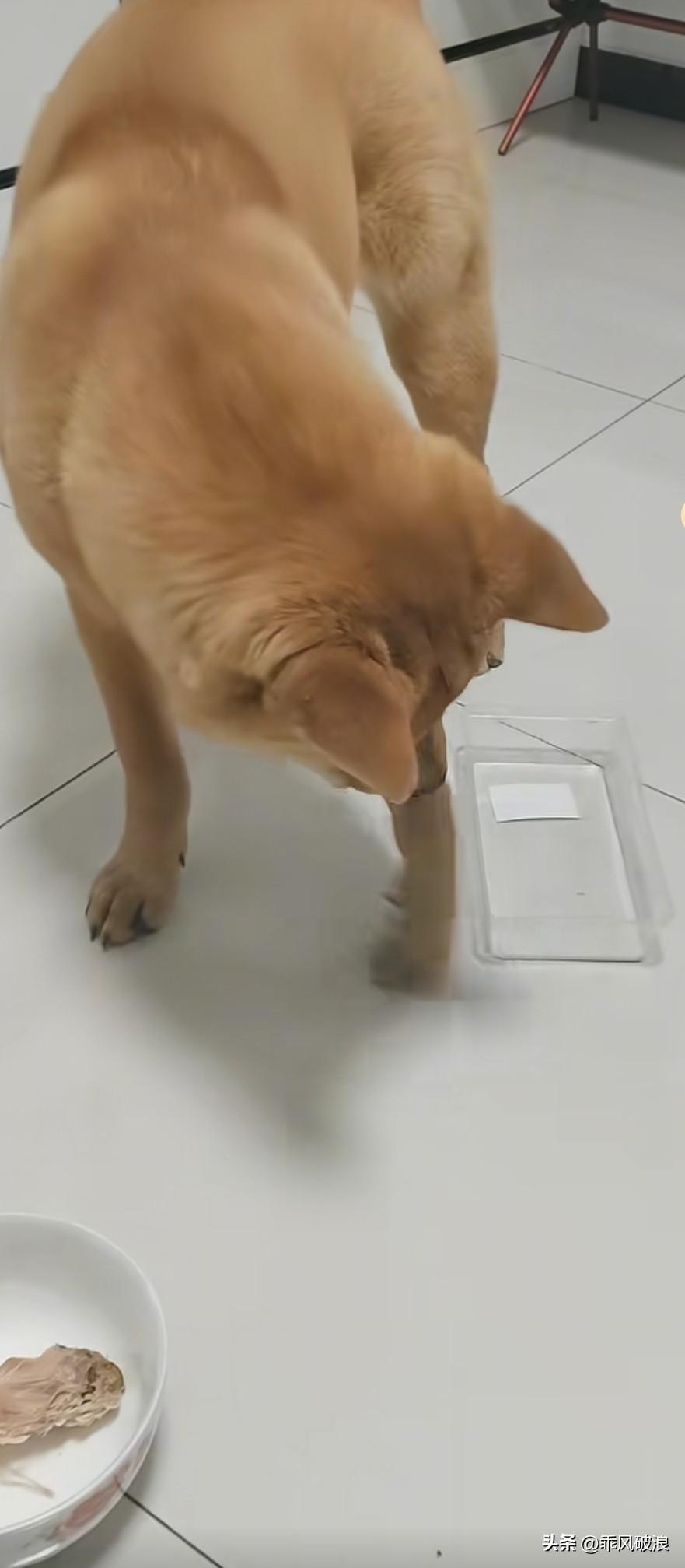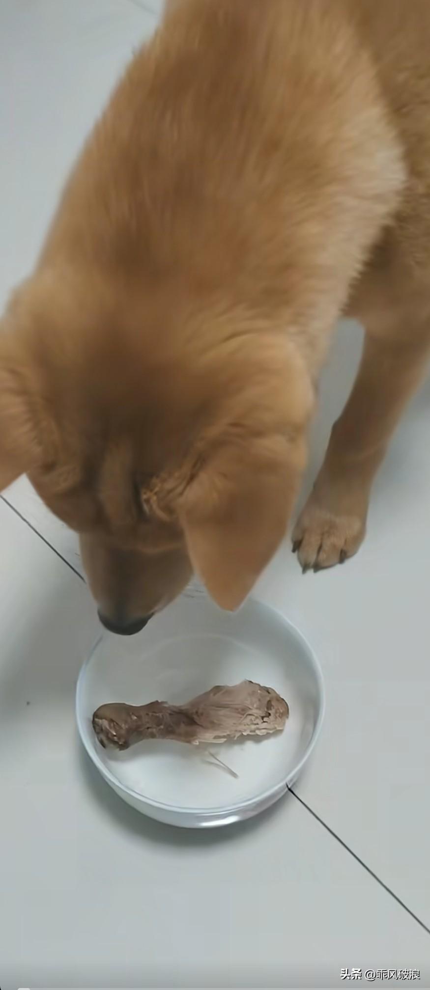把给生人准备的碗里的鸡腿拿到狗狗面前,示意它吃。狗狗不敢直接去叼,而是用脚轻点自己的盆碗,意思是让主人把鸡腿放到它的盆里,主次十分分明,这就是中华田园犬。主次分明的狗 带吃鸡腿