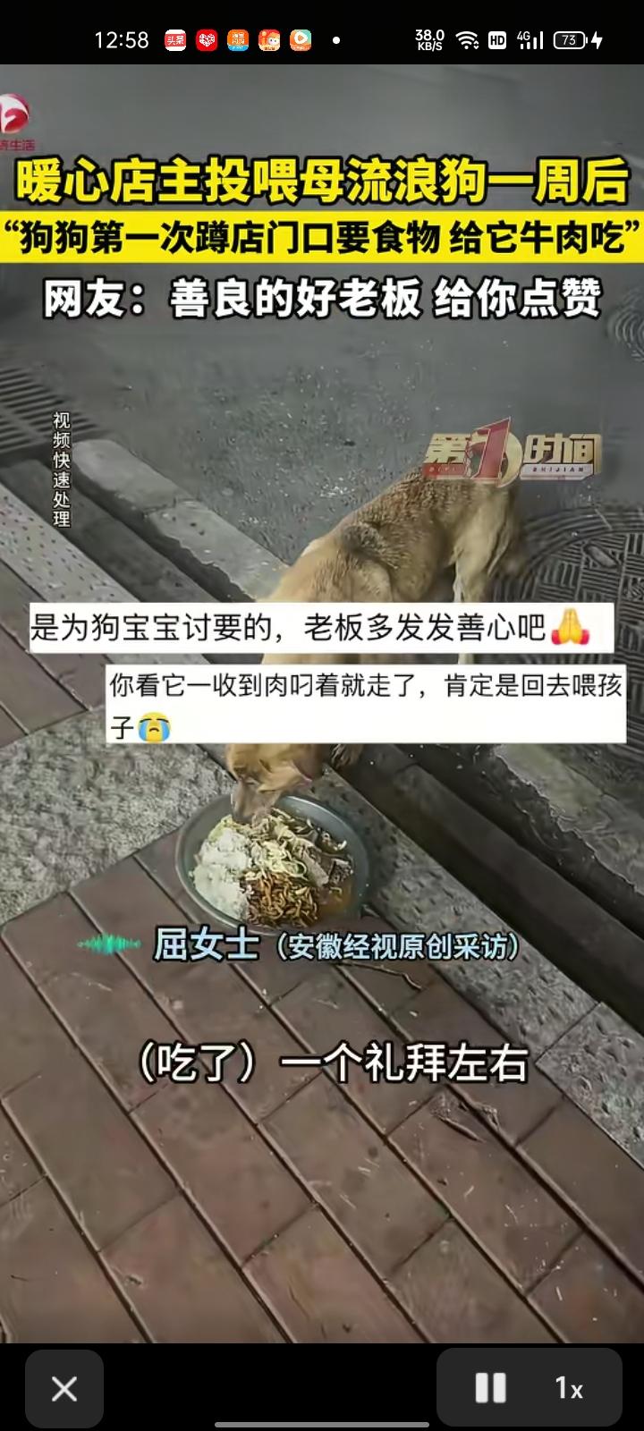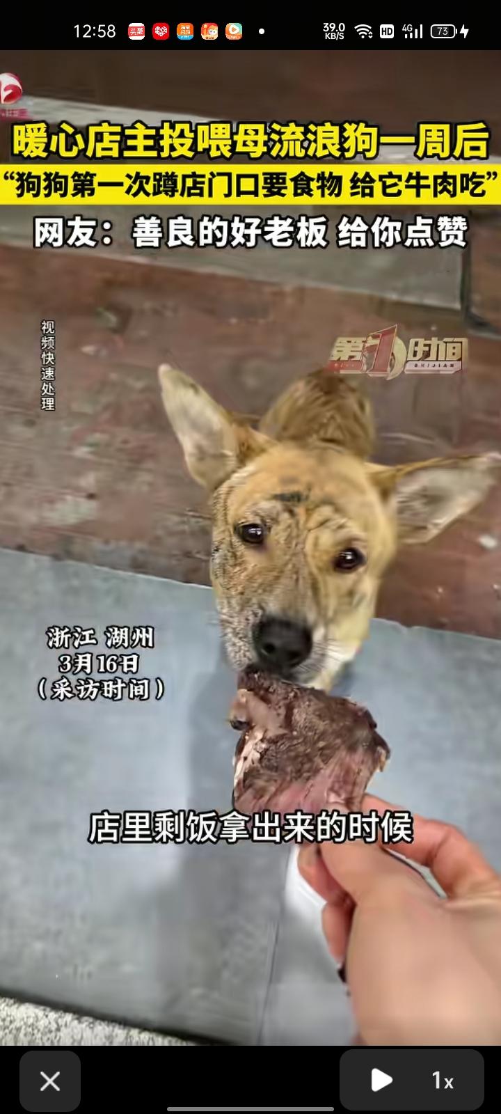 3月14日,浙江湖州。店主投喂母流浪狗一周后,它经常蹲在店门口要食物,给它牛肉吃。 店主屈女士称,狗狗每次叼到食物就走,她怀疑狗狗生了小狗,为此跟着狗狗查看具体情况,但它跑的太快没跟上,没找到它住在哪里。