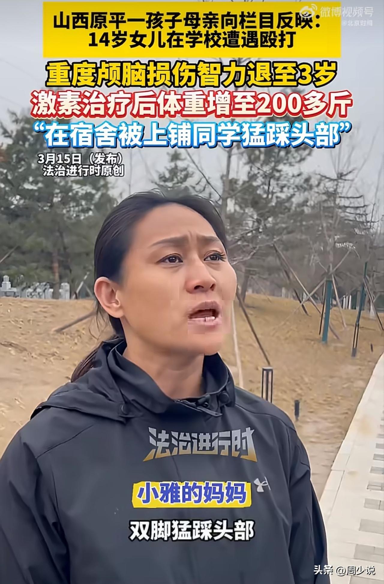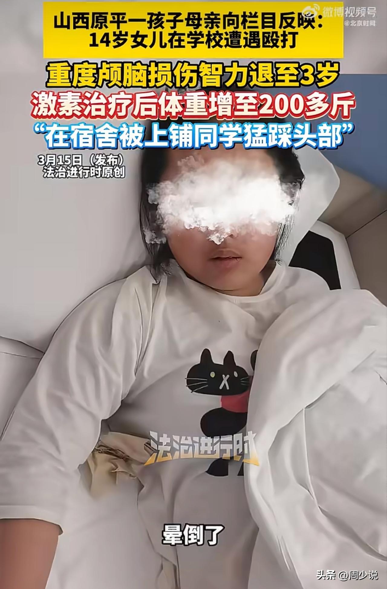 “必须严惩!”山西原平,一位母亲含泪控诉,女儿在寄宿学校惨遭上铺舍友多次猛踩头部,最终落下重度颅脑损伤,智力直接退回到3岁孩童水平,为了治疗不得不服用激素,体重更是暴增至200多斤。 更让人痛心的是,据悉这样的欺凌并非一时冲动,而是持续了不短的时间,可直到女孩身体撑不住被送医,这场暴力才被揭开。 此事曝光后,网友们瞬间炸了锅。有网友怒叹:“看着太心疼了,好好的孩子被折磨成这样,学校的监管到底去哪了?” 也有网友无奈表示:“校园霸凌真的太可怕了,有些孩子的恶意,远比我们想象的更伤人,偏偏受害者往往不敢反抗。” 看完这事,周少想说这类校园欺凌事件,从来都不是个例。不少孩子在宿舍、校园角落遭遇不公时,要么选择默默忍受,要么求助无门,而施暴者则在无人约束的情况下,一步步突破底线。 不得不说,这起悲剧里,学校的宿舍管理、日常安全教育,或多或少都存在疏漏,没能及时发现并制止欺凌行为,才让伤害不断升级。 从教育的角度来看,这起事件给所有家长和学校都敲响了警钟。对学校而言,不能只盯着孩子的学业成绩,更要筑牢校园安全的防线,宿舍查寝、心理疏导、反霸凌教育,每一环都不能敷衍了事。 对家长来说,平日里要多和孩子沟通,教会孩子保护自己,遇到欺凌第一时间寻求帮助,同时也要引导孩子懂得尊重他人,守住做人的底线。 校园本该是净土,不该有霸凌的立足之地。别再把孩子间的恶意打闹当成小事,每一次漠视,都可能埋下伤害的种子。#寻美三湘# #周少说教育# #寻美湖南#