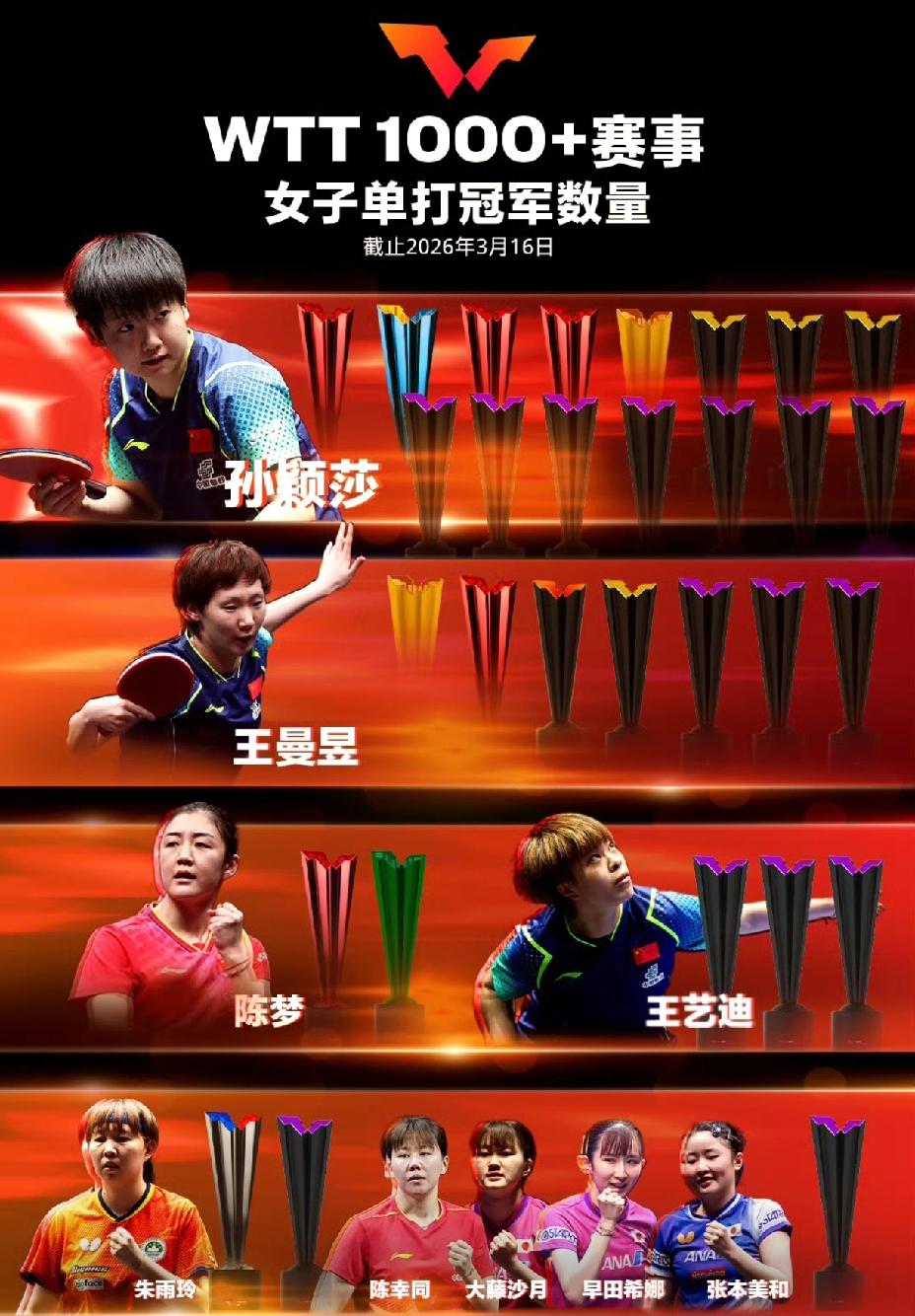 要说蒯曼不遗憾是假的, 她还没有拿到自己第一个单打冠军。 这次重庆冠军赛绝对是最好的机会, 莎莎、鳗鱼、同同、大迪都出局, 可惜她还是没有过张本美和这一关。 WTT世界乒联发布了单打冠军数量, 孙颖莎、王楚钦依然领跑冠军榜, 世界第一是一座座冠军奖杯堆砌出来的, 是他们自己一拍一拍打出来的。 女单张本美和也获得了, 她职业生涯第一冠军奖杯。 孙颖莎的冠军数是其它人冠军的总和, 所以说蒯曼怎么没有遗憾呢! 就连周雨直播都说女单决赛, 绝对不是蒯曼的真实水平, 或许是压力太大了。 (图片源自于网络)