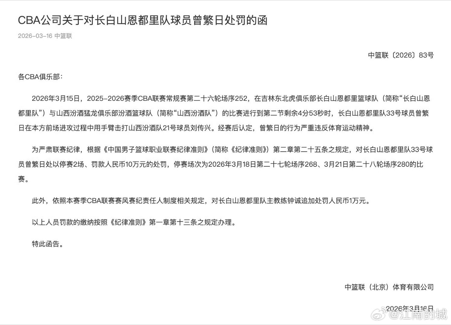 吉林队主教练钟诚罚款一万元。