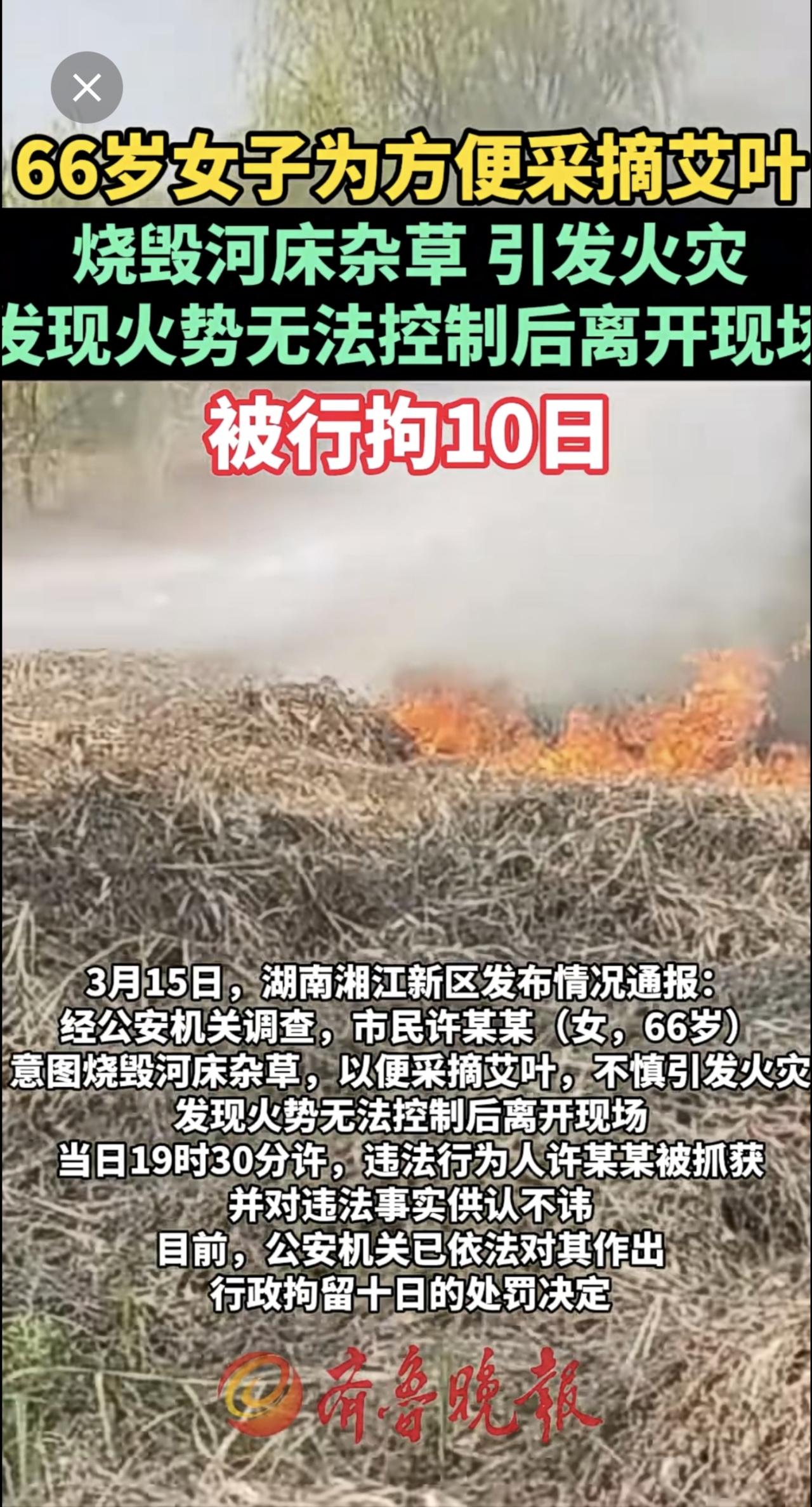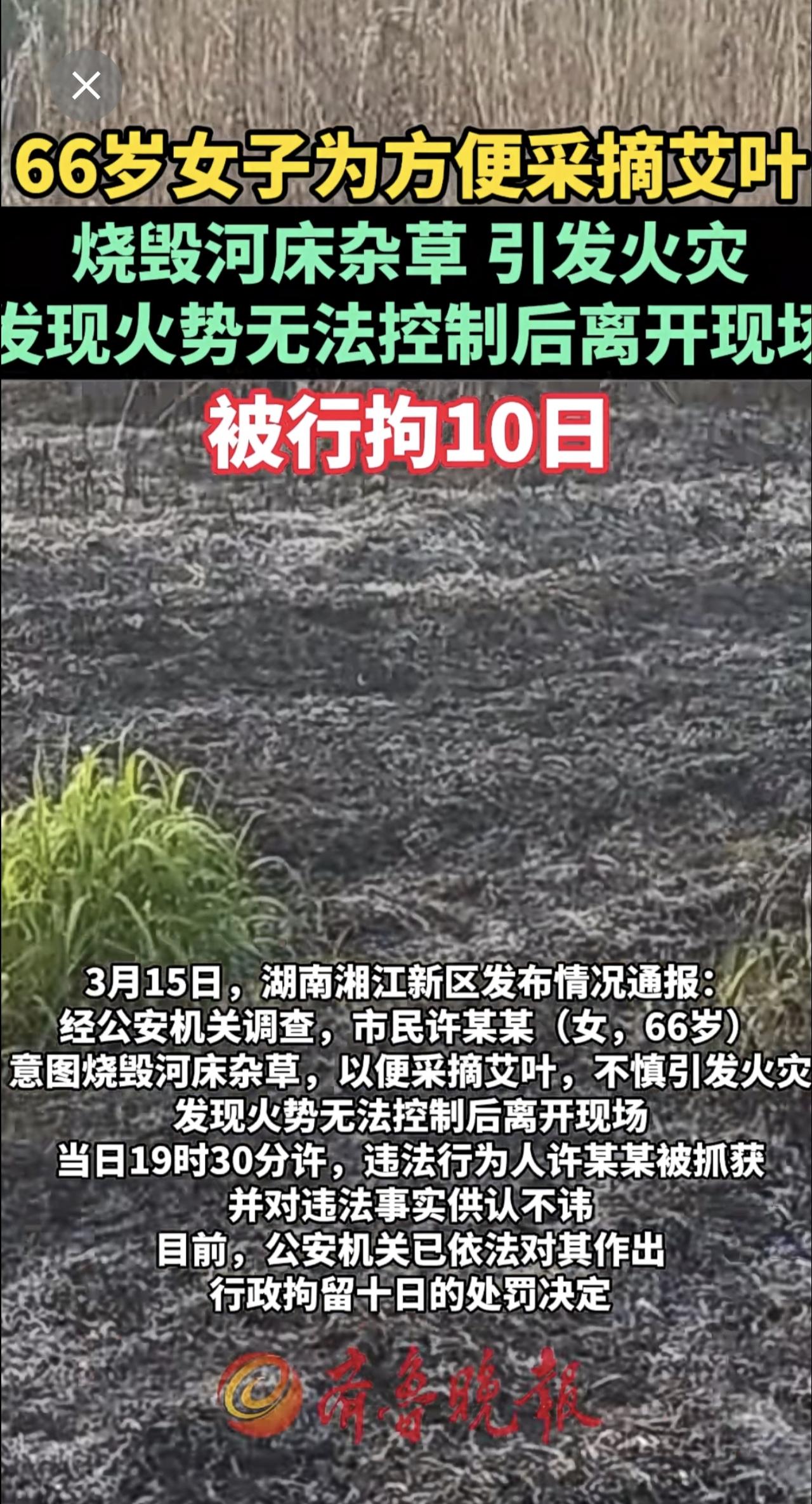 66岁女子为方便采摘艾叶,烧毁河床杂草引发火灾,被行拘10日