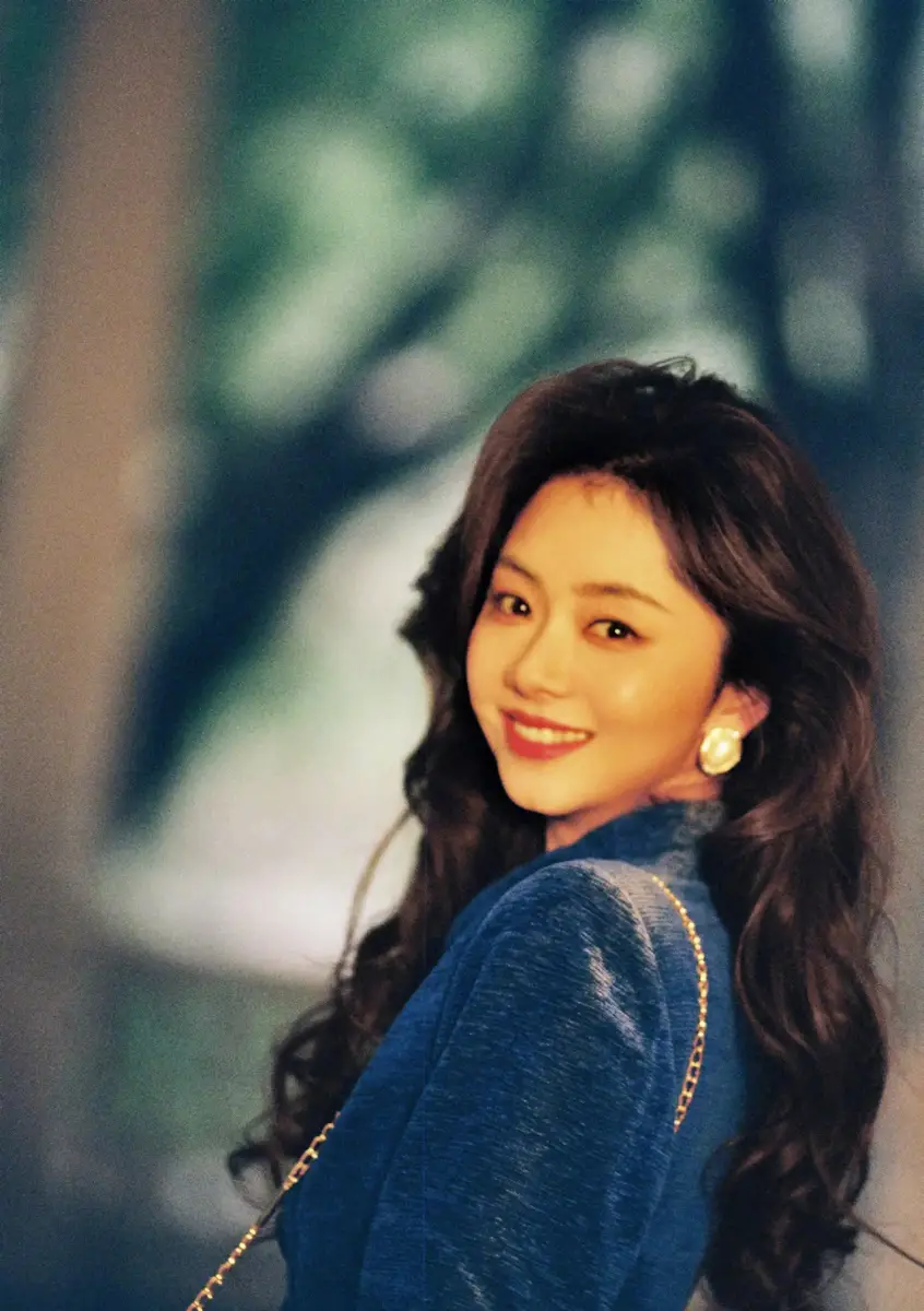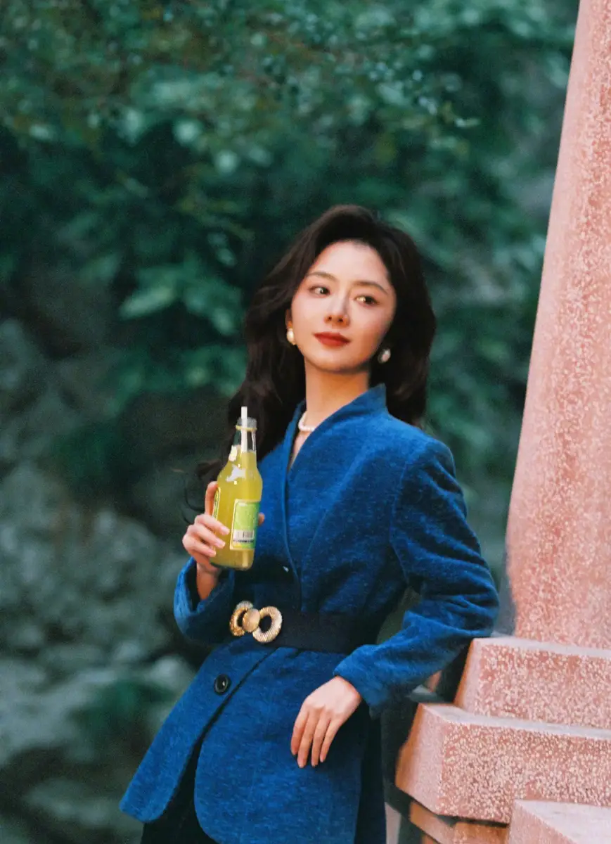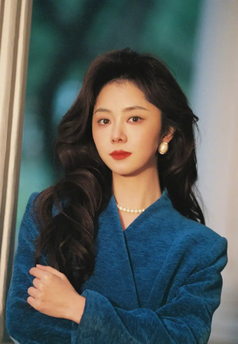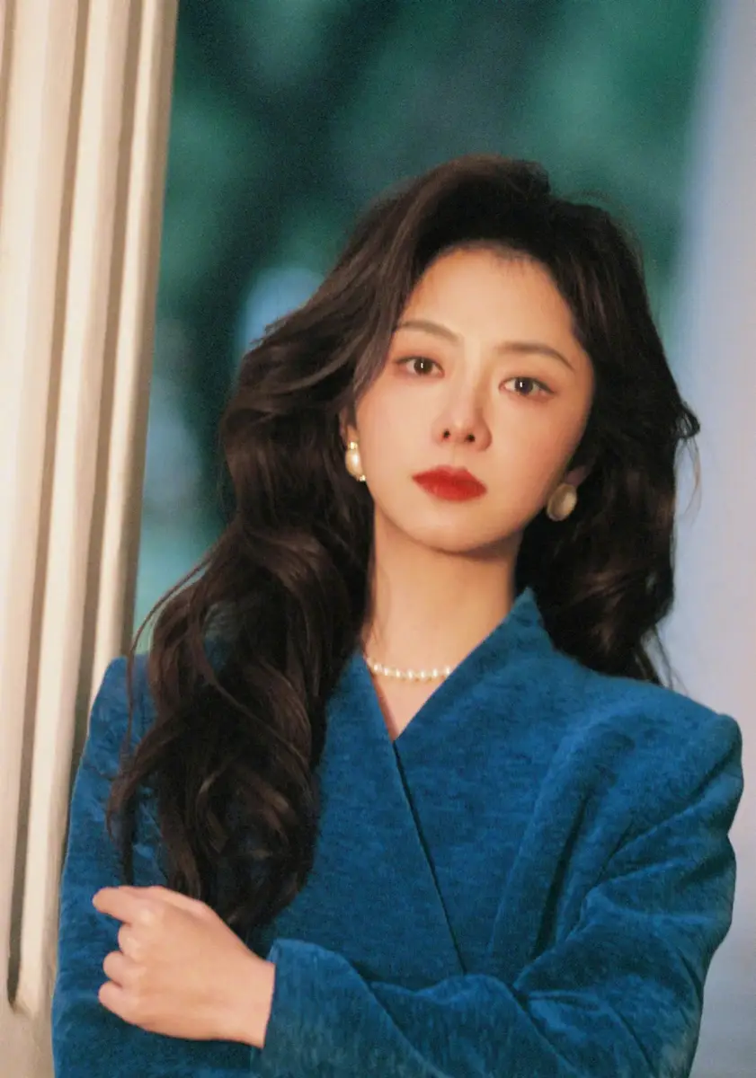 谭松韵穿蓝丝绒西装搭珍珠配饰温柔灵动 复古卷发尽显温婉港风韵味