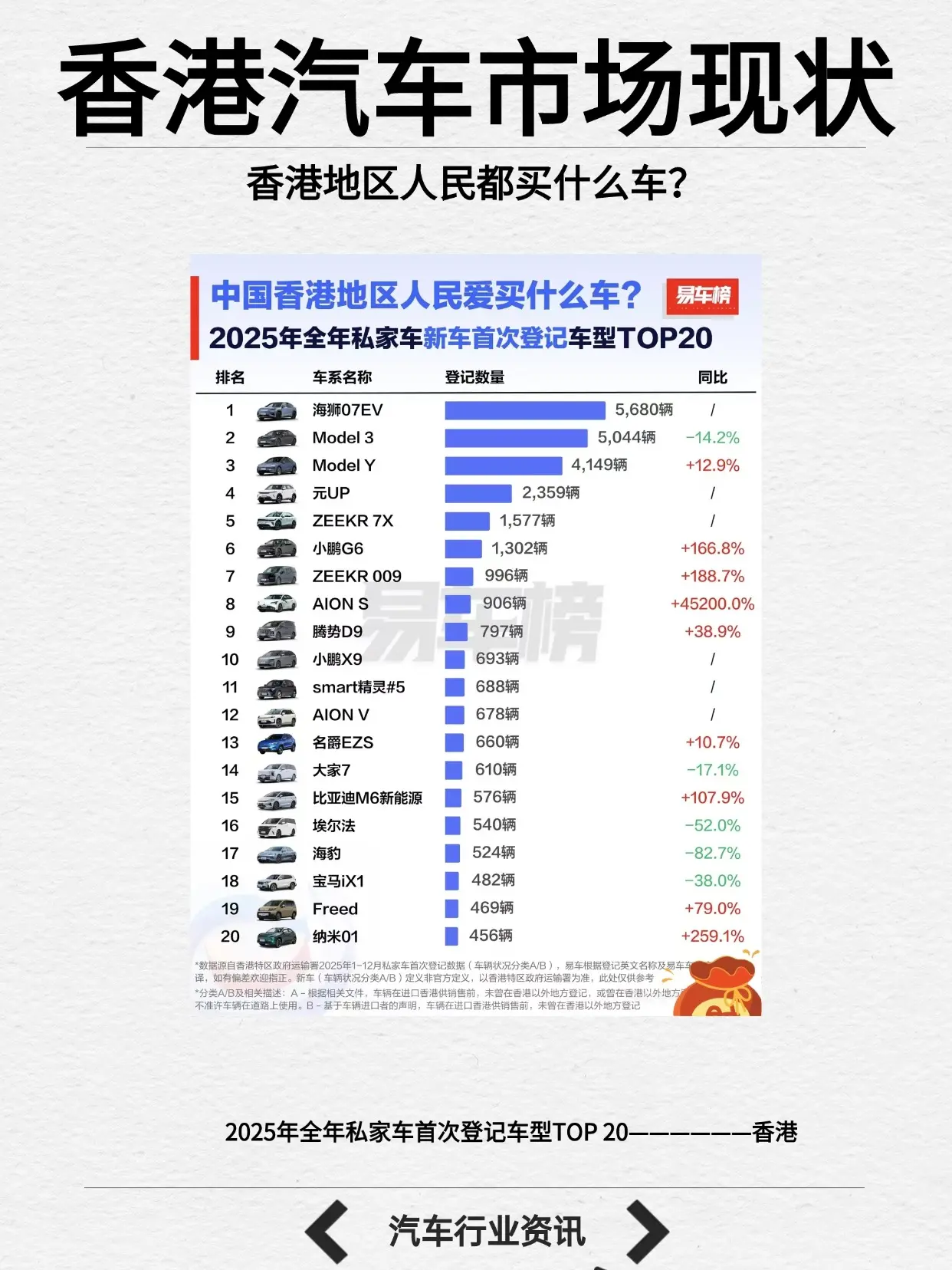根据数据显示,香港地区现在主流的汽车品牌大部分都是中国品牌。其中,比亚迪以9751辆的成绩成为2025年香港汽车市场全品牌销量冠军。