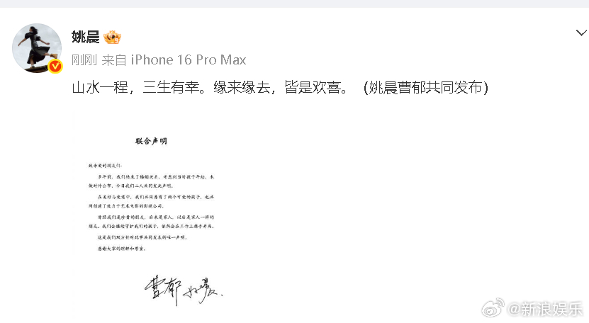 姚晨离婚姚晨曹郁离婚 刚刚,和曹郁发布联合声明官宣离婚:“多年前,我们结束了婚姻关系,考虑到当时孩子年幼,并未对外公布。”“曾经我们是珍贵的朋友,后来是家人,以后是家人一样的朋友。”据悉,两人2011年同返住所,恋情曝光,次年,两人在新西兰举行婚礼,婚后育有一儿一女。