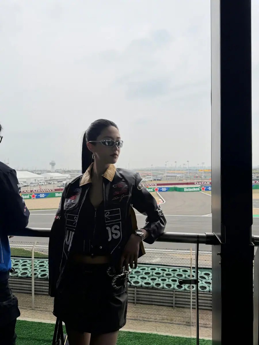向涵之穿皮夹克配窄框墨镜随性不羁 梳高马尾显酷飒利落