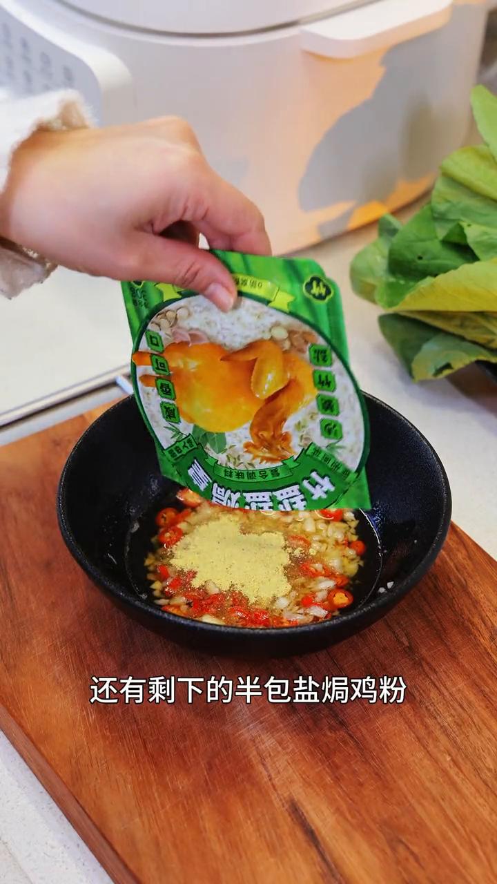 当你想吃鸡又不知道怎么做的时候,来试试今天这一道盐焗手撕鸡,吃起来是皮爽肉滑又咸香。 ·准备几个这种大鸡腿,用开水把表皮烫一下,让鸡皮更有口感,也能去腥。 ·再加上半包的盐焗鸡粉,还有两勺花生油,涂抹匀,腌制30分钟先入个底味。 ·然后先上锅蒸熟,水开了蒸20分钟左右。 ·这个时间来调一个酱汁,蒜蓉跟辣椒圈泼一下热油,再加上白糖跟芝麻油,还有剩下的半包盐焗鸡粉,拌匀就好了。 ·盐焗鸡粉我用的是这一个,它这里面加了有竹盐、沙姜,还有天然的栀子黄,做出来的鸡颜色就很金黄,而且味道也更加鲜甜。 ·鸡腿蒸熟了之后放凉,再撕成小块,加上酱汁、香菜,还有花生米,再来点熟芝麻捞匀。 一道正宗的客家盐焗风味手撕鸡就可以开吃啦。做法是不是一点也不难?不光好看,味道还很棒。鸡皮爽脆,鸡肉咸香又嫩滑,喜欢的朋友可以去试一下。 点赞、关注、收藏。