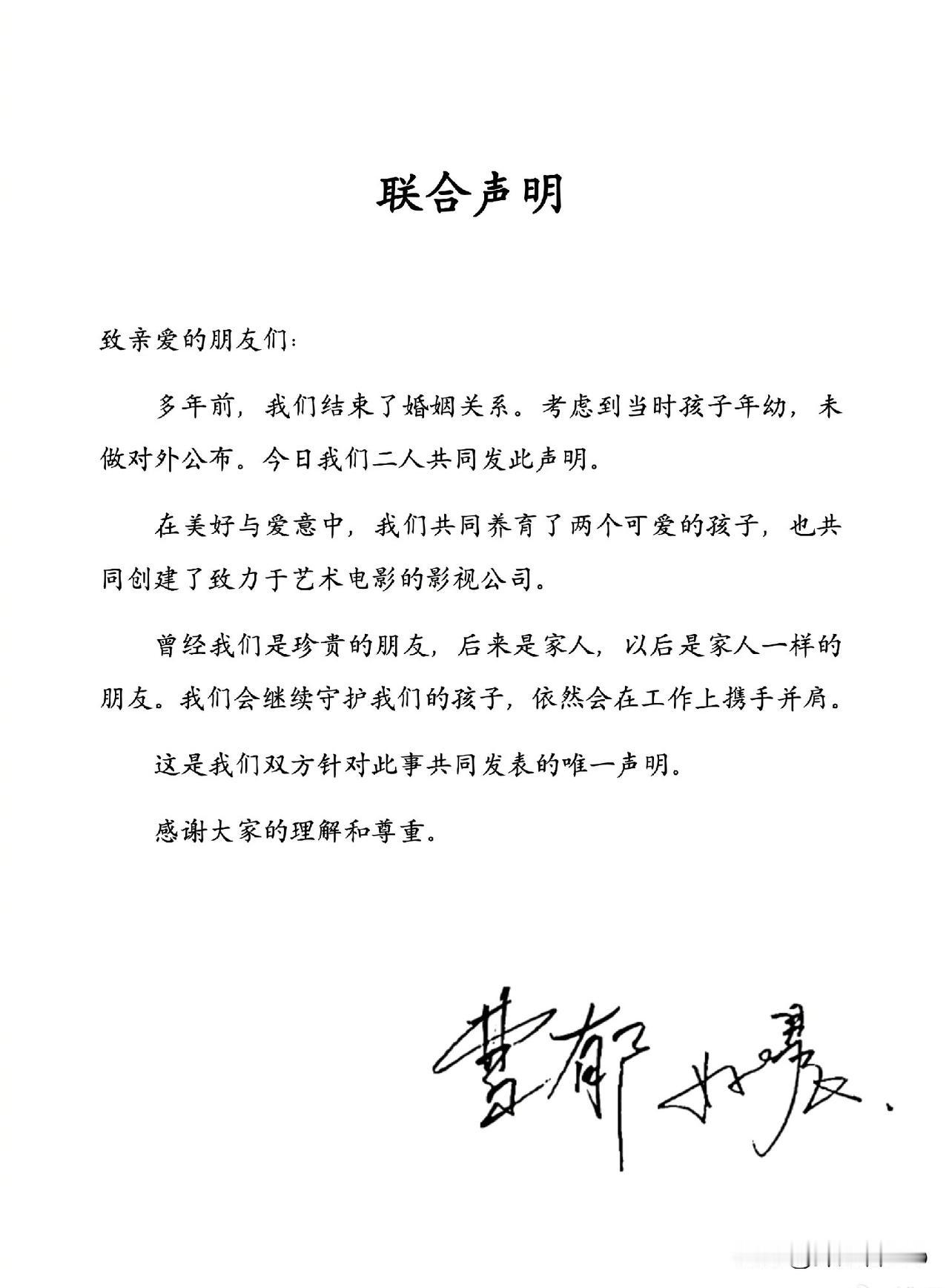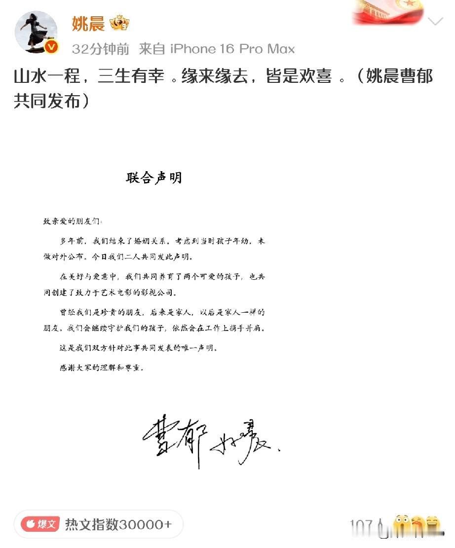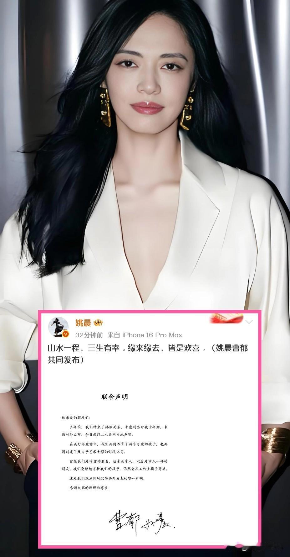 姚晨官宣离婚,发文:【山水一程,三生有幸。缘来缘去,皆是欢喜】 短短12字,结束13年婚姻,值得注意的是,括号里面的几个字:姚晨曹郁共同发布。 从这可以看出,二人是和平地好心分手,谁也没有为难谁,显得相当体面。 姚晨在声明中的配图中也说: 曾经我们是珍责的朋友,后来是家人,以后是家人一样的朋友。我们会继续守护我们的孩子,依然会在工作上携手并肩。 13年婚姻,婚后有一子一女,两人尽管走到尽头,没有撕破脸,选择好聚好散的体面方式离婚,相信应该也是他们夫妻二人通过努力修补感情后无法挽回的最好结局吧? (消息来源:姚晨个人微博账号)