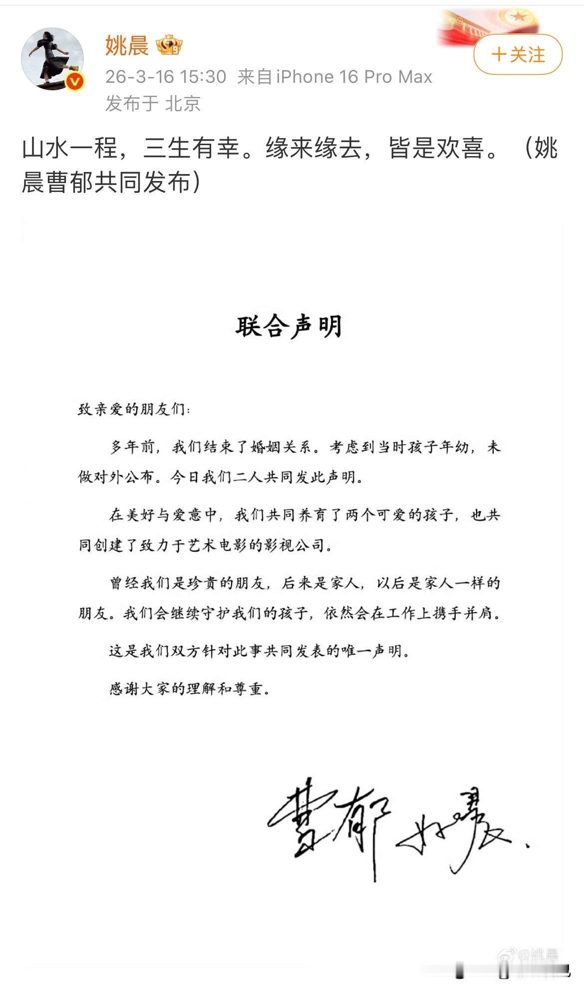 有种预感,姚晨恐怕再也遇不到像曹郁这般优秀的老公了。 曹郁毕业于北京电影学院摄影系,是科班出身,获奖无数,而且家世优越。 2011年,姚晨结束头婚,同年在拍戏时与曹郁相识相恋,次年便领证再婚。可以说,曹郁陪伴姚晨走过了那段艰难岁月。 2013年7月,他们的长子降生,乳名小土豆,大名曹睦然。2016年11月,女儿小茉莉出生,自此二人儿女双全,凑成一个“好”字。 如今,315打假刚过一天,姚晨就官宣与曹郁已离婚多年。这无疑是娱乐圈又一个大瓜。姚晨发文称:缘来缘去,皆是欢喜! 47岁的女演员,育有两个孩子,又赶上影视行业寒冬,姚晨这次离婚实在不明智啊!