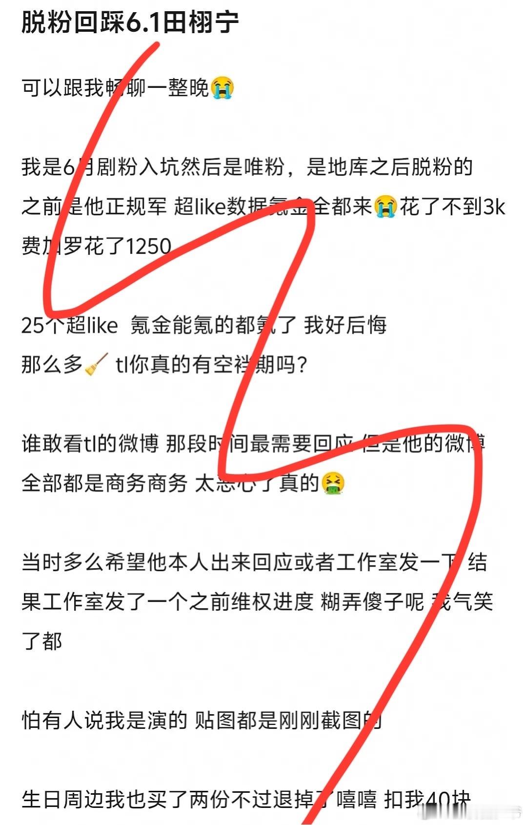 田栩宁粉丝现状,目前已知脱粉回踩:音乐节坐地起价的事洗了三天的时间,称自己好后悔,质问田栩宁真的有空档期吗?