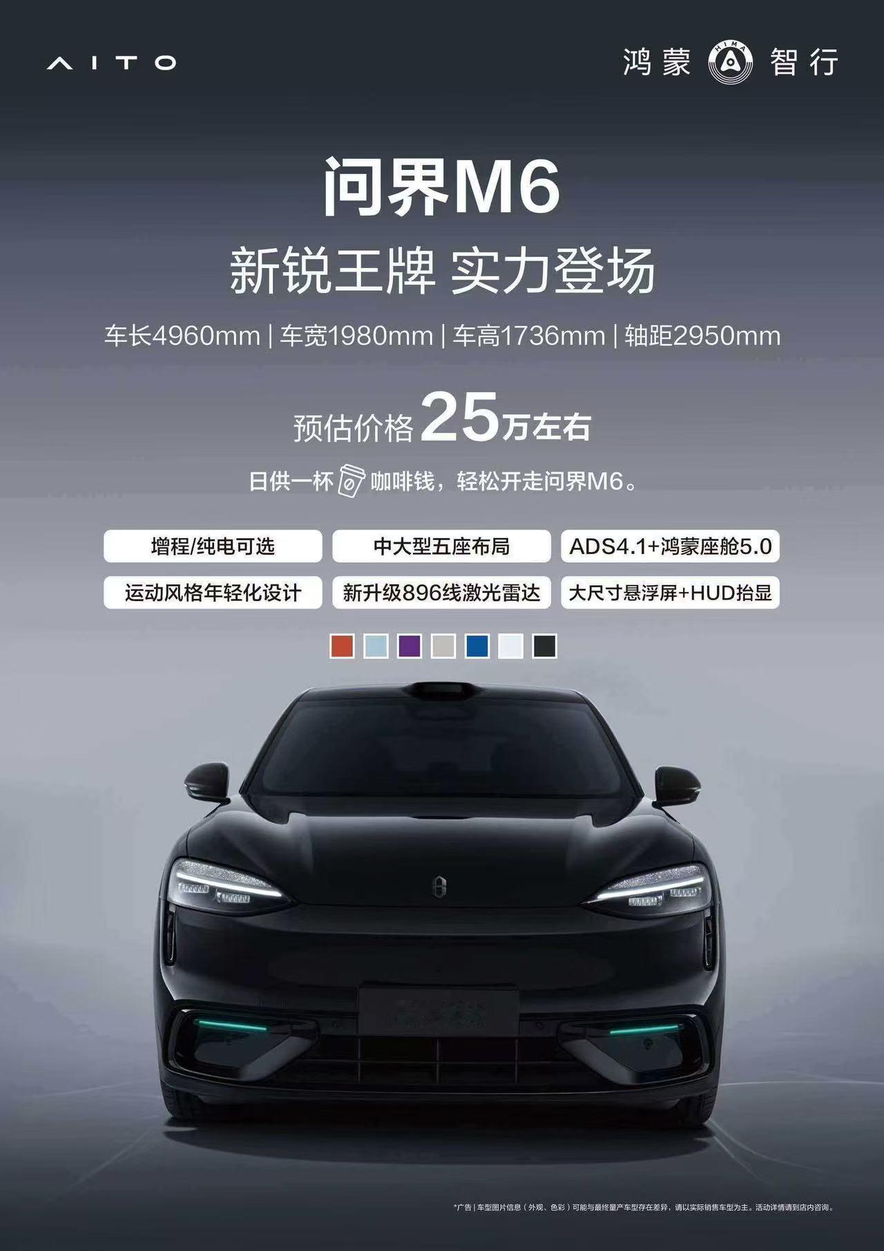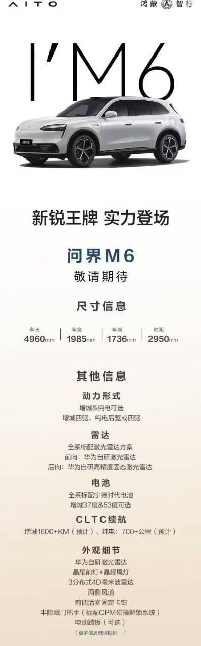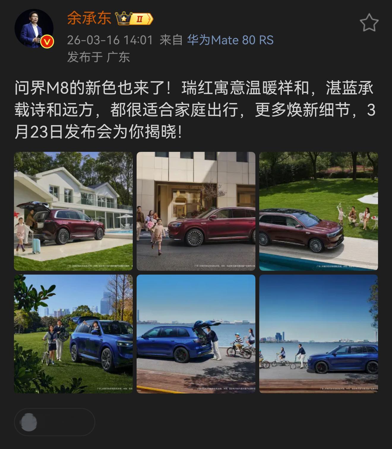 问界M8这次发布会也会有新颜色,红色和蓝色,问界M6也会发布,等于问界M876都更新了,不知道会不会升级最新的896线激光雷达,我觉得应该会,因为问界M6都用上了,M7和M8没有不用的道理,估计价格会贵一万元。