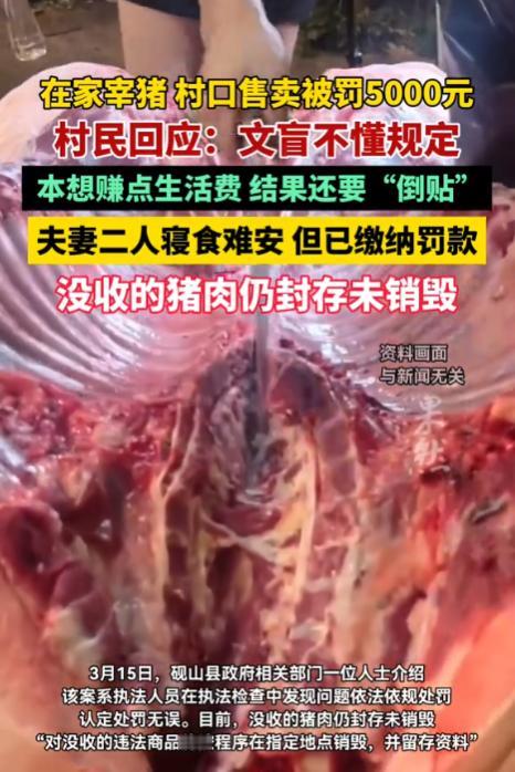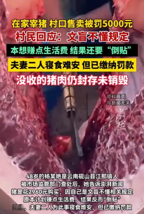 云南砚山,一女子为了换点钱补贴家用,从生猪市场买了头猪在家中宰杀,然后拿着358市斤的鲜猪肉以每市斤10.5元的均价去卖,结果被执法人员发现鲜猪肉没有检疫标志。之后这300多市斤的猪肉被没收,女子也被罚款5000元。由于女子拿不出那么多钱,只能找姐夫借了5000元缴纳了罚款。 据悉,杨女士与丈夫婚后育有两个儿子,大儿子已经20多岁了,一直在外地打工。小儿子18岁,但心脏不好,所以一直在家待着。杨女士的丈夫也体弱多病,只能在家种地。所以这一家人过得十分的苦,全靠杨女士一人撑着。 20256年1月12日,杨女士打算去买头猪宰了换点钱补贴家用,于是就去生猪市场以2960元买了头近400市斤的生猪。 1月13日一大早,杨女士就开始烧水杀猪,手脚非常麻利,一看就是能吃苦干活的。 在杀完猪后,杨女士留了16市斤的猪肉,其他358.8市斤的猪肉都被她拉倒了村口的摊位上进行销售,均价在10.5万元/市斤。 谁知这肉一块都还没卖出去,就被闻讯赶来的执法人员给制止了。执法人员要求杨女士出具检疫报告以及肉质合格证,可杨女士哪里能拿的出这些。 就这样,杨女士的生猪肉全被没收了。执法人员估算了下,这些生猪肉大概能值个3767.4元。 在执法期间,杨女士讲述了自家的家庭情况,希望执法部门能网开一面。 执法人员上门核实了情况,发现杨女士家确实比较困难,可杨女士的行为毕竟违法了,所以执法部门仅对杨女士作出了5000元的罚款。 《食品安全法》第123条第4项规定,经营未按规定进行检疫或者检疫不合格的肉类,或者生产经营未经检验或者检验不合格的肉类制品,尚不构成犯罪的,由县级以上人民政府食品安全监督管理部门没收违法所得和违法生产经营的食品,并可以没收用于违法生产经营的工具、设备、原料等物品;违法生产经营的食品货值金额不足1万元的,并处10万元以上15万元以下罚款;货值金额1万元以上的,并处货值金额15倍以上30倍以下罚款。 如果严格按照法律规定来处理,杨女士所销售的猪肉的总价值不满1万元,所以最低应该处10万元罚款。可现在执法部门只对杨女士处以5000元罚款,的确已经非常轻了。 的那即便如此,杨女士也没钱缴纳罚款。但杨女士为人忠实,她不想背着个违法的名头,所以就去找姐夫借了5000元缴纳了罚款。 然而杨女士缴纳完罚款后,打算向执法部门要回猪肉,却遭到了拒绝。这可把杨女士气坏了,在网上发布视频称执法部门收了罚款,却不退还猪肉。 3月13日,杨女士就接到了执法部门的电话,称他们是依法依规办事的。 对于罚款结束后,是否要退还猪肉,《食品安全法》第123条其实已经明确规定,是可以没收猪肉的。 目前,这些猪肉仍在封存中,尚未销毁。 有人认为,这都已经过去2个月了,为什么还在封存没有销毁?是不是要留着分分? 还有人认为,初次违法可以不予处罚,5000元的处罚太重了,又没出事。 其实任何的违法行为要真的等到出现了违法结果后再去处理,那就已经晚了。 法律的制定就是为了预防违法犯罪,而不是给违法犯罪擦屁股的。 如果那头生猪身上真的携带病毒,并导致传染了,这个后果谁来承担?杨女士家没钱赔不起,受害人就要自认倒霉吗?侥幸心理可以有,但不能把侥幸看成常态。 本此事件中,杨女士如果买了生猪自己家里人吃,这是不违法的,但要是经营赚钱卖给他人,那这猪肉就必须经过检疫。 因此,法律是不是针对杨女士,而是针对经营这个行为。 如果因为杨女士的家庭困难就不处罚,那违法团伙找家庭困难的人帮忙售卖未经检疫的猪肉,是不是就可以逃避法律的制裁了? 用句通俗的话来讲,在面对杨女士这种家庭情况时,执法部门仍坚持罚款,其实有种“杀鸡儆猴”的效果,可以阻止一部分动了歪脑筋但还在默默观望的人。 至于那些被没收的猪肉什么时候销毁,法律上并没有明确规定。 一般来说,对于未经检疫的肉类是采用集中销毁的方式,所以基本上不会出现没收了未经检疫的肉品后立马销毁的情况。 为了确保未经检疫的肉类能销毁,执法人员需要对销毁的过程全程记录,并填写相关表单。 也就是说,销毁的记录都是有据可查的,不太可能出现执法人员拿这些肉分分的情况。 最后,杨女士在家庭困难的情况下,还被罚了5000元,这的确令人唏嘘。但法律底线不可逾越,食品安全关乎千家万户,不能因个人困境就纵容违法。为了防止类似事件再发生,相关部门应加强农村普法宣传,在偏远地区完善检疫服务,降低农户合规成本。唯有兼顾法理刚性与民生温情,才能既守护好群众餐桌安全。 对于此事,大家怎么看?认为该不该罚这5000元?欢迎留言交流。