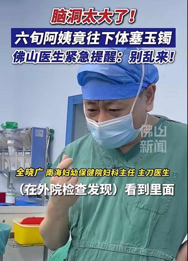 脑洞大开!广东佛山,一名65岁阿姨因为“阴道异物”去医院检查,结果医生检查时发现,里面竟然有一个玉镯,原来,阿姨此前把玉镯当成了子宫托,结果拿不出来了 广东佛山一名65岁的阿姨,最近因为身体不舒服去医院检查,她不好意思明说具体情况,只跟医生说自己阴道里有异物,取不出来了。 医生听完后,就给她做了专业的妇科检查,这一查可把医生们都惊到了,阿姨的阴道里竟然藏着一只玉镯,而且已经放了好几年,被阴道黏膜紧紧包裹着,边缘还有点开裂,周围的黏膜也变得充血、增厚。 医生追问之下,阿姨才红着脸说出了实情,原来,几年前阿姨去医院检查,被查出有子宫脱垂的问题,医生告诉她,这种情况可以用子宫托来缓解,还给她开了专业的子宫托,反复叮嘱她,子宫托需要定期取出来清洗消毒,还要每三到六个月去医院复查一次,这样才能避免感染,也能保证使用效果。 可阿姨回家用了一段时间后,觉得特别麻烦,每天清洗消毒不说,还要记着定期去医院,她本身就比较节俭,也怕麻烦别人,就慢慢不想用了。 后来,阿姨偶然看到自己首饰盒里的玉镯,那是她年轻时戴的,圆溜溜的,大小看着和医生给的子宫托差不多。 她心想,玉镯看着干净又光滑,质地也硬挺,应该能代替子宫托,而且不用每天清洗,也不用去医院复查,省了不少事。 于是,阿姨就自己动手,把玉镯慢慢塞进了阴道里,当成子宫托来用。刚开始的时候,她没觉得有什么不舒服,反而觉得这样既方便又省钱,心里还暗自得意自己找对了 “好办法”。 可她不知道,玉镯根本不能代替子宫托,专业的子宫托是用医用硅胶或塑料做的,质地柔软,大小和形状都是医生根据每个人的阴道长度、宽度和脱垂程度量身选择的,能刚好托住子宫,还不会伤害阴道黏膜,而且可以灵活取放,方便清洗消毒。 而玉镯是石头做的,质地坚硬,没有一点弹性,大小也不是为阴道设计的,塞进阴道后,会一直摩擦、压迫阴道黏膜,时间长了,黏膜就会充血、糜烂,甚至粘连。 而且玉镯表面看着光滑,其实有很多细小的缝隙,容易藏细菌,长期放在阴道里,细菌会大量滋生,引发阴道炎、宫颈炎,严重的还会感染到盆腔,带来更大的麻烦。 阿姨把玉镯放进去后,一开始没什么明显的不适,就一直没管它,这一放就是好几年。 直到最近,她开始觉得下身坠胀、疼痛,还有异常的分泌物,排尿也变得不顺畅,有时候还会觉得肚子疼,实在扛不住了,才不得不去医院就诊,刚开始她还不好意思说玉镯的事,只说有异物,直到医生检查发现后,才说出了自己用玉镯代替子宫托的经过。 医生知道实情后,没有批评阿姨,而是先给她做了详细的检查,确认玉镯没有划伤阴道和子宫,也没有引发严重的感染,才小心翼翼地用专业的无菌器械,先对阴道进行消毒和润滑,然后慢慢将玉镯取了出来。 取出的玉镯已经有些开裂,表面还附着着分泌物,看着十分吓人,医生告诉阿姨,幸好她就医及时,如果再拖下去,玉镯可能会完全嵌进黏膜里,甚至破碎,锋利的碎片会划伤阴道和子宫,引发大出血或严重感染,后果不堪设想。 之后,医生给阿姨开了抗炎的药物,叮嘱她按时用药,注意下身清洁,不要再用任何东西代替子宫托,还重新给她配了合适的子宫托,耐心教她怎么正确放置、取出和清洗,告诉她一定要定期来医院复查,不能再图省事、瞎琢磨了。 阿姨听了医生的话,十分后悔,说自己当初太糊涂,以为能省点事,没想到差点害了自己。 其实,像这位阿姨这样的情况,在老年人中并不少见,很多老年人因为对医疗知识不了解,又怕麻烦、爱节俭,就会自作主张,用身边的东西代替专业的医疗器械,殊不知这样做非常危险。 子宫托是治疗子宫脱垂的专业工具,必须在医生的指导下使用,不能随便替换,任何看似合适的替代品,都可能对身体造成伤害。 阿姨的经历也提醒大家,不管身体出现什么问题,都要听医生的话,不要自己瞎尝试、瞎琢磨,尤其是涉及到医疗器械,一定要专业使用,定期复查,有不舒服就及时就医,千万不能因为害羞、嫌麻烦就硬扛,不然最后只会遭更多罪,花更多的钱,得不偿失。